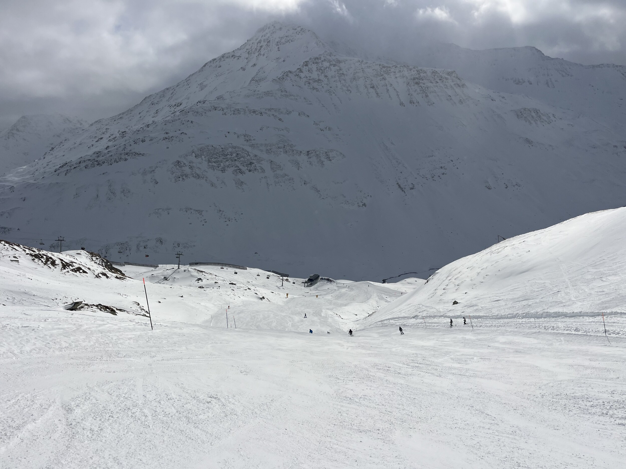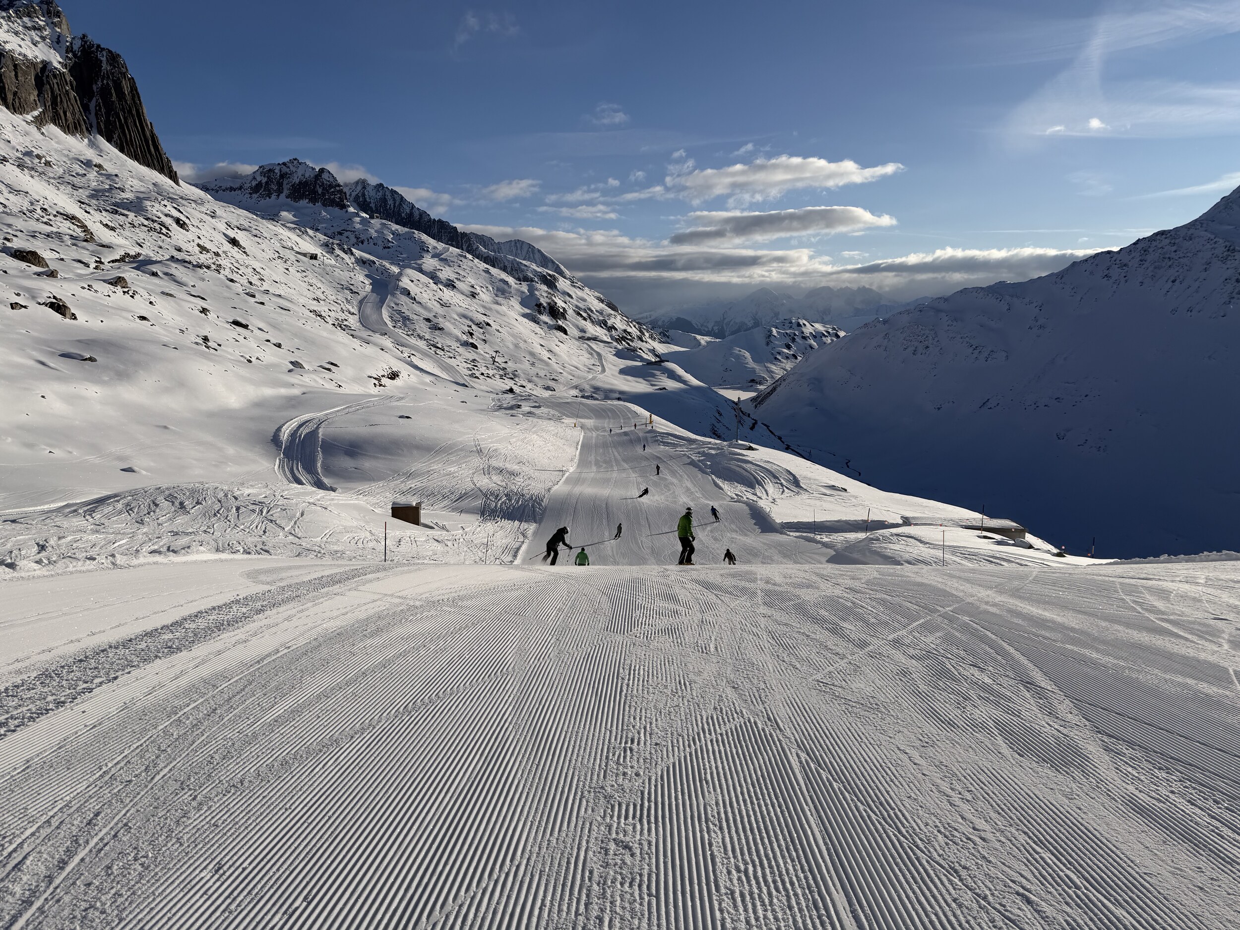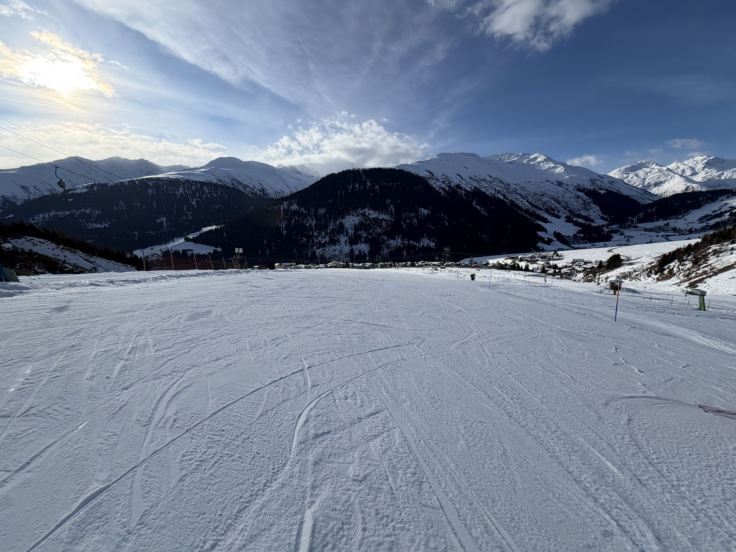 Die „Panoramapiste“ respektive Passstrasse finde ich eigentlich ziemlich schön, besonders am Abend gemütlich in den Sonnenuntergang hinabkurven. Ich nehme an aufgrund des Neuschnees war die Piste nicht so schnell, denn normalerweise ist das Gefälle überall ausreichend.