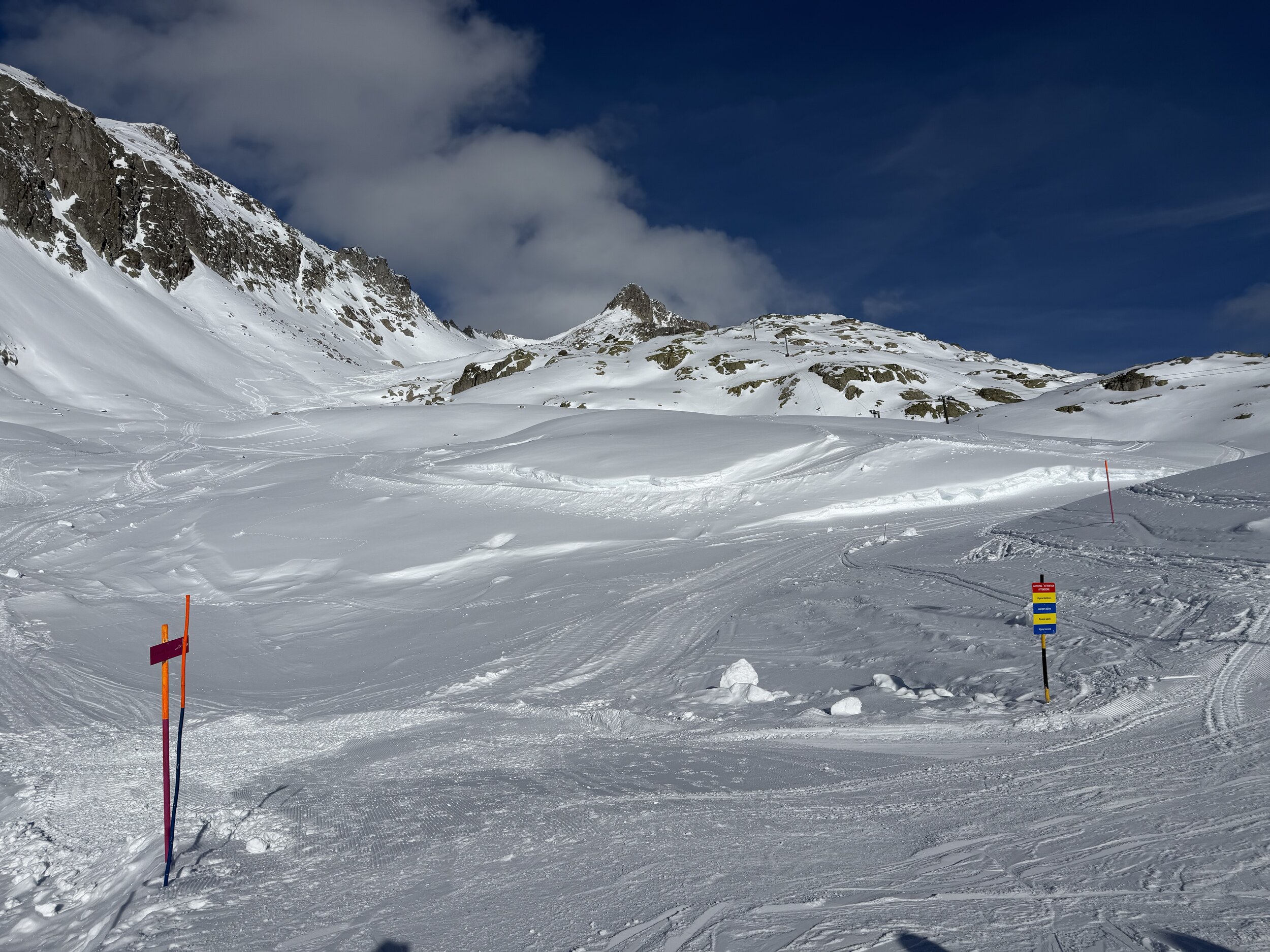 Der Cuolm da Vi ist grundpräpariert. Am Parlet wird oben gearbeitet. Den Status des Dadens kann man nicht wirklich einschätzen, die Verbindung vom Cuolm da Vi dorthin wurde aber bereits begonnen, genau wie die blaue Panorama am Lai Alv. Dort fehlt nach wie vor (viel) Schnee, der Lai Alv-See ist noch fast sichtbar und der Ziehweg macht ungewohnte Knicke…