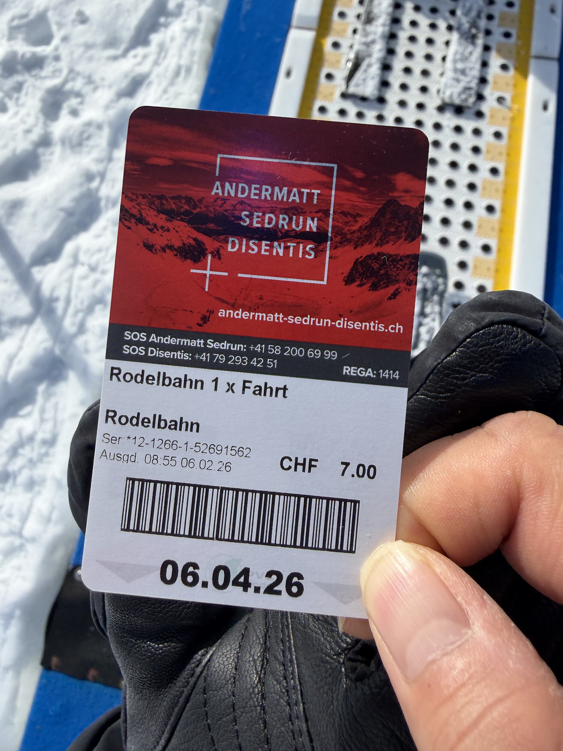 Vor dem Rodeln habe ich mich von meinem Sohn getrennt. Wir haben vereinbart, uns um 14:20 auf Lai Alv zu treffen, damit wir es dann gemäss Chrigels Marschtabelle (merci nomals) zurück nach Andermatt schaffen. Nach dem Rodeln fahre ich auf die Cuolm Da Vi-Seite, um den Sessel noch zu fahren.