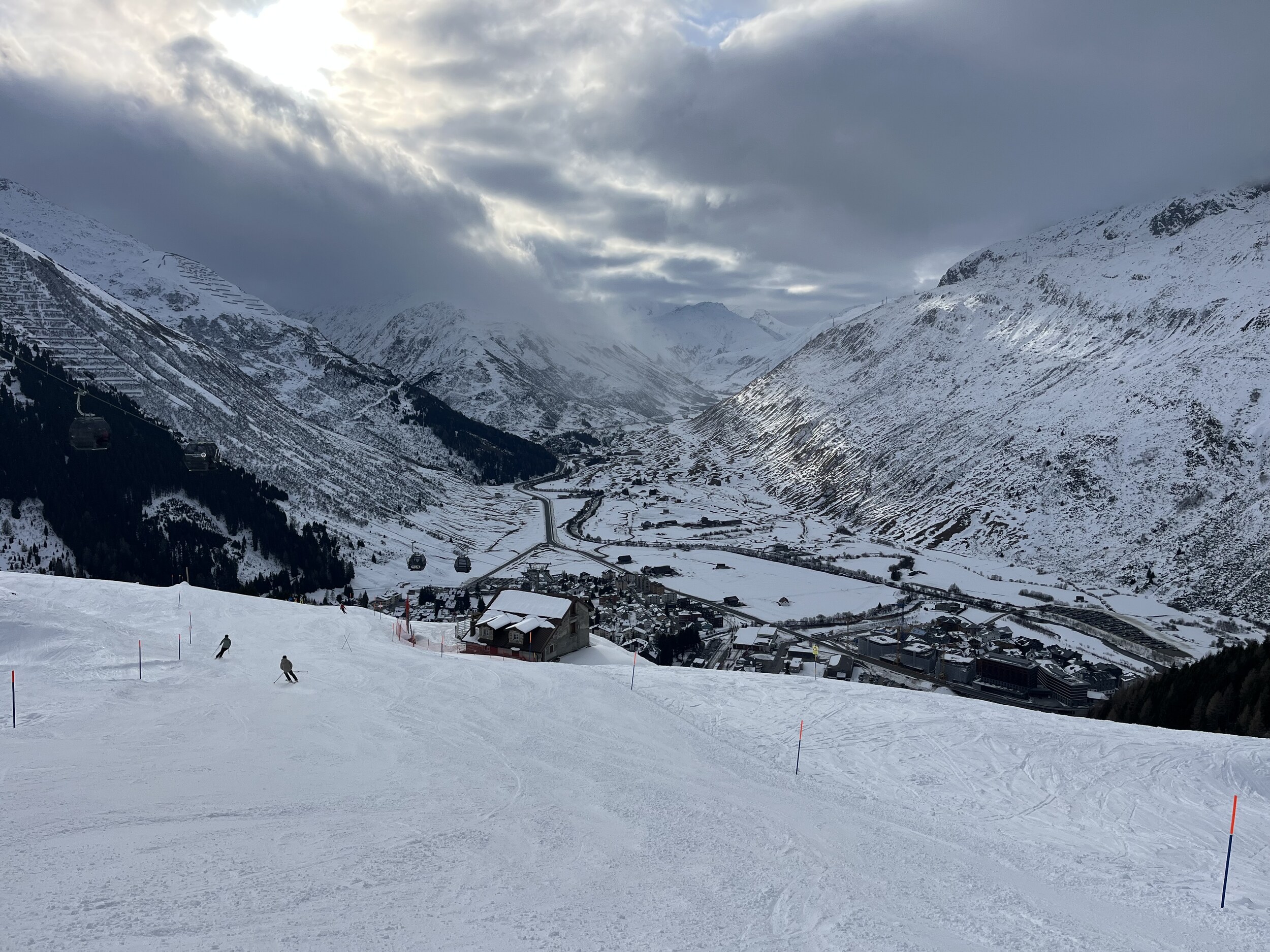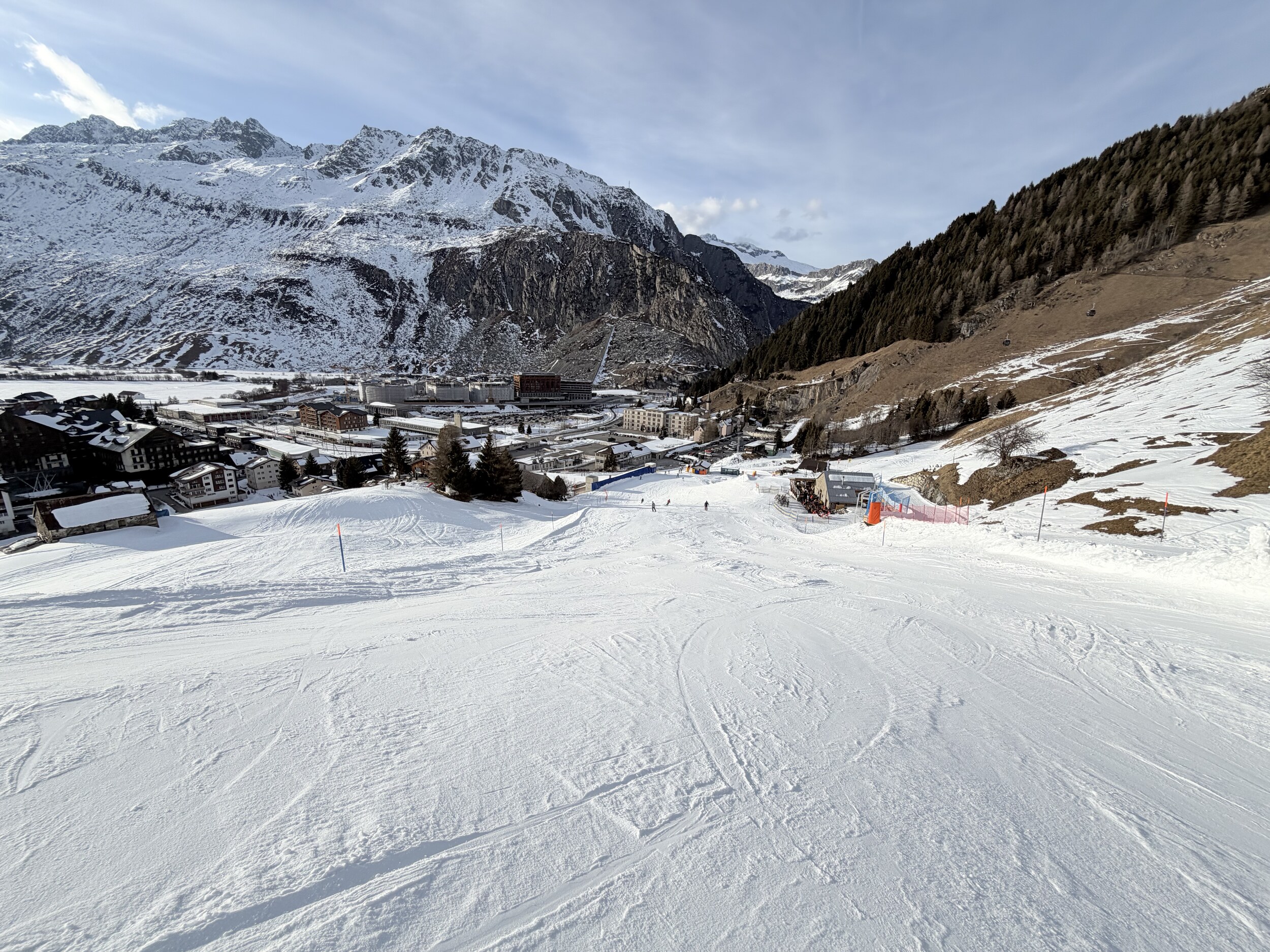 Danach wieder zurück nach Andermatt. Die Talabfahrt am Nätschen ziemlich mühsam. Die Passstrasse hat für eine Skipiste zu wenig Gefälle, dazu die Fussgänger, Schlittler und schlechten Skifahrer. Eine Schande, dass man hier die schwarze, direkte Talabfahrt nach wenigen Wintern trotz vorhandener Beschneiung wieder aufgegeben hat.