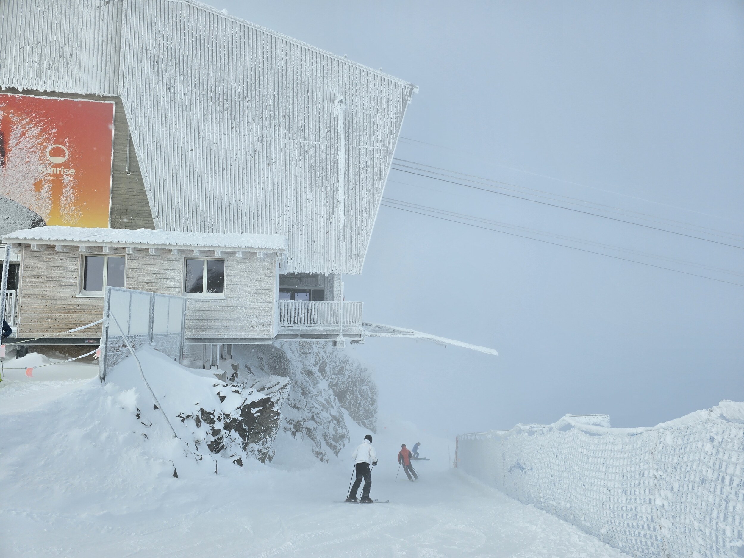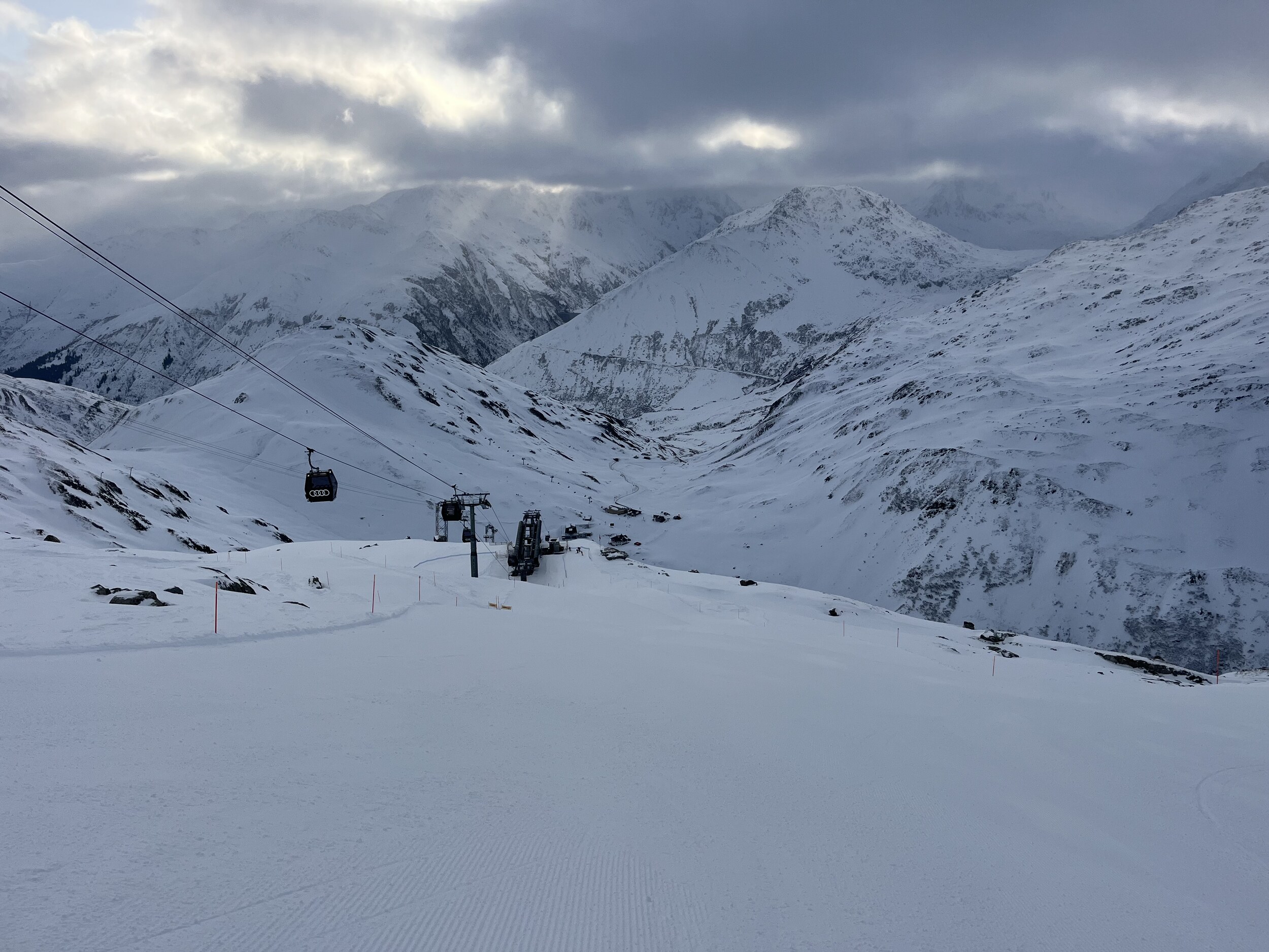 Aber immerhin öffnet die Gondel um 8.23 Uhr: Viel Wind am Gütsch. Pisten aber super. Bevor ich weiterziehe, fahre ich 2x: Die Wolken aus Süden greifen rüber: Die 30 ist im oberen Teil sehr gut, wenn auch etwas hügeliger als sonst. Man merkt den wenigen Schnee. Weiter unten ist sie schmal und hat Steine.
