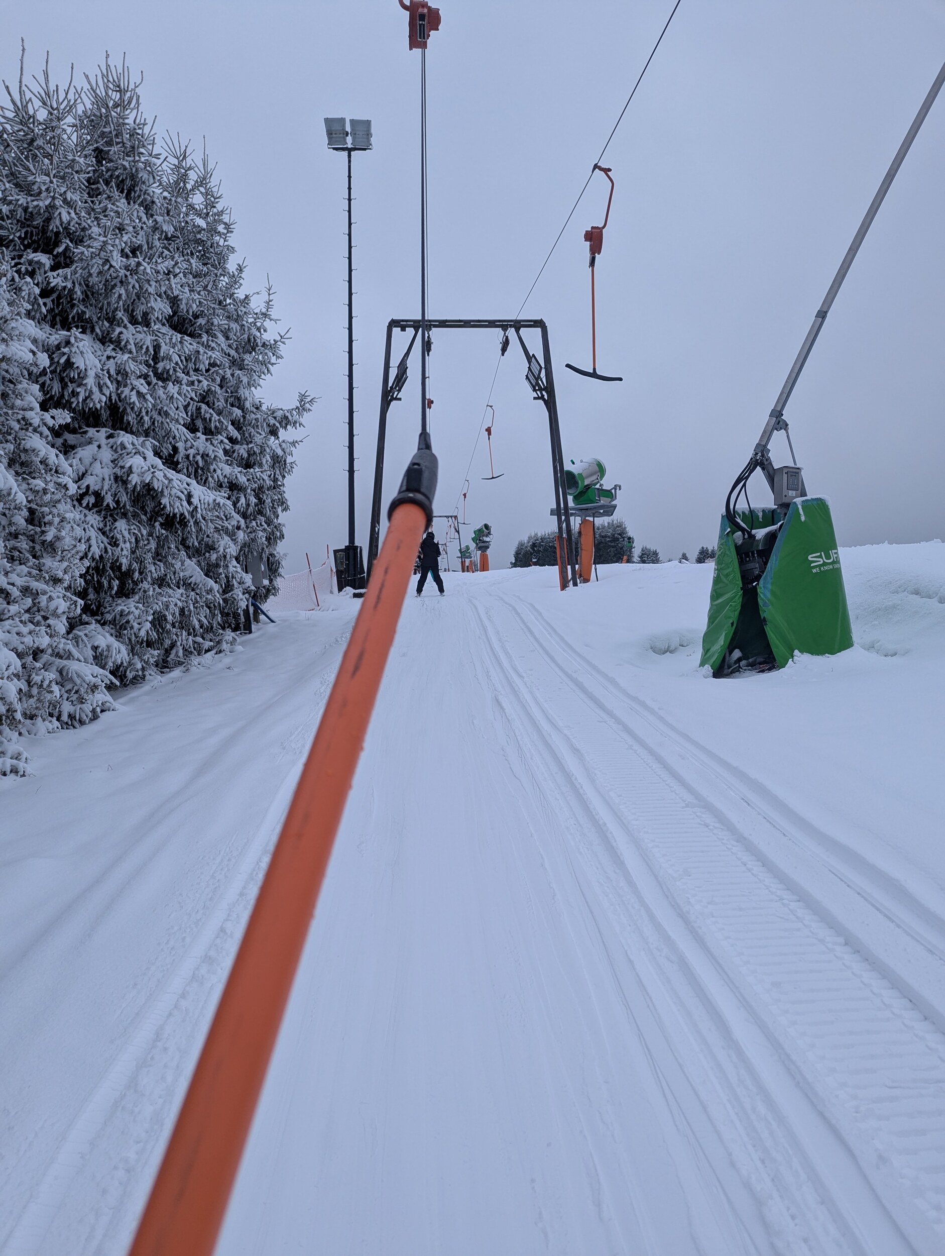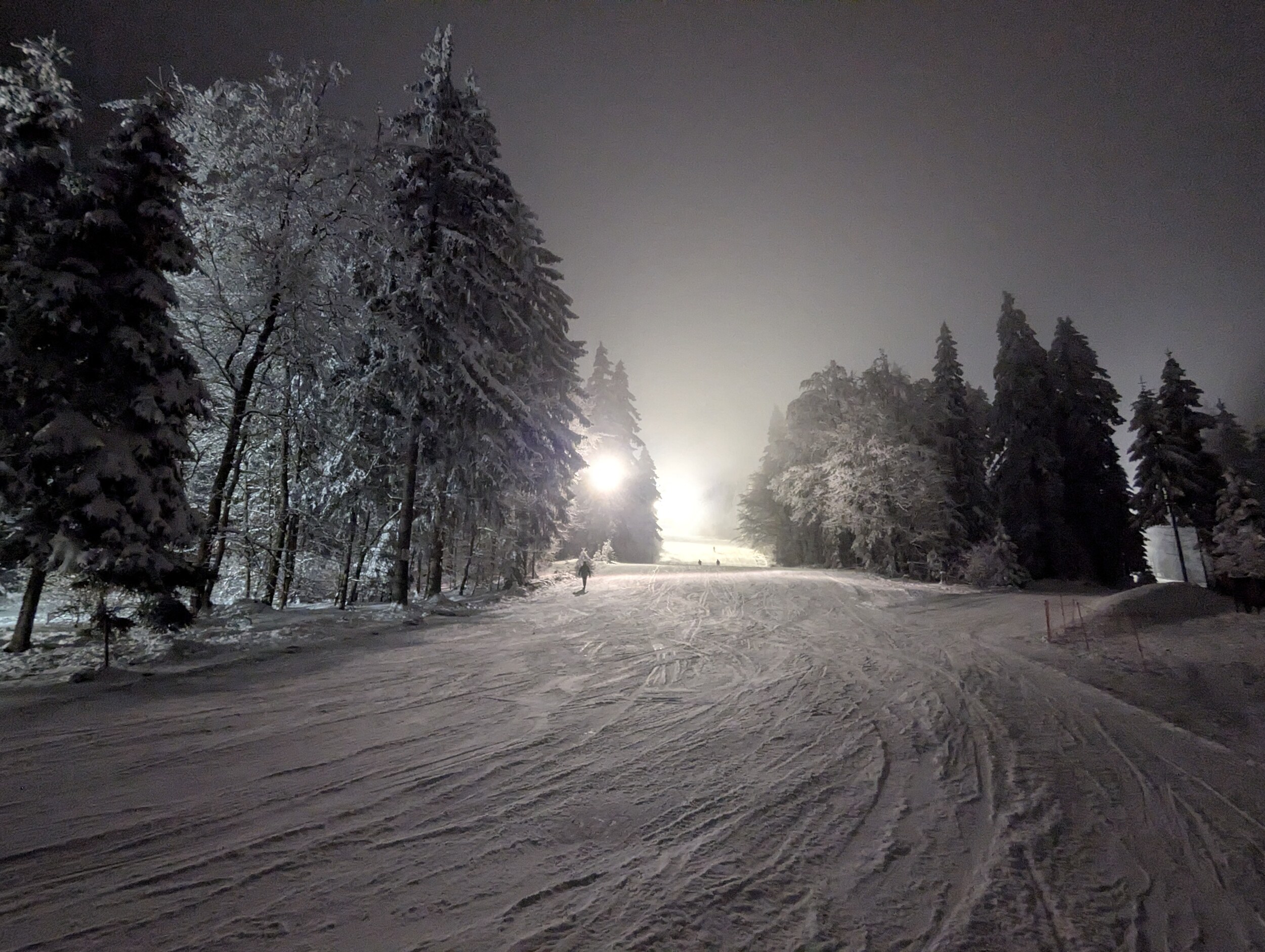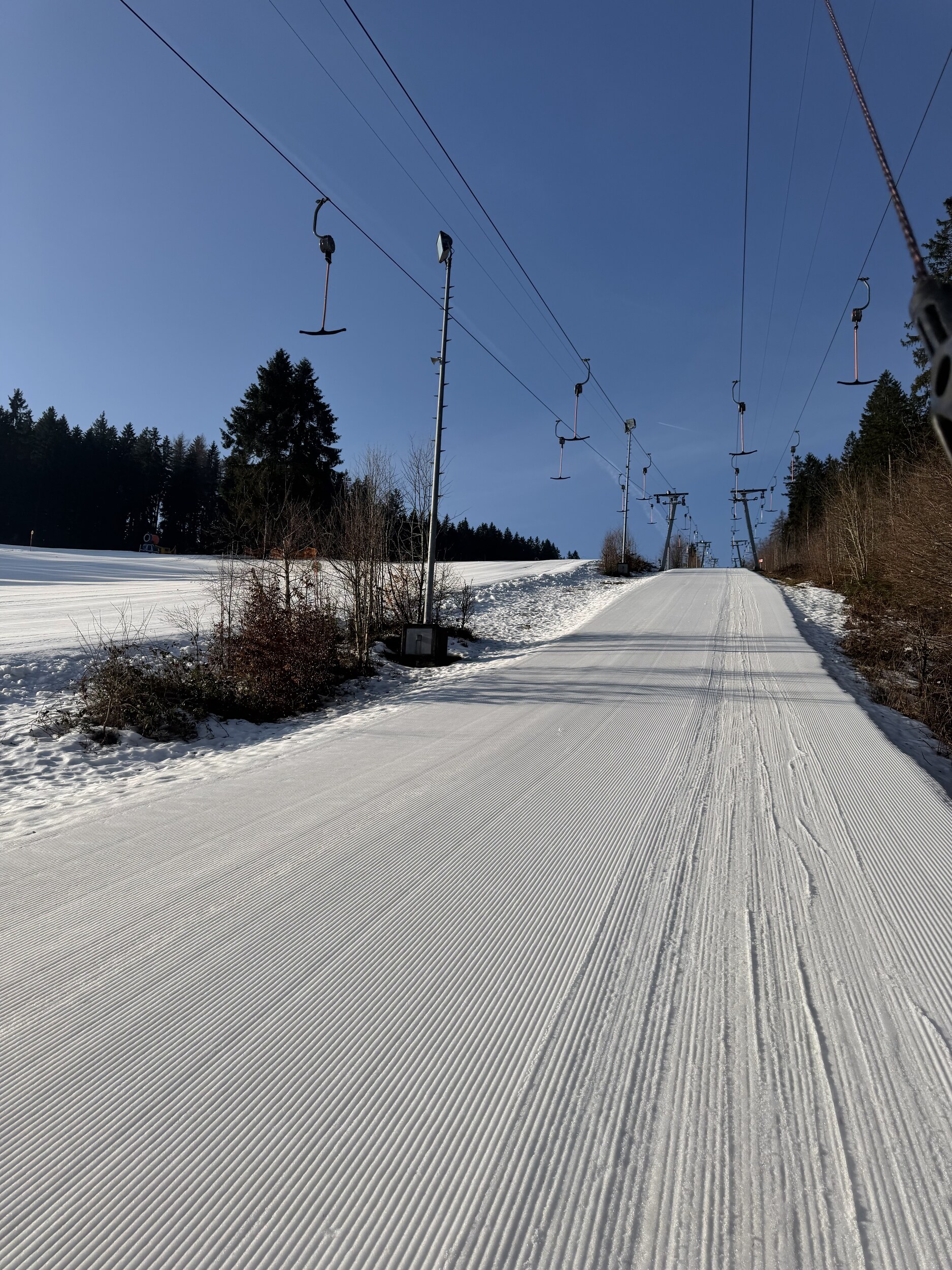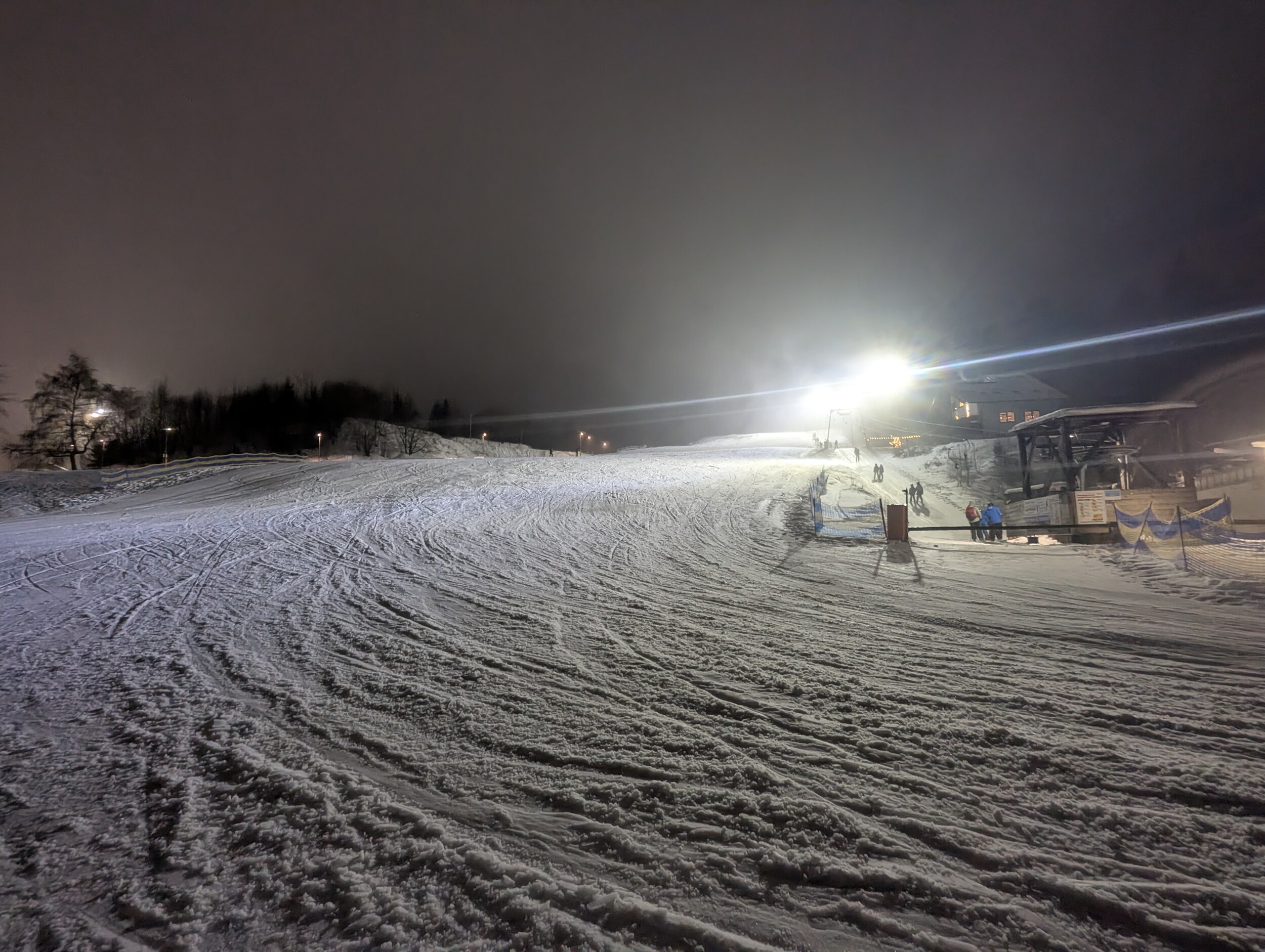 Heute Abend eine Runde Nachtskilauf am nächstgelegenen Skigebiet von meinem Wohnort aus: Dem Kornberg. Hier gibt's einen Schlepplift mit zwei beleuchteten Pisten, rein auf Naturschnee. Zudem ein modernes Förderband zum Rodeln bzw. Üben an einem kleinen separaten Hang, der aber am Abend nicht in Betrieb ist.