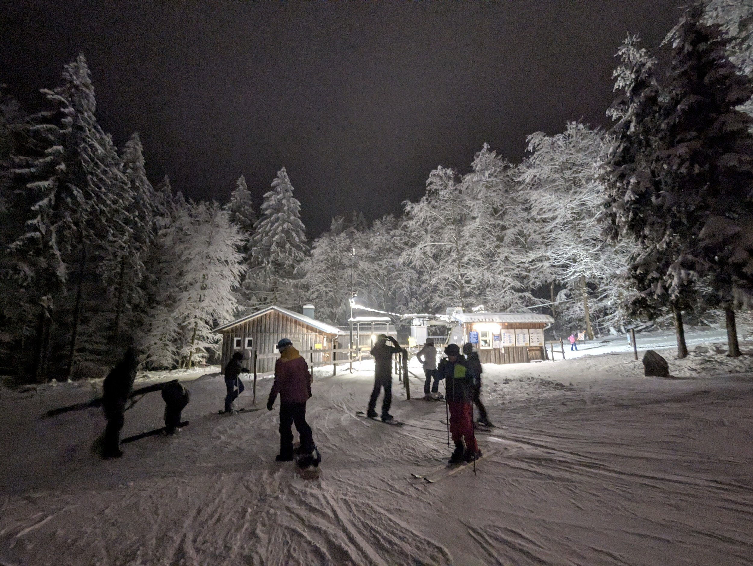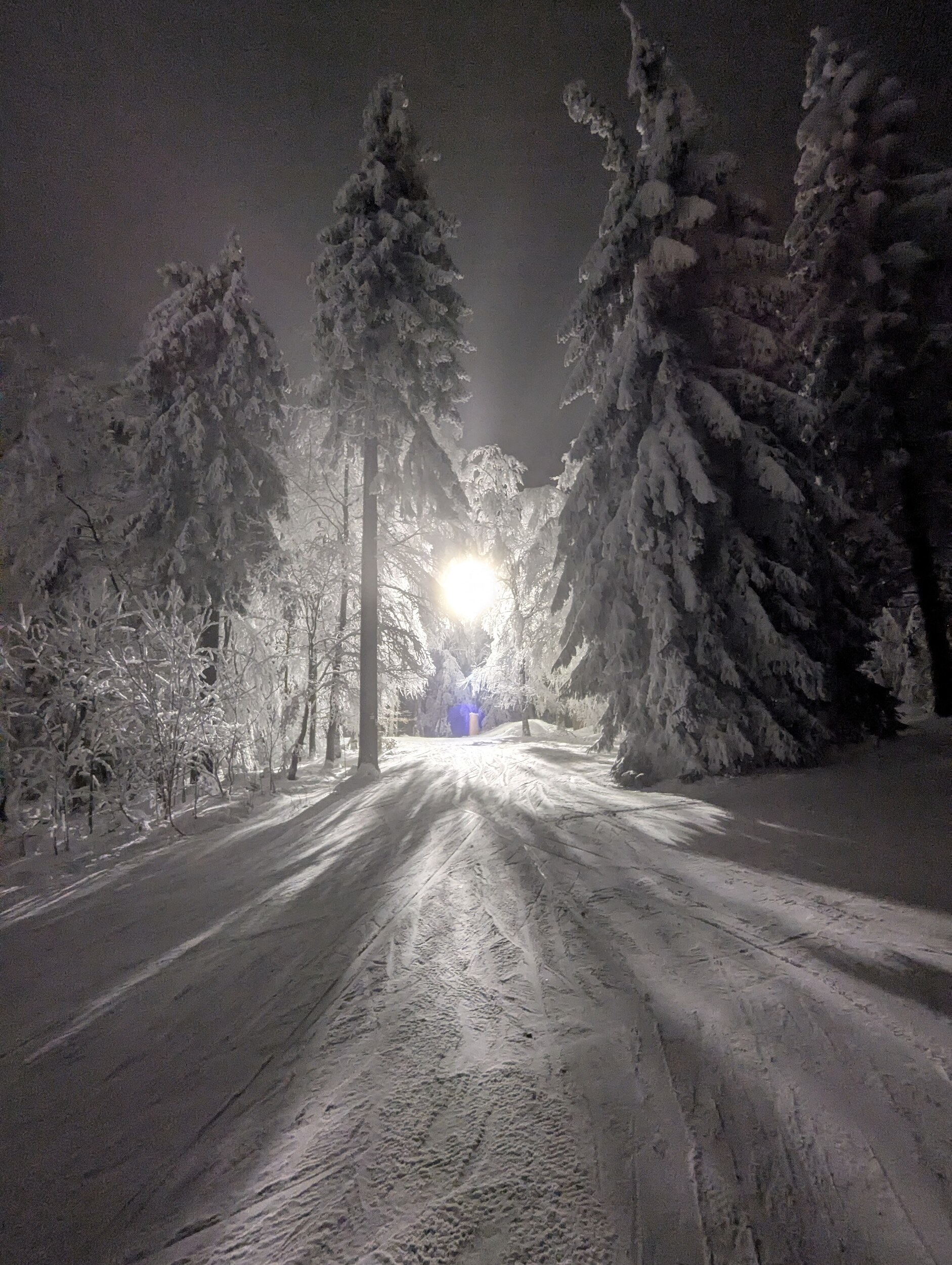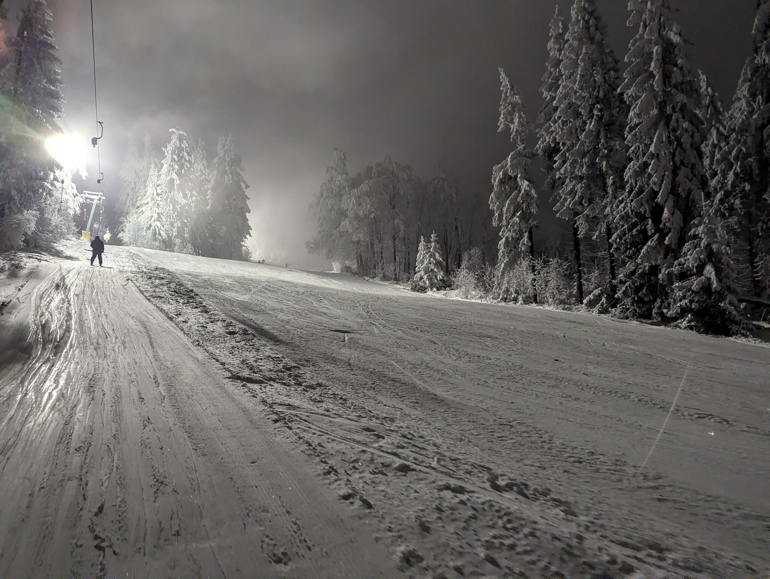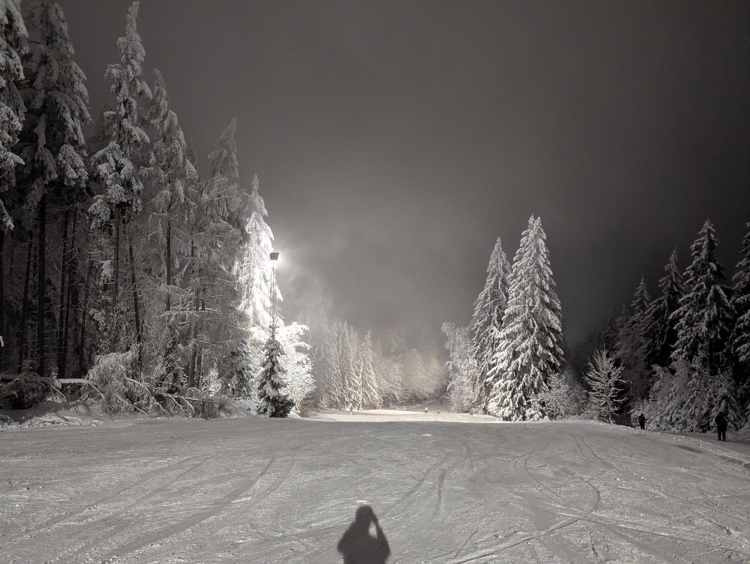Heute Abend eine Runde Nachtskilauf am nächstgelegenen Skigebiet von meinem Wohnort aus: Dem Kornberg. Hier gibt's einen Schlepplift mit zwei beleuchteten Pisten, rein auf Naturschnee. Zudem ein modernes Förderband zum Rodeln bzw. Üben an einem kleinen separaten Hang, der aber am Abend nicht in Betrieb ist.