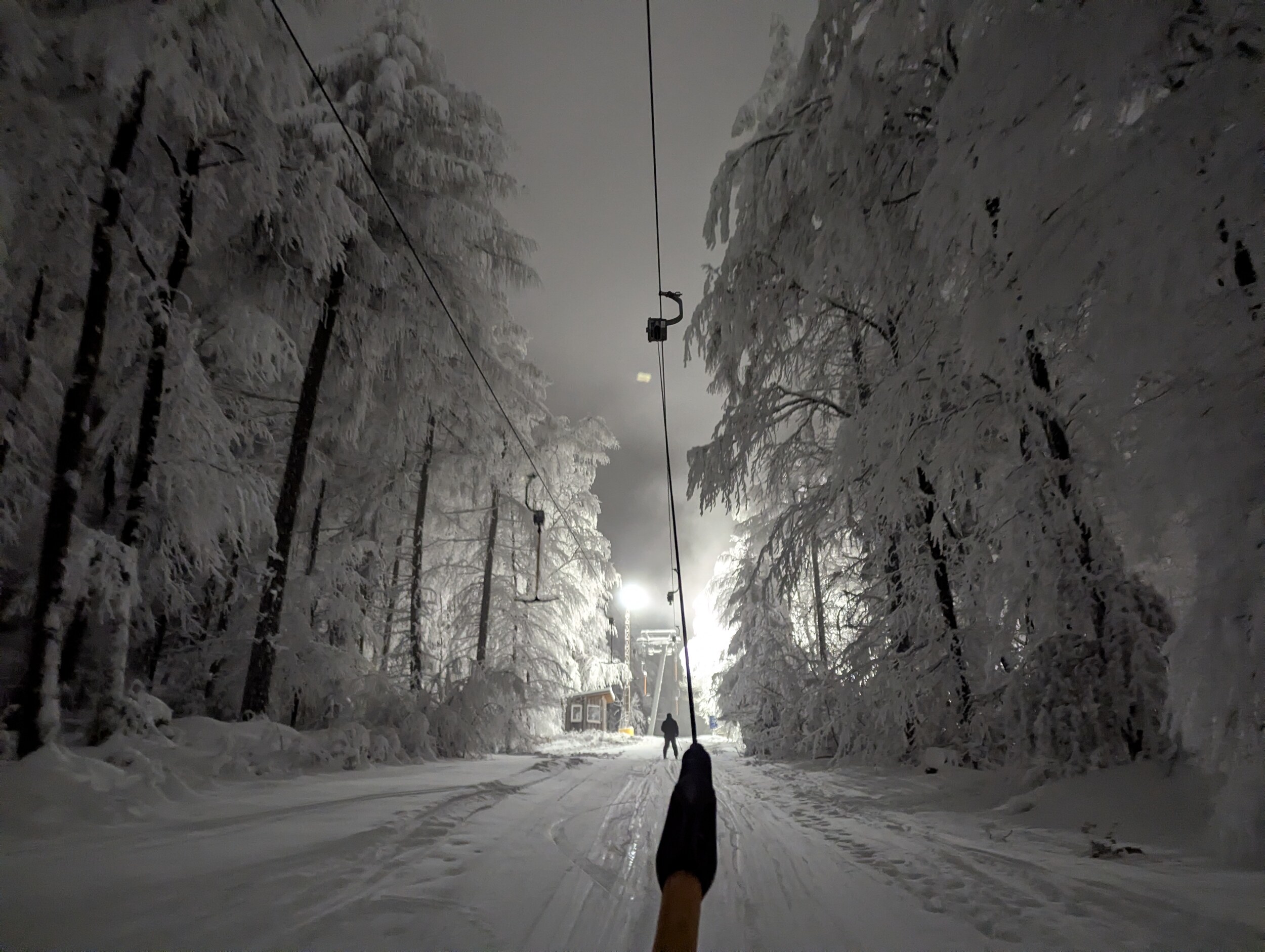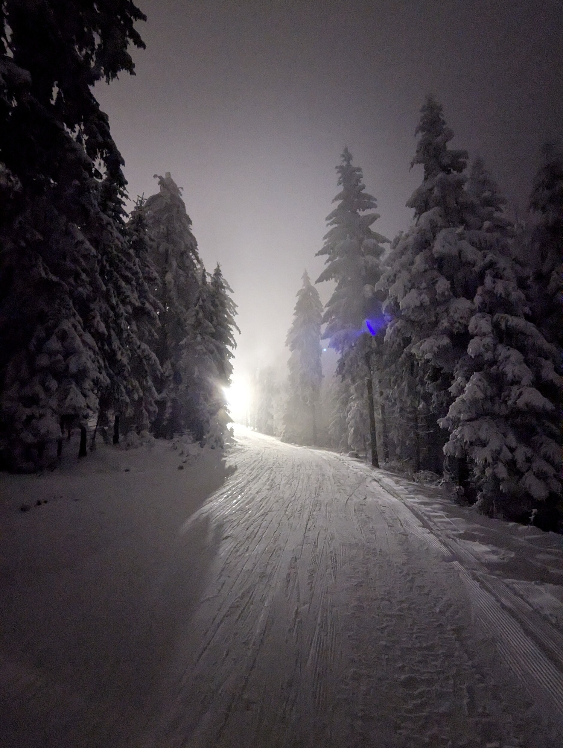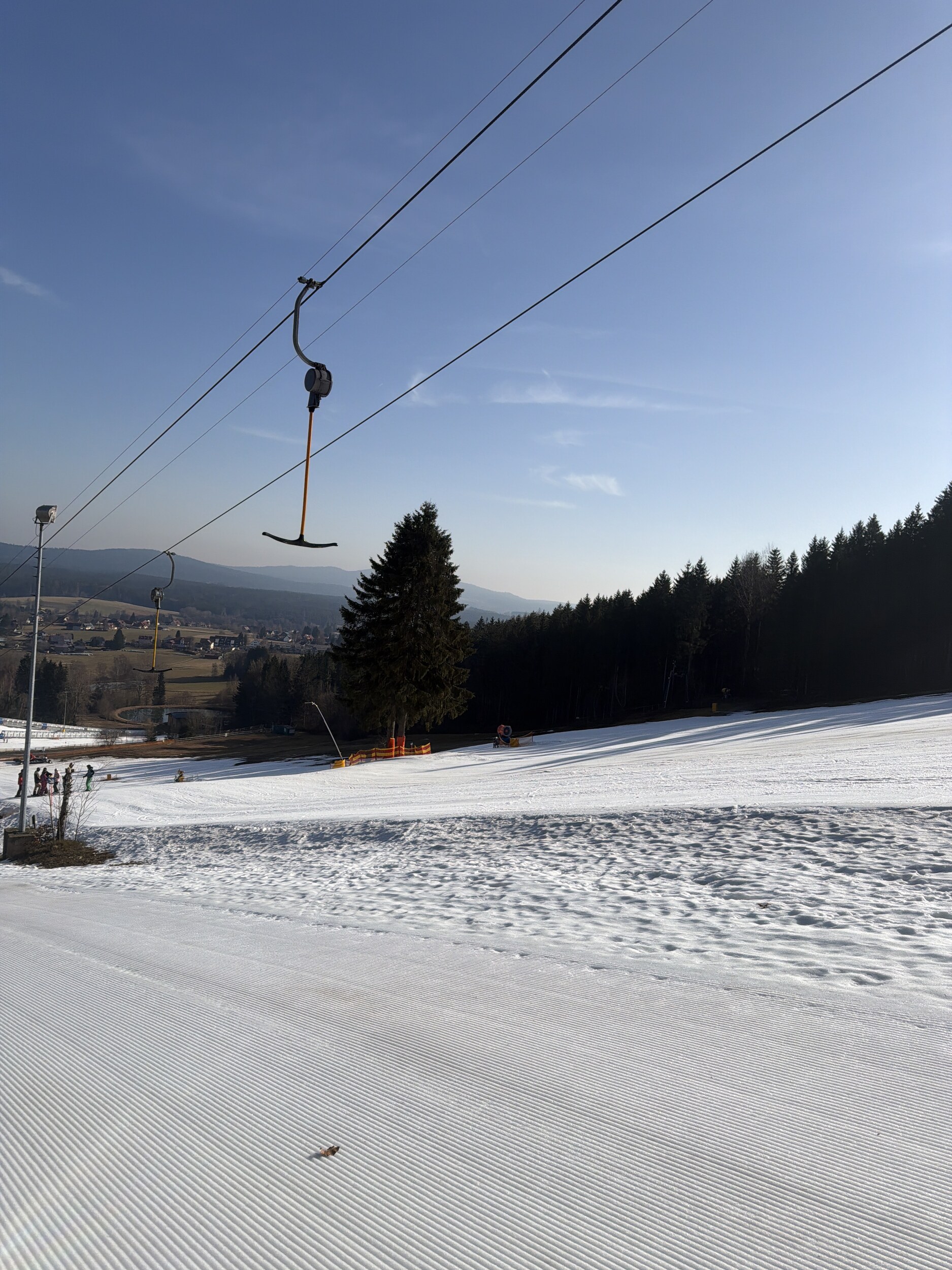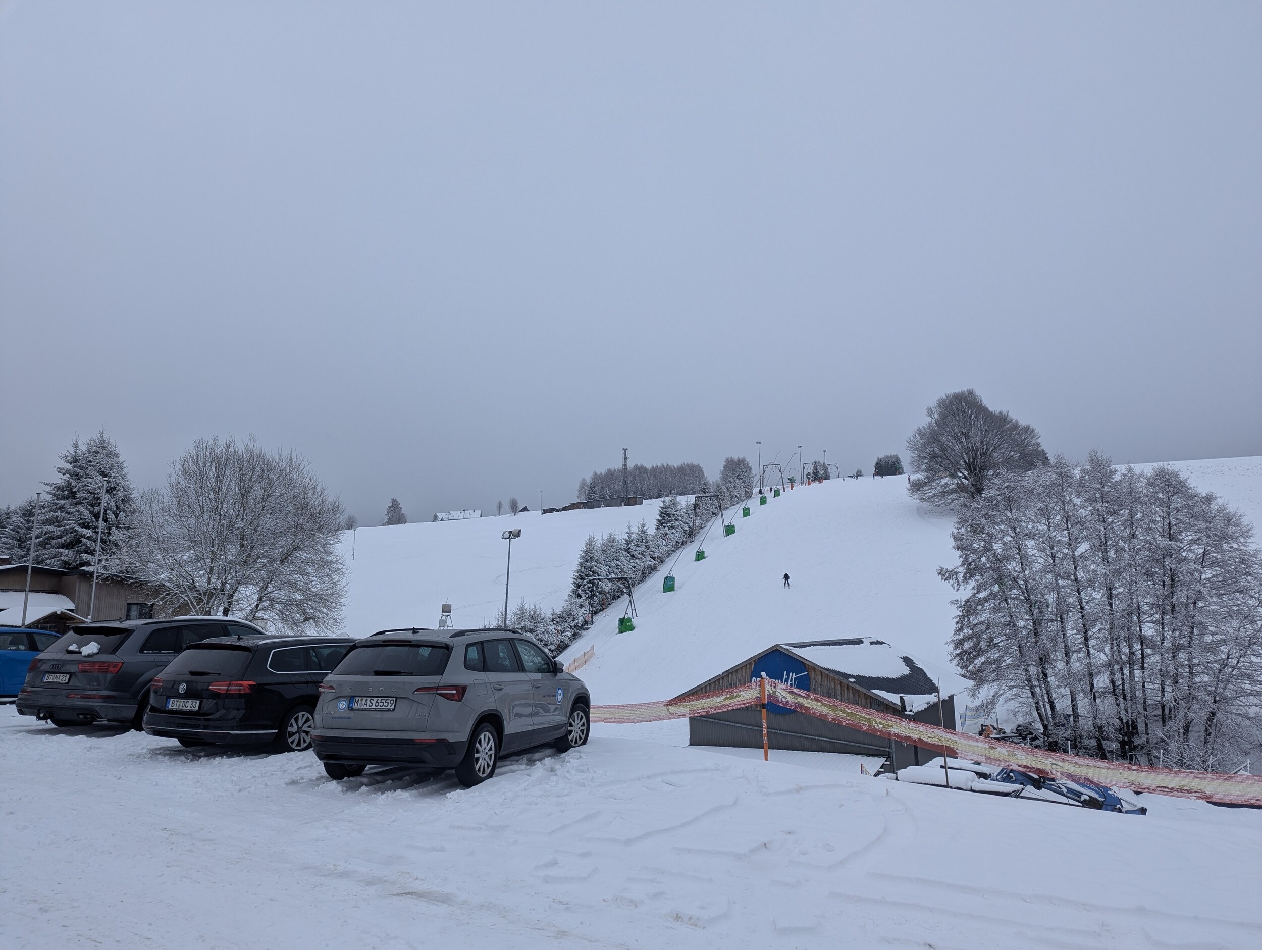 Heute Abend eine Runde Nachtskilauf am nächstgelegenen Skigebiet von meinem Wohnort aus: Dem Kornberg. Hier gibt's einen Schlepplift mit zwei beleuchteten Pisten, rein auf Naturschnee. Zudem ein modernes Förderband zum Rodeln bzw. Üben an einem kleinen separaten Hang, der aber am Abend nicht in Betrieb ist.