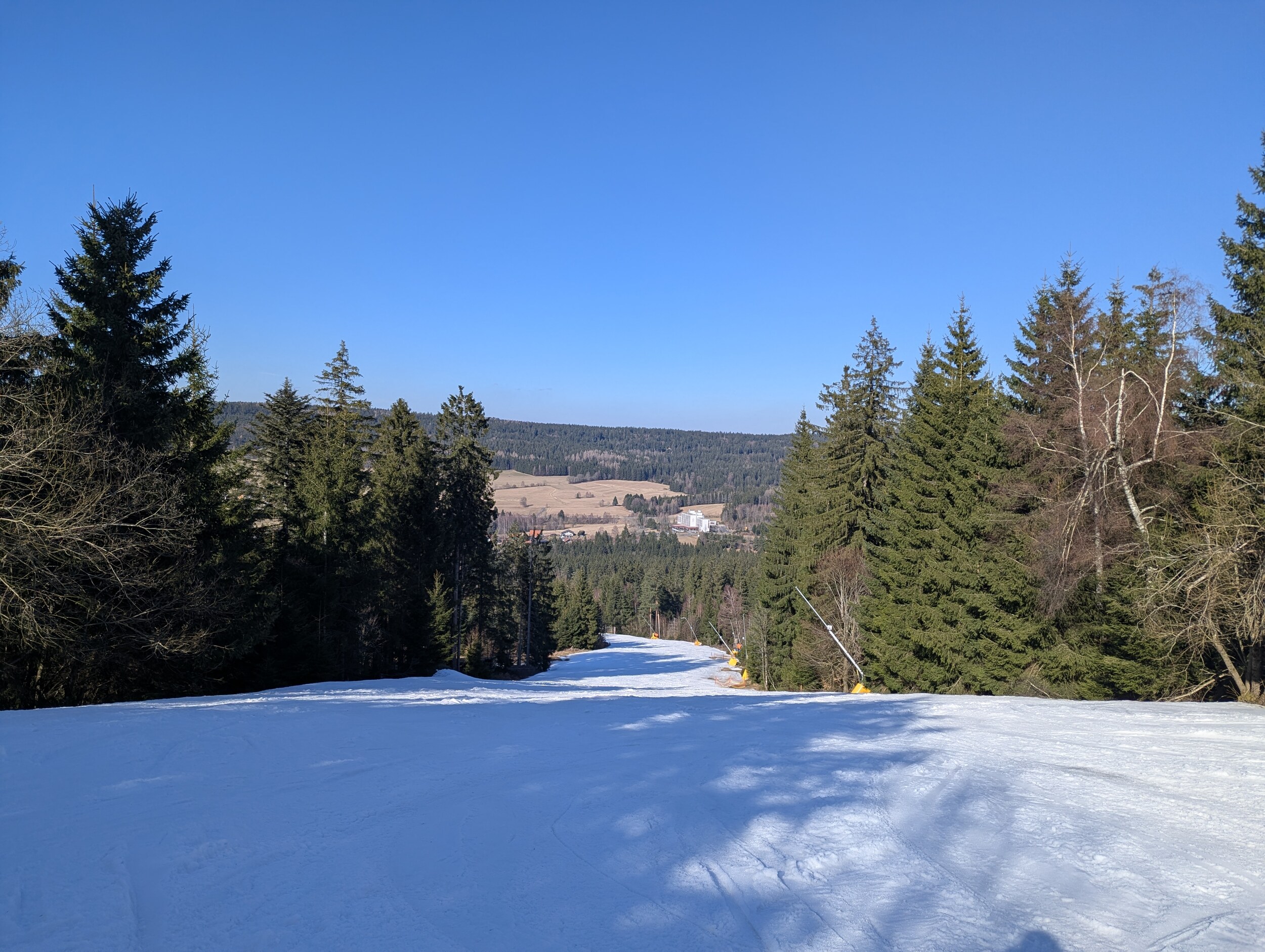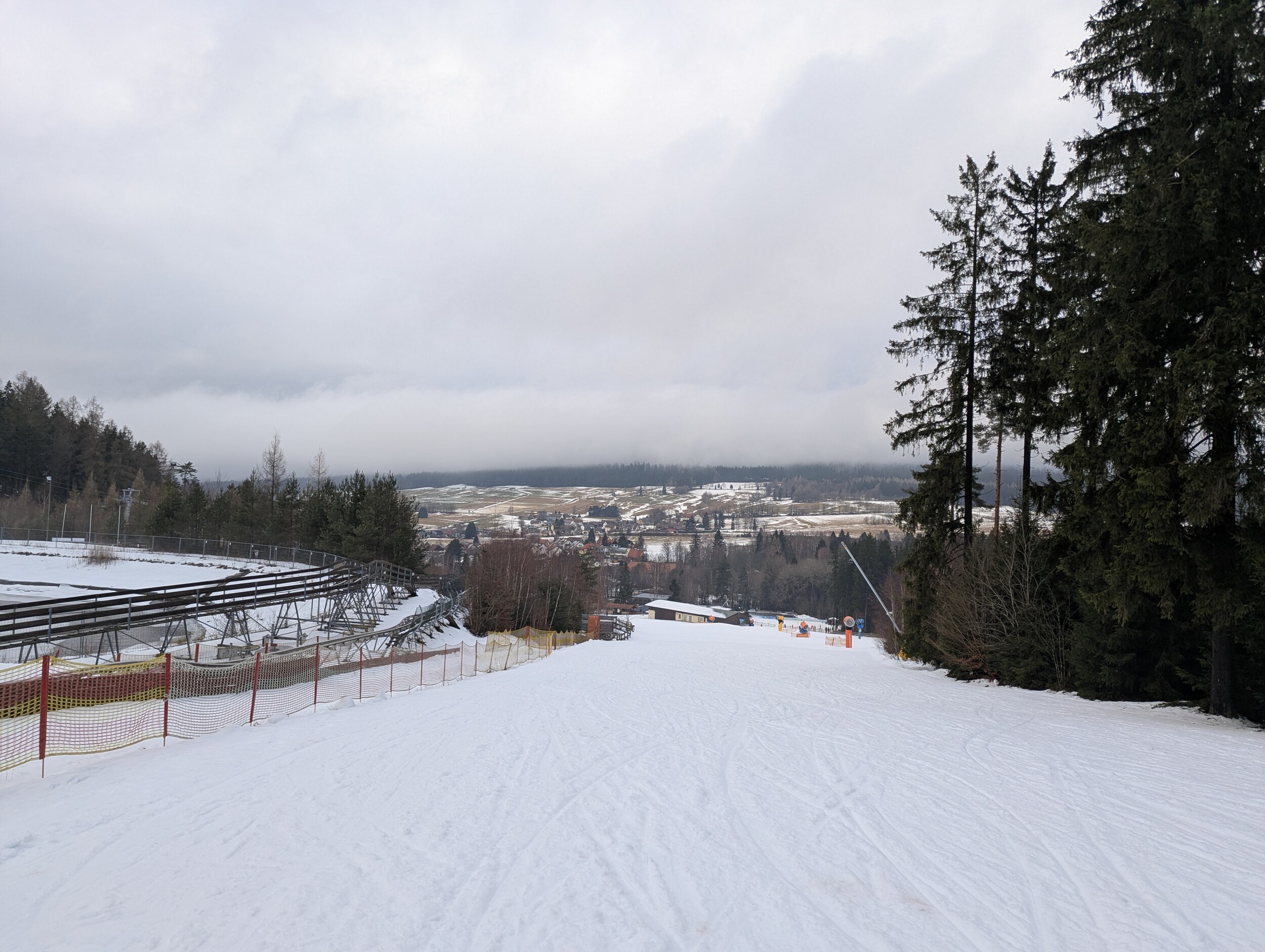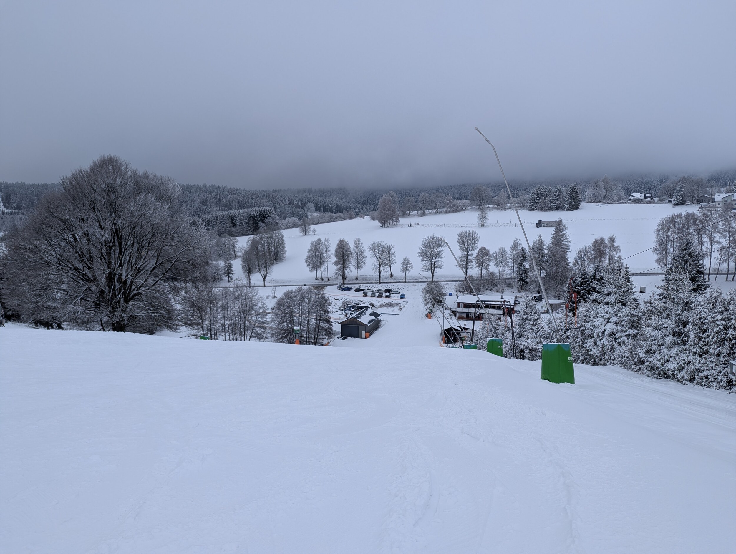 Blick vom Parkplatz: Piste oben: Piste unten: Rückblick: Spuren im Neuschnee: Blick auf Pistenbullygarage und Teich: Auf der anderen Seite gäbe es bei viel Naturschnee noch eine beleuchtete zweite Piste: Panoramablick auf Bischofsgrün: Fazit: Spaßige zwei Stunden, der Lift gefällt mir und ist eine gute Alternative wenn am Ochsenkopf die Bewölkung hängt! Sicher nicht mein letzter Besuch hier. 9 Punkte.