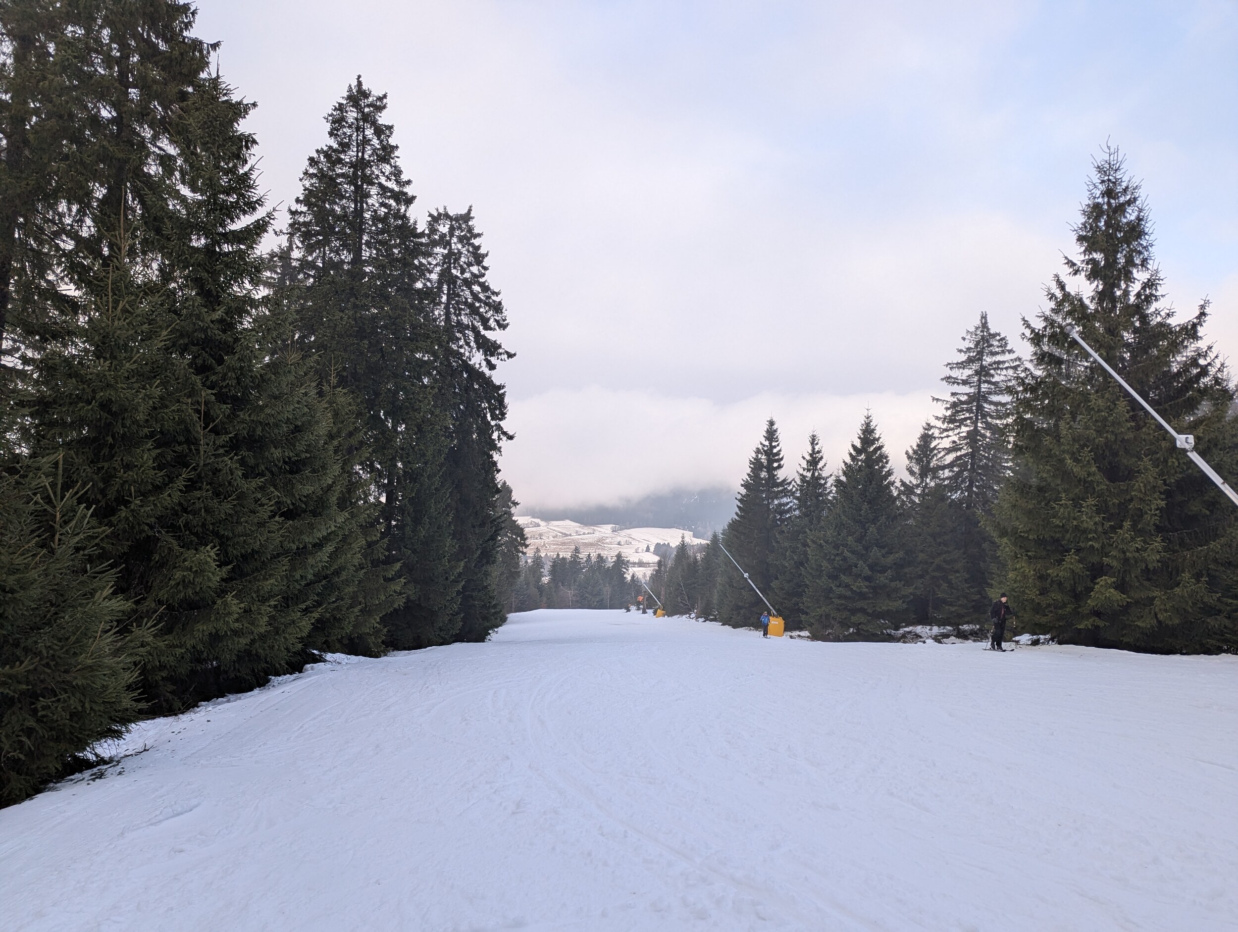 Der letzte Neuschnee ist schon einige Tage her, drum war ich etwas skeptisch hinsichtlich der Pistenbedingungen, zumal sie gleich nach dem letzten großen Neuschnee geöffnet haben statt den Schnee ruhen zu lassen. Es geht dafür aber gut, klar hier und da kommt das hohe Gras raus aber nicht so wild. Es liegen so ca. 30 cm Schnee. Die Landschaft sieht traumhaft aus.