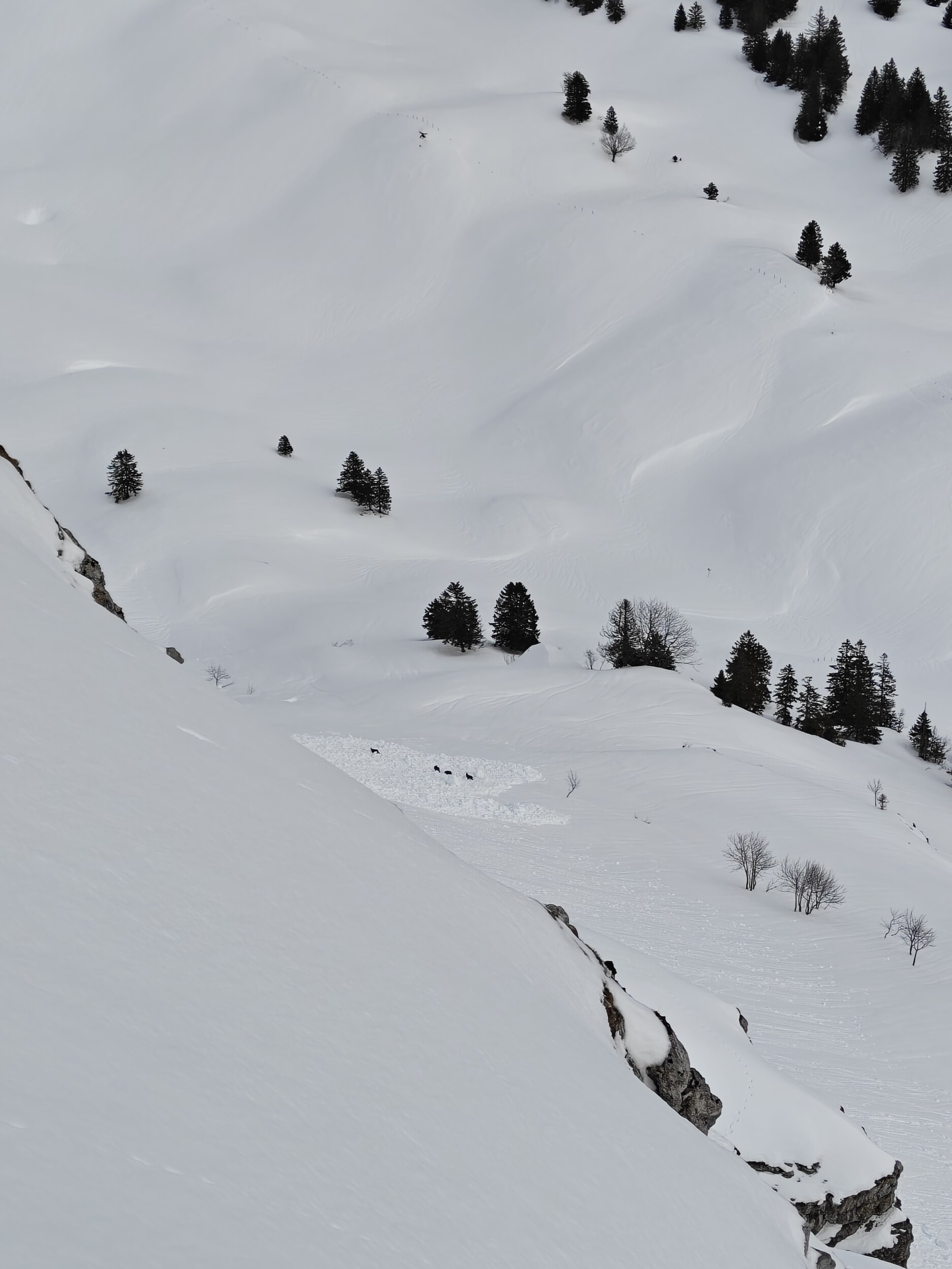 Die geringere Steilheit hat mir gestern im Tiefschnee aber sehr zugesagt. Wäre es etwas steiler gewesen, hätte ich mich wohl nicht getraut, alleine abseits zu fahren.