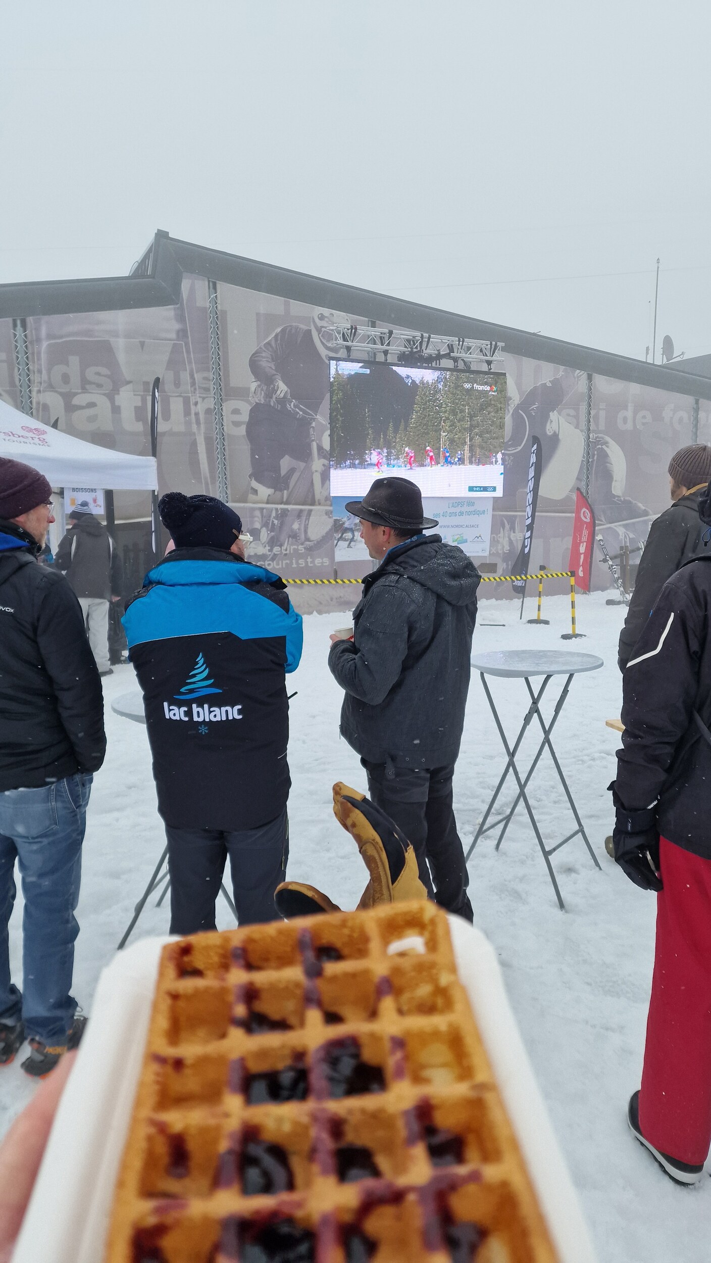 An der Bergstation des Sessellifts Montjoie hat die Pistenpatrouille mit der lokalen Langlauforganisation eine Übertragung der Olympischen Winterspiele auf einer großen Videowall veranstaltet, wobei der Hauptfokus auf dem 15-km-Biathlon-Massenstart der Männer an dem Tag lag, verständlicherweise aufgrund des regionalen Bezugs. Zudem wurden dort sehr leckere Waffeln verkauft, von welchen ich mir direkt zwei gekauft habe. Ich habe mich entschieden, das Rennen dort zu verfolgen, und dann kam es im Rennen auch noch zur lustigen Konstellation, dass ausgerechnet ein Franzose (Fillon Maillet) mit einem Deutschen (Horn) um die Bronzemedaille gekämpft hat. Das hat zu einigen sehr lustigen Gesprächen mit der Patrouille vor Ort geführt.
