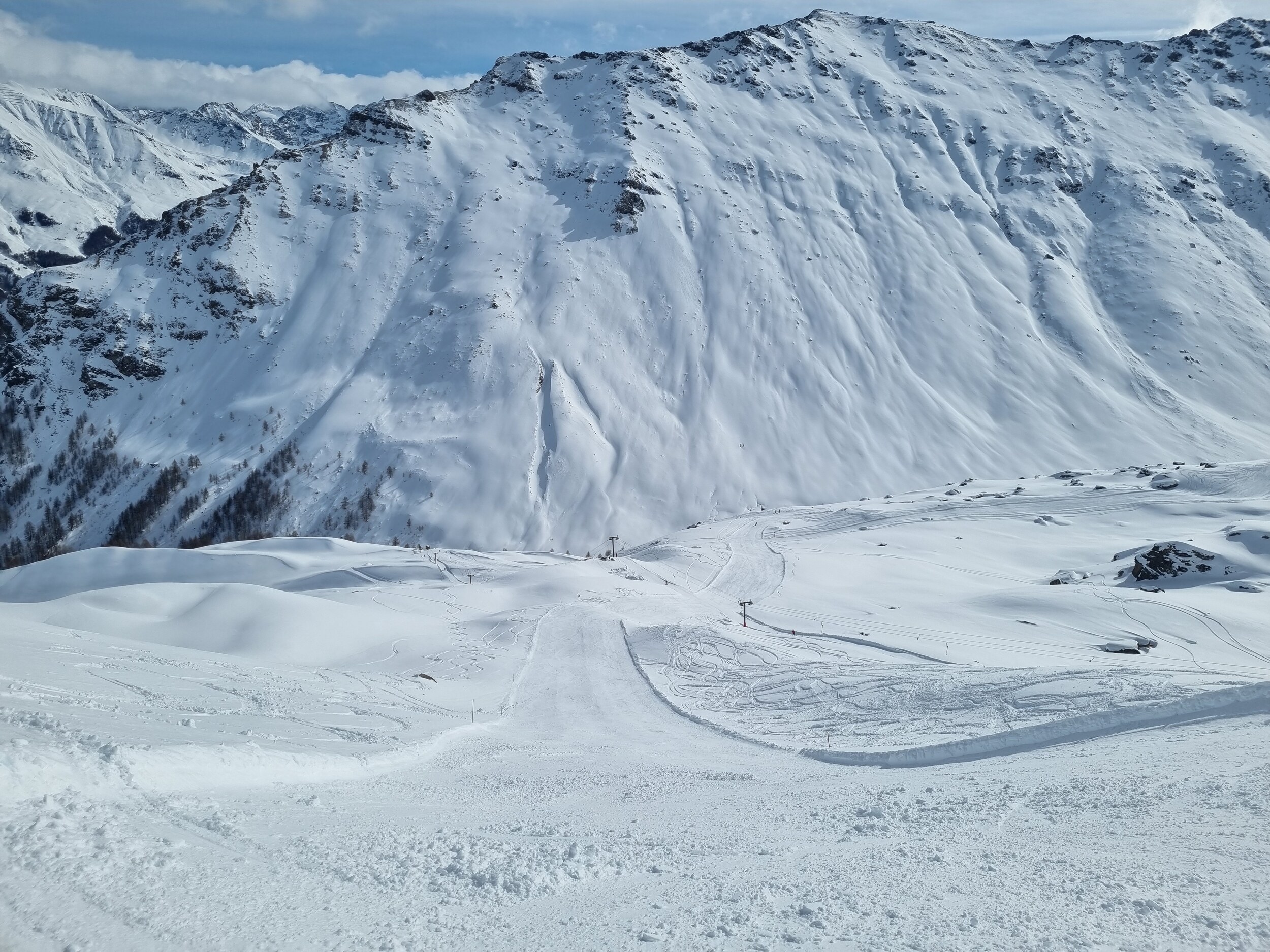 Gute Bedingungen in Evolène. Endlich liegt eine ordentliche Menge Schnee im Skigebiet. Alle Pisten sind geöffnet (Les Arpilles ist heute wegen Lawinen und Wetterbedingungen geschlossen, soll aber morgen wieder geöffnet sein). Der Schnee auf den Pisten ist gut, abseits der Pisten nicht so gut, da er sehr schwer (und teilweise verkrustet) ist.