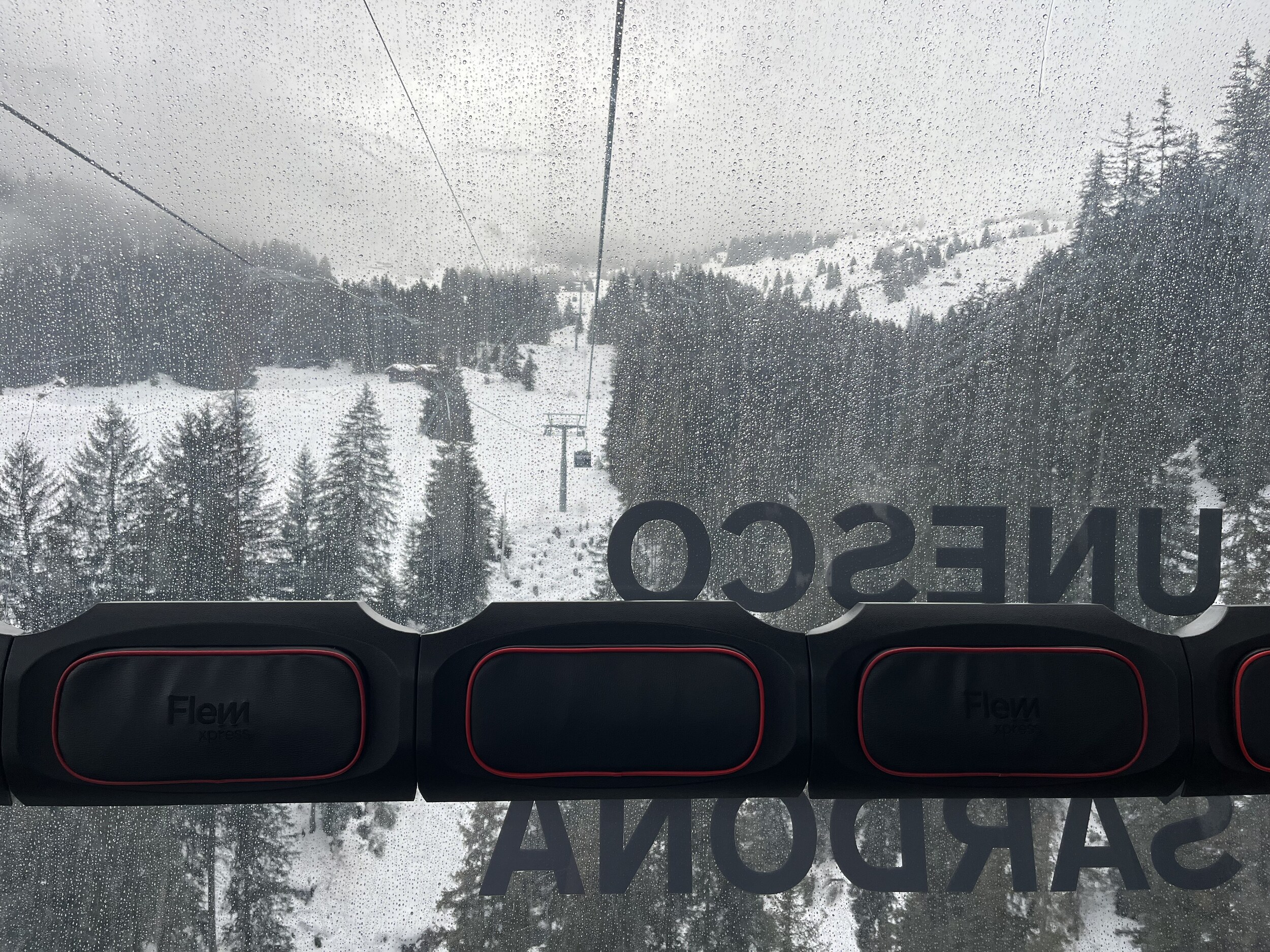 Mit dem FlemX bin ich heute nicht so zufrieden: 31min für Flims-Segnes ist zu lang. Die Piste natürlich wie erwartet total verbuckelt, aber die Sicht akzeptabel: Wunderbar, endlich Winter! Ab Runcawald ist die Piste trotz der 8700 Leute heute erstaunlich gut. Der nasse Schnee ist derart gepresst, dass sich keine Hügel bildeten. Die zweite Runde mache ich nun mit dem Arenaexpress.