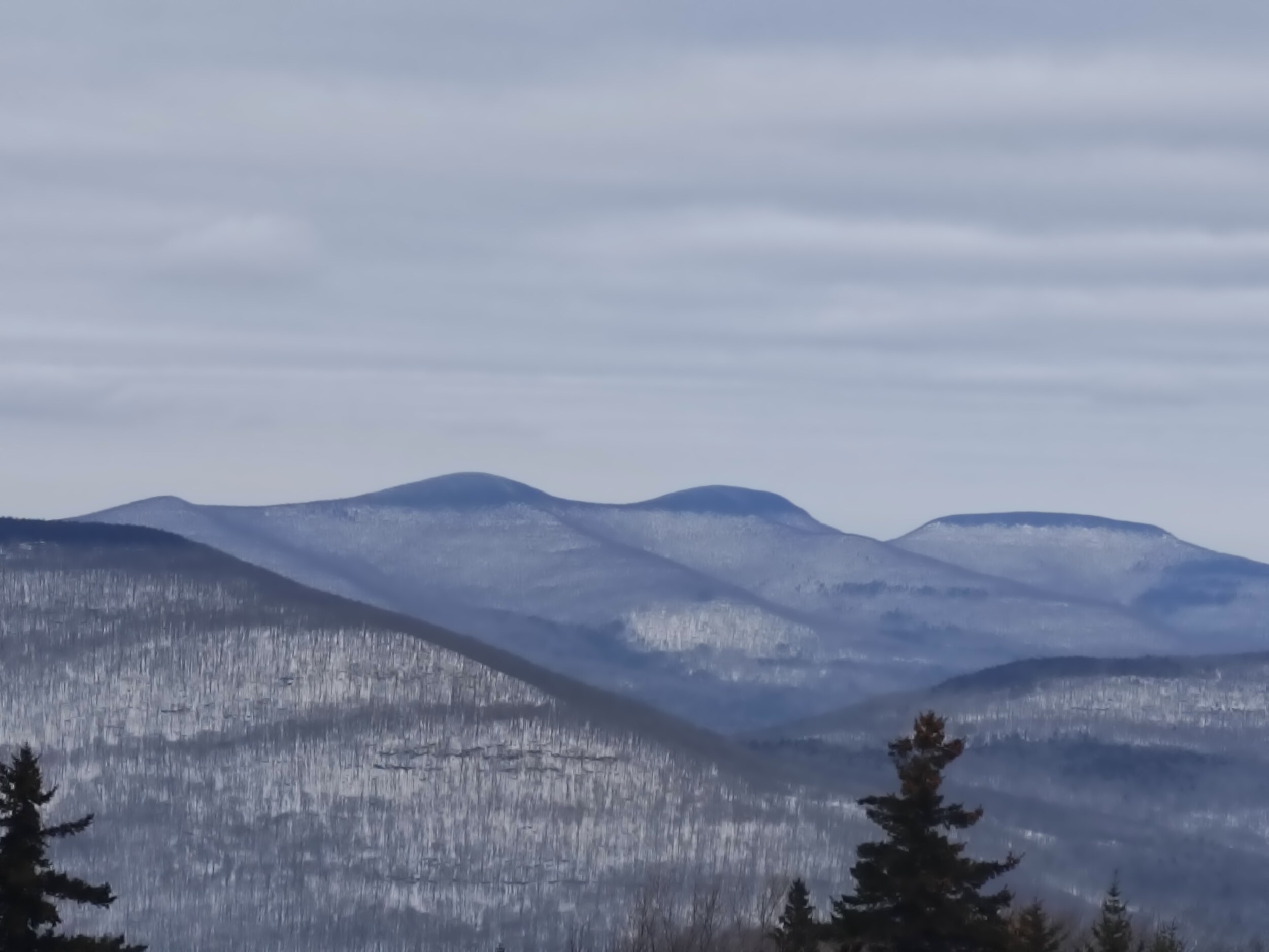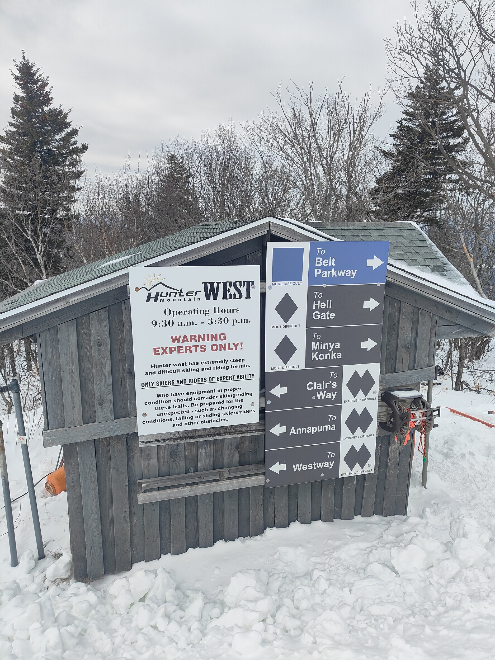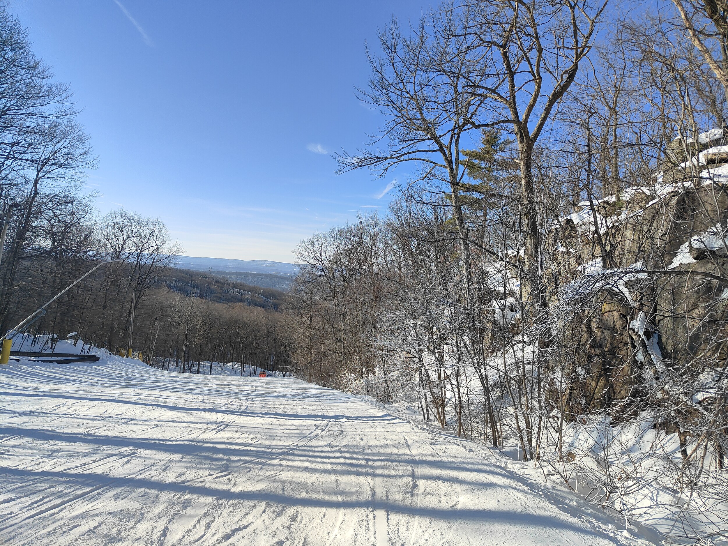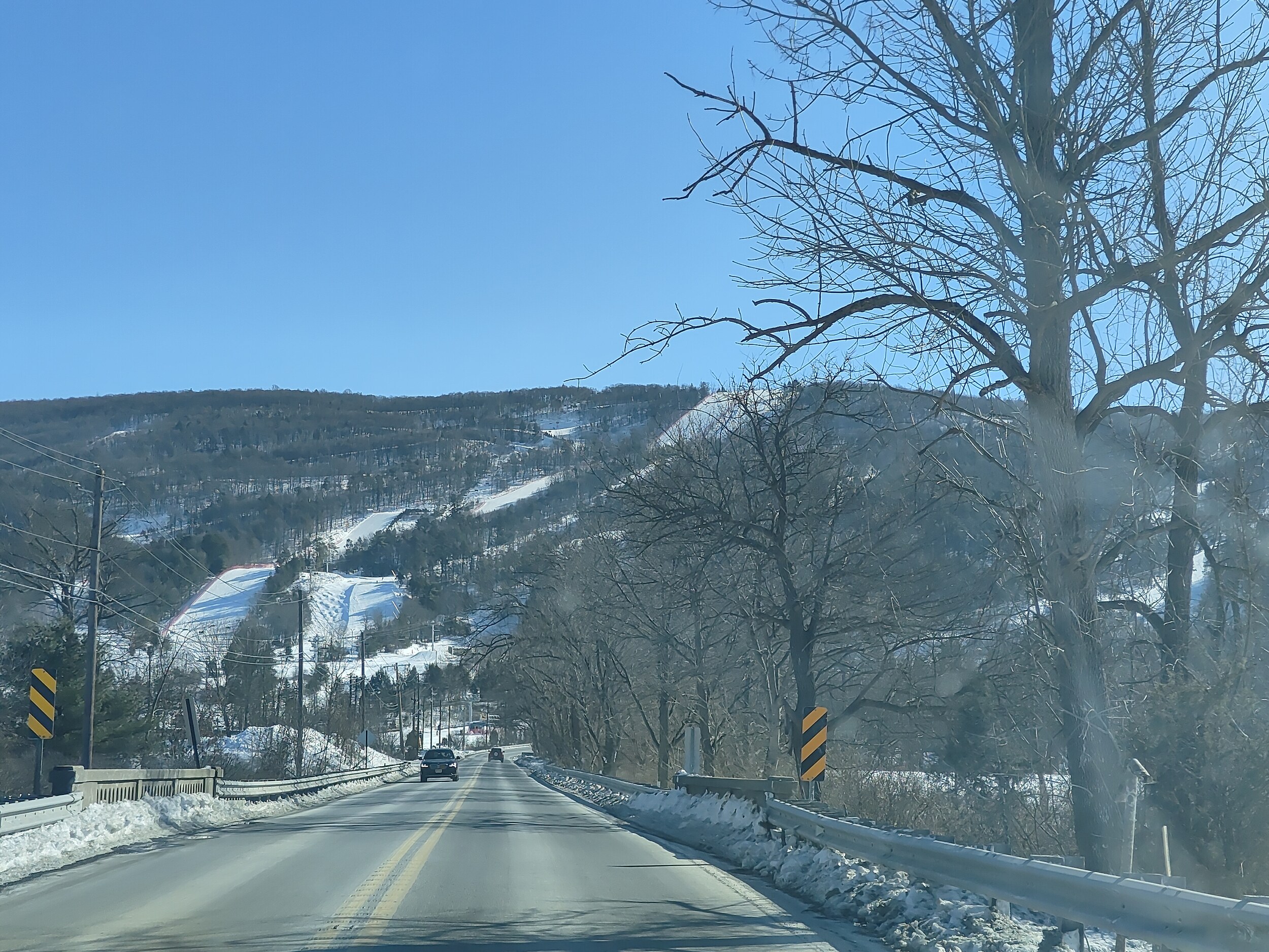 Wieder 90 Minuten Fahrt, einmal das Hudson Valley durchqueren und in die Catskills eintauchen, deren Hügel zwar auch an den Jura erinnern, die aber doch ganz andere Kaliber sind als in den Berkshires. Ich wache langsam auf. Und in der Tat, als die Strasse aus einer engen Schlucht auf eine Art Hochtal führt sehe ich ein richtiges Skigebiet! Dabei sind es nicht die im Vergleich zu den letzten Skigebieten 50% mehr Höhenmeter, sondern die mit Felsen durchsetzten Hänge, die hineingebauten Pisten, deren Neigung, und dass es wieder einmal ein Gebiet ist, bei dem man nicht gleich alle Lifte und Pisten vom Parkplatz aus sieht.