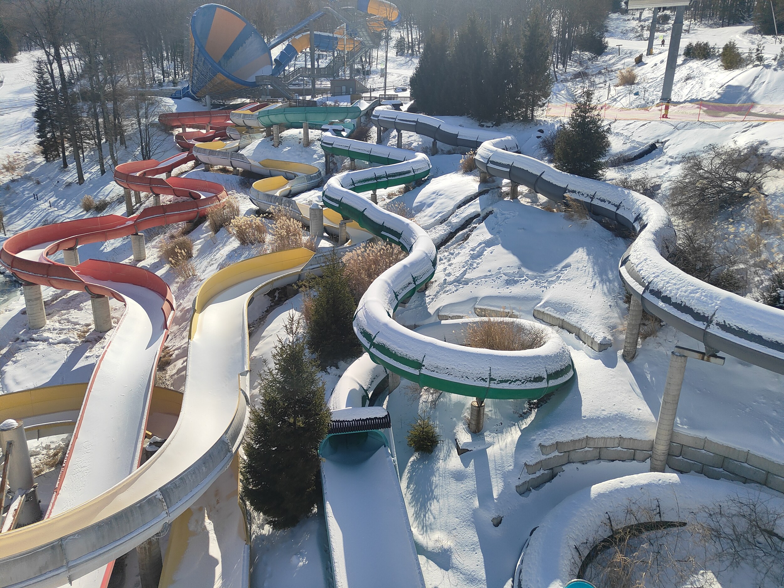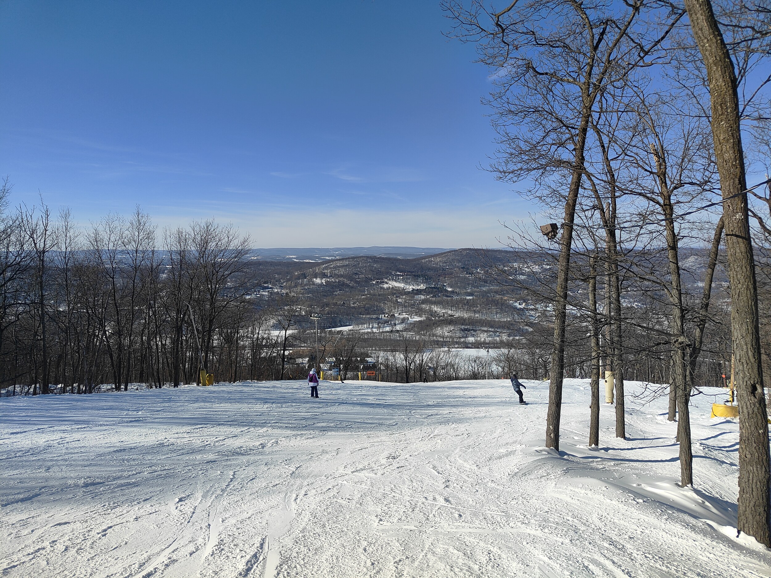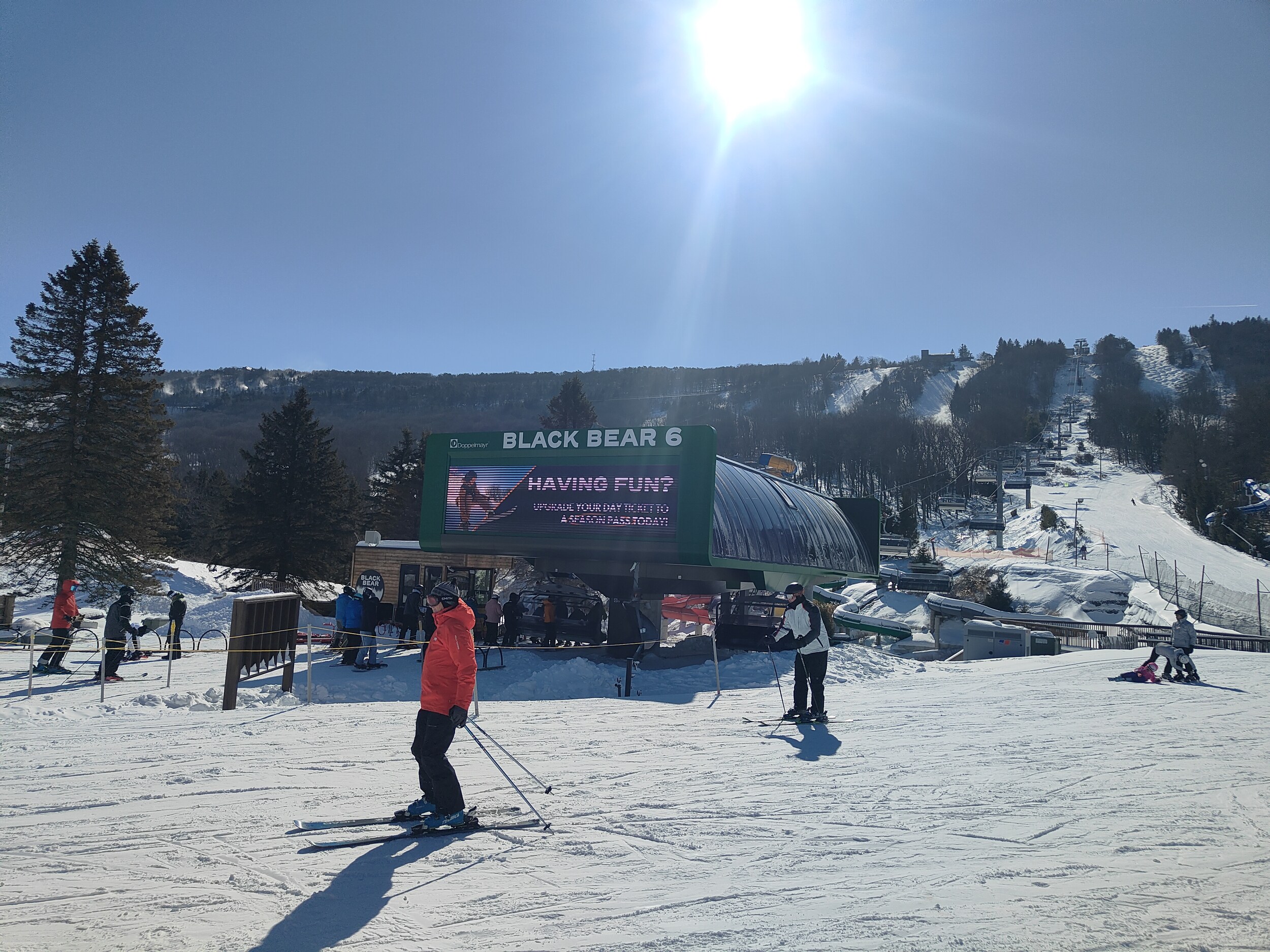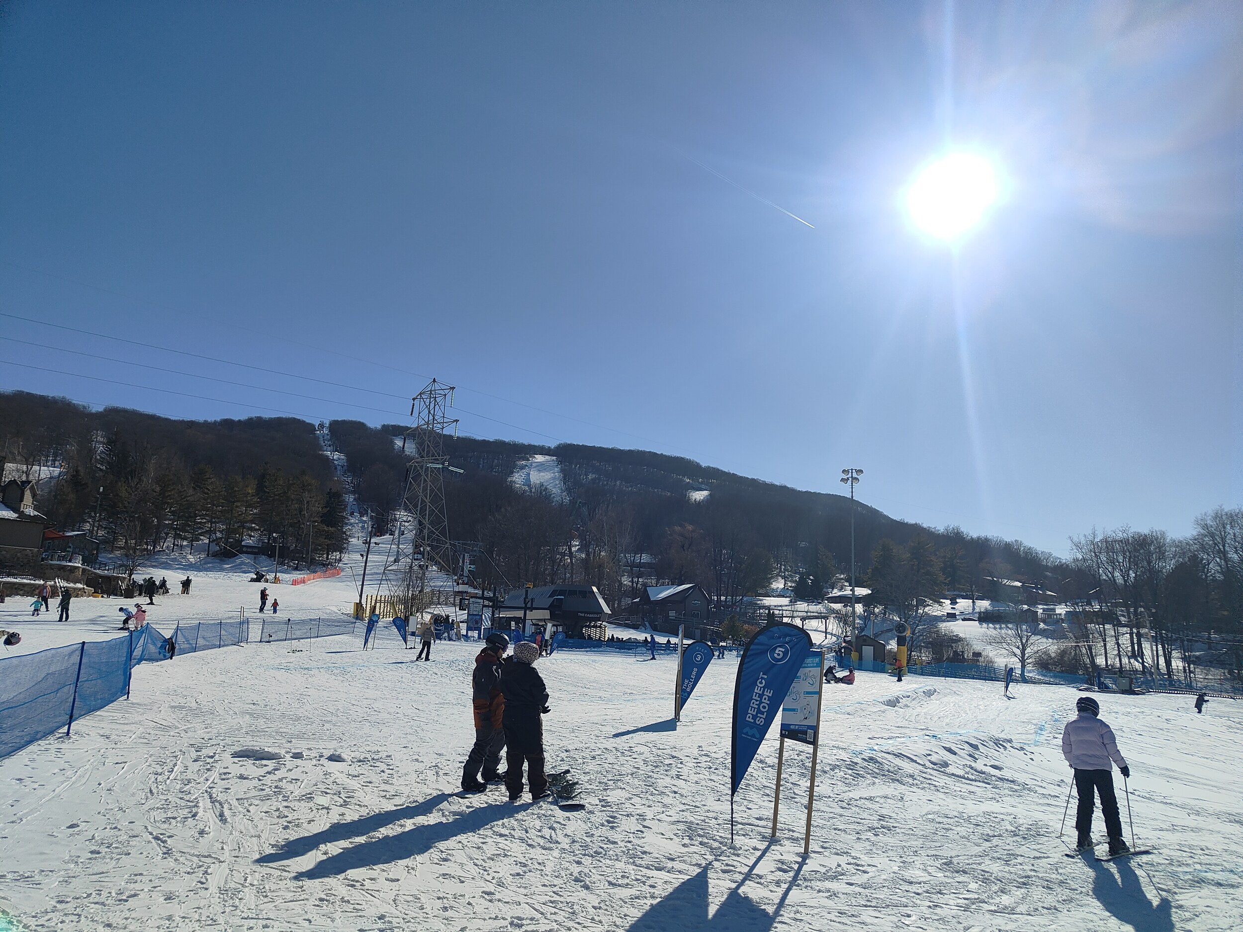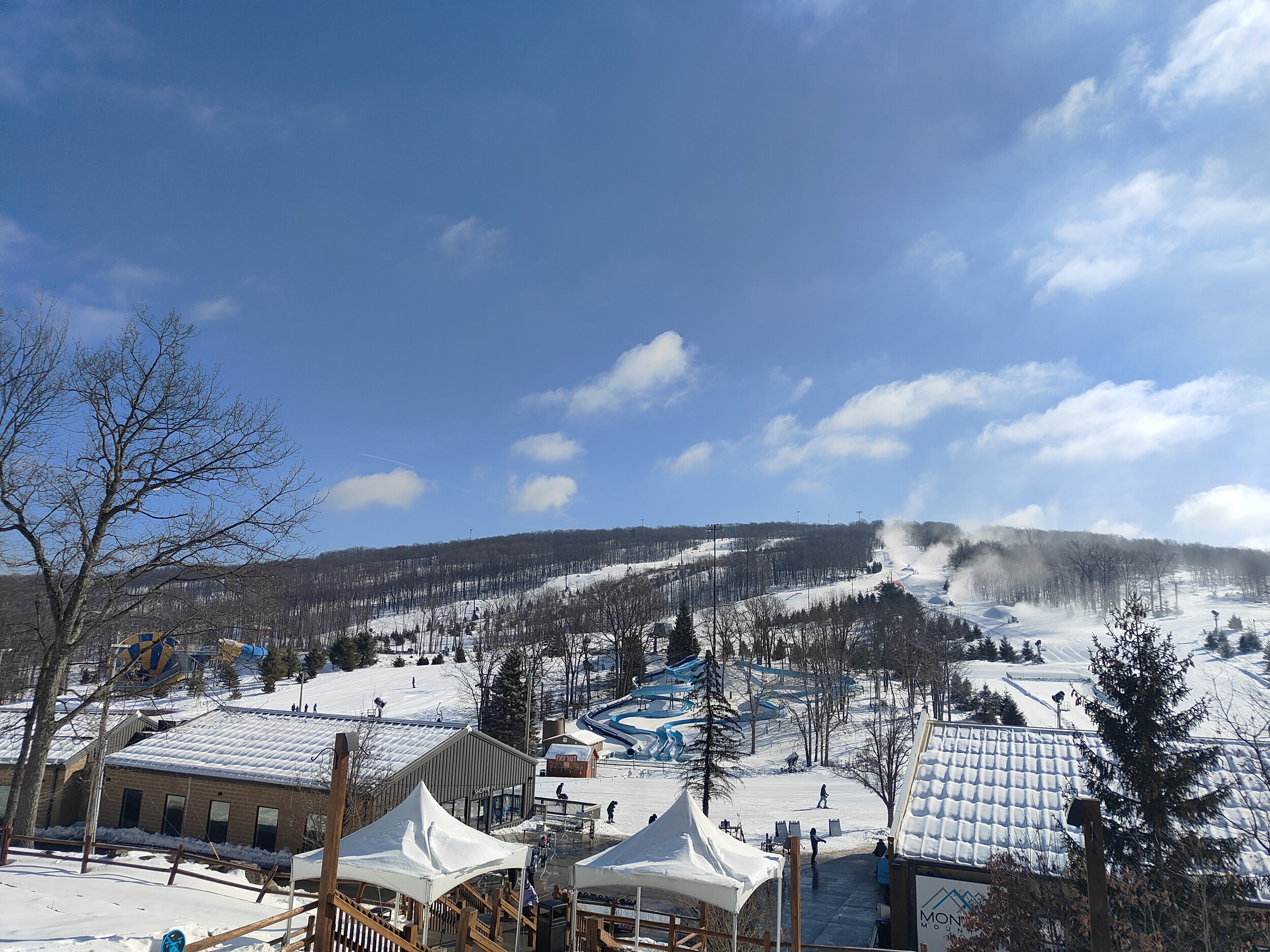 Rund eine halbe Stunde weiter liegt Camelback, in meiner Erwartung die heutige Nummer eins. Der Bergrücken zieht sich auch schon beeindruckend auf, als ich mich nähere. Es gibt viel Infrastruktur in Camelback, Hotels und Resorts sind zahlreich vorhanden, und die Waterpark-Elemente im Skigebiet zeigen deutlich auf, dass es drei weitere Saisons gibt hier. Es gibt einige spannende Pisten hier, vor allem der obere Bereich der Abfahrten ist eher steil. Dennoch, irgendwie hatte ich mehr erwartet, die Vibes hier erreichen mich nicht.