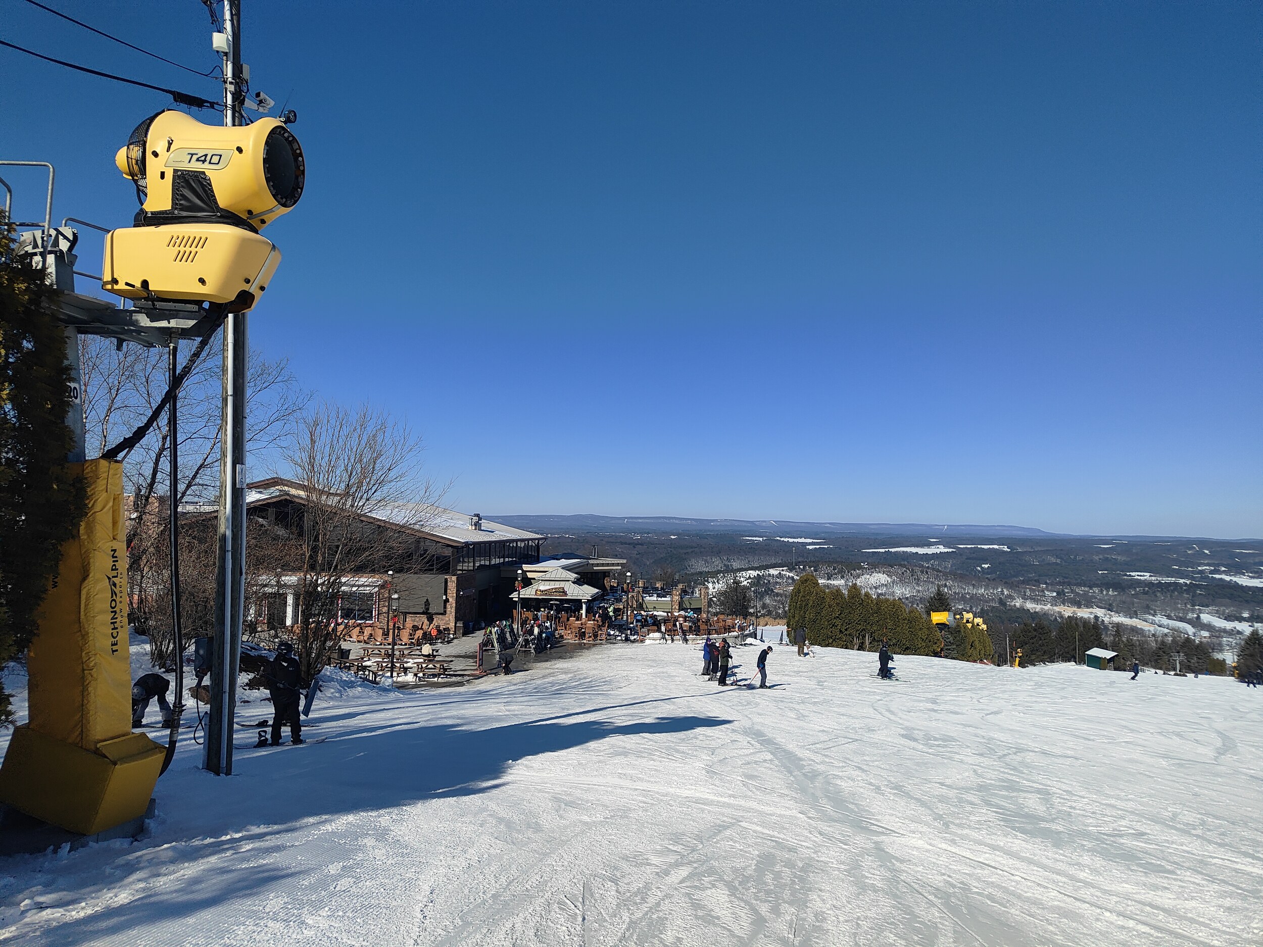 Irgendwie hat das Marketing von Blue Mountain bei mir nicht so gewirkt, ich wusste schlicht nicht was zu erwarten. Um so überraschter bin ich bei der Anfahrt zum Skigebiet: Keine Wasserrutschbahnen und Riesenhotels, nur eine an ein Expeditionscamp erinnernde schlichte Base Lodge vorne, dafür hinten einen um 100 Höhenmeter höheren Berg – eigentlich zwei Berge, weil Blue Mountain zwei relativ eigenständige (namenlose) Gipfel bedient. Bei einem davon – erreichbar mit dem Main Street Express, gibt es noch eine Summit Lodge mit Aussichtsterrasse und Parkmöglichkeit, Blue Mountain ist also von oben und unten erreichbar. Die Pisten bedienen jeden Geschmack und machen wieder Freude. Schön, darf ich dieses Skigebiet noch kennen lernen, bevor ich weiterfahre nach Scranton. Und dort gibt’s ja auch noch Highlights.