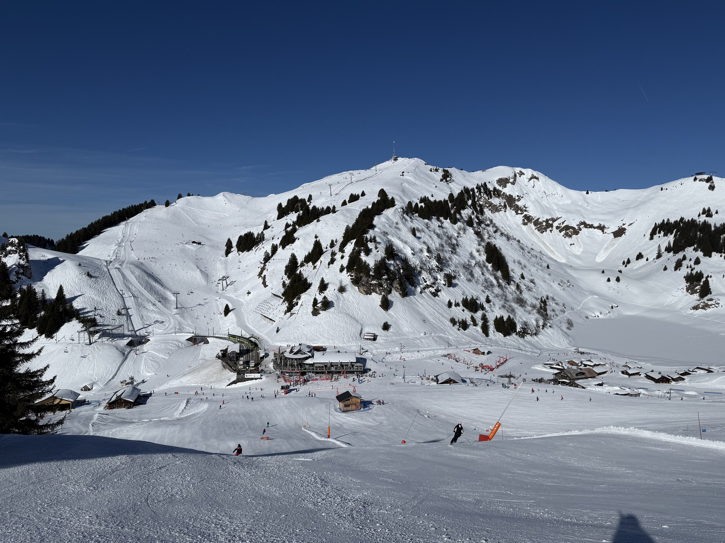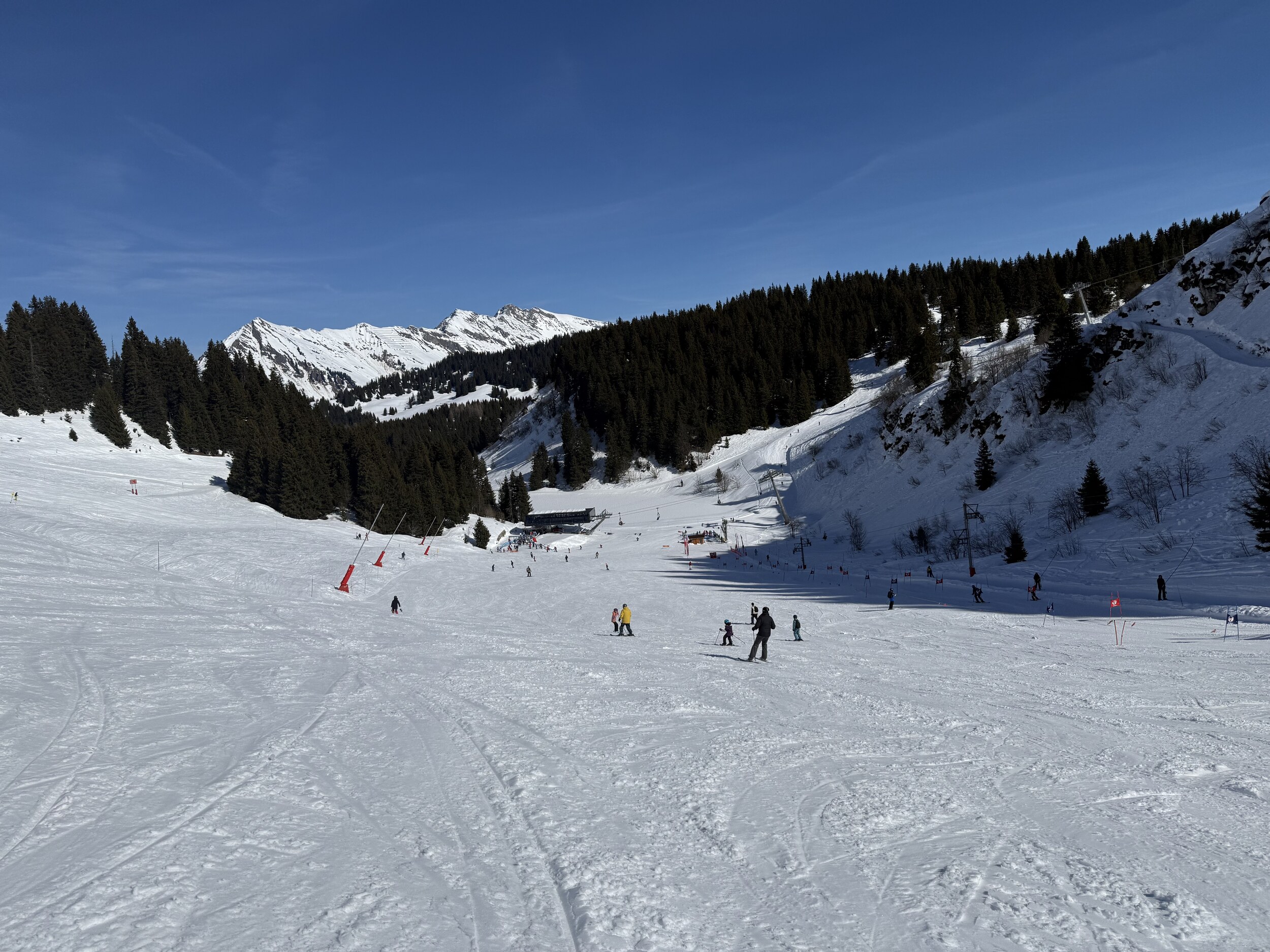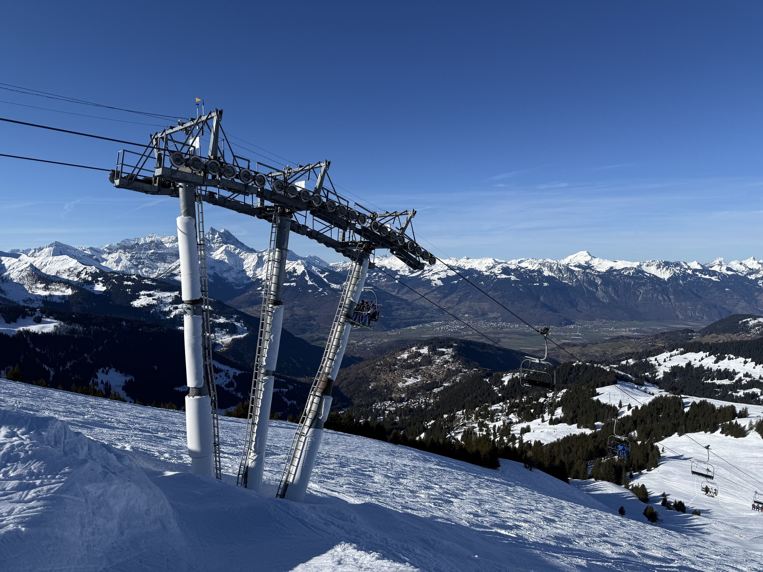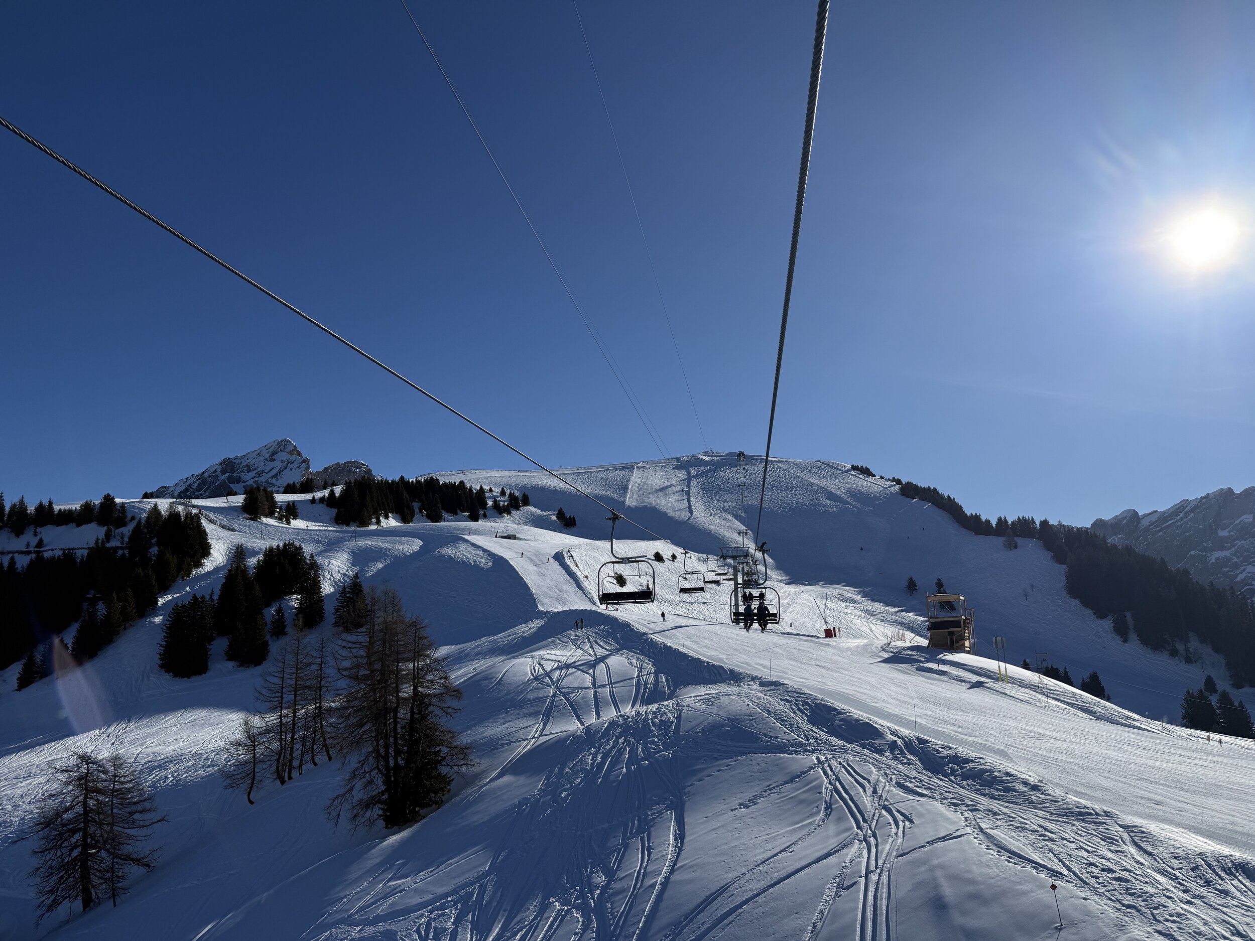 Am Chaux Ronde fahren wir direkt zur Verbindungssesselbahn. Die Pisten sind am morgen noch recht hart, aber in der Sonne weichen sie um 9 Uhr schon auf.