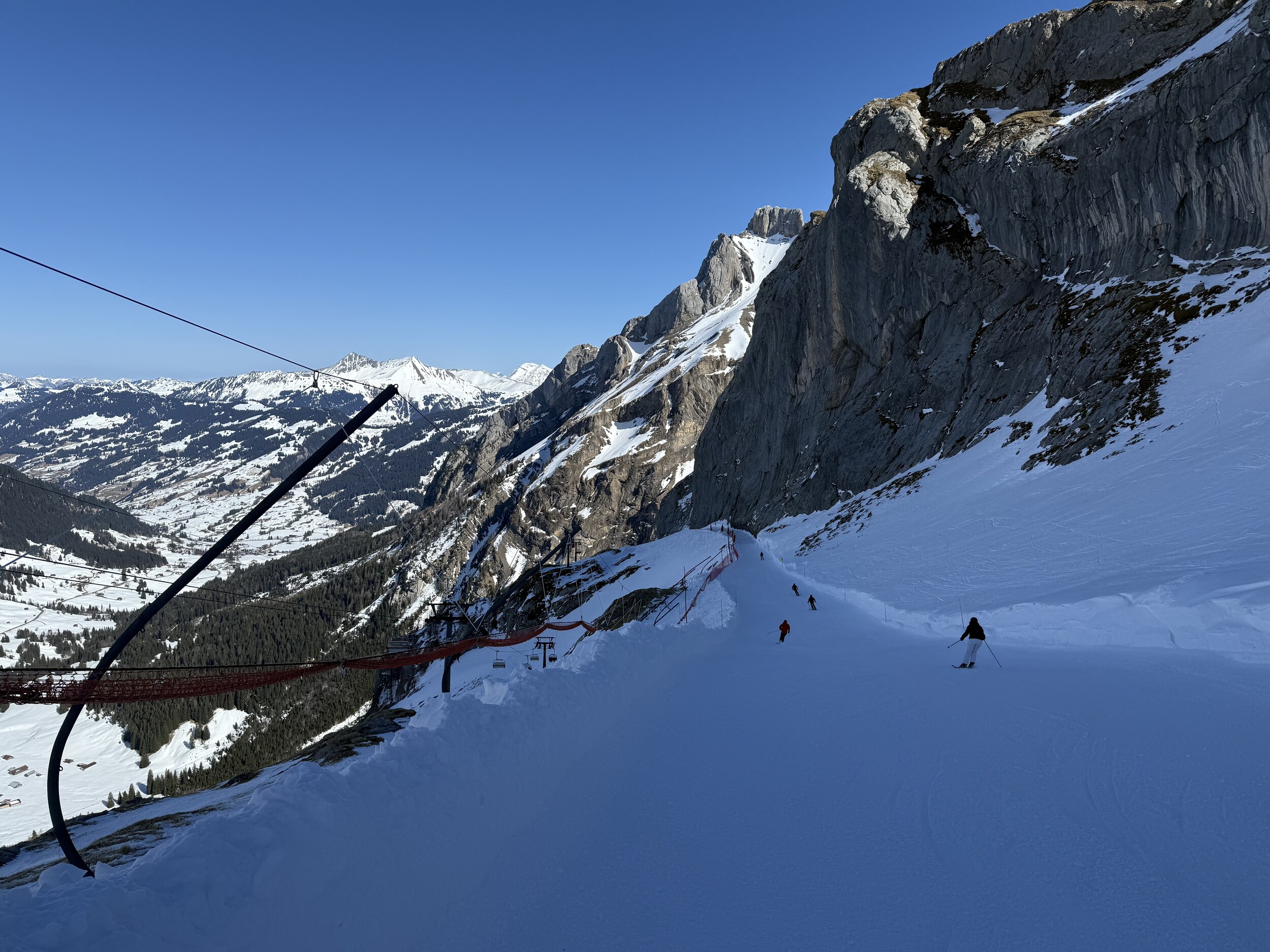 - An einer Stelle wird sie bekanntlich recht schmal, läuft dafür spektakulair am Fels vorbei. Willkommen im Kanton Bern übrigens, der dritte Kanton von dieses Skigebiet.