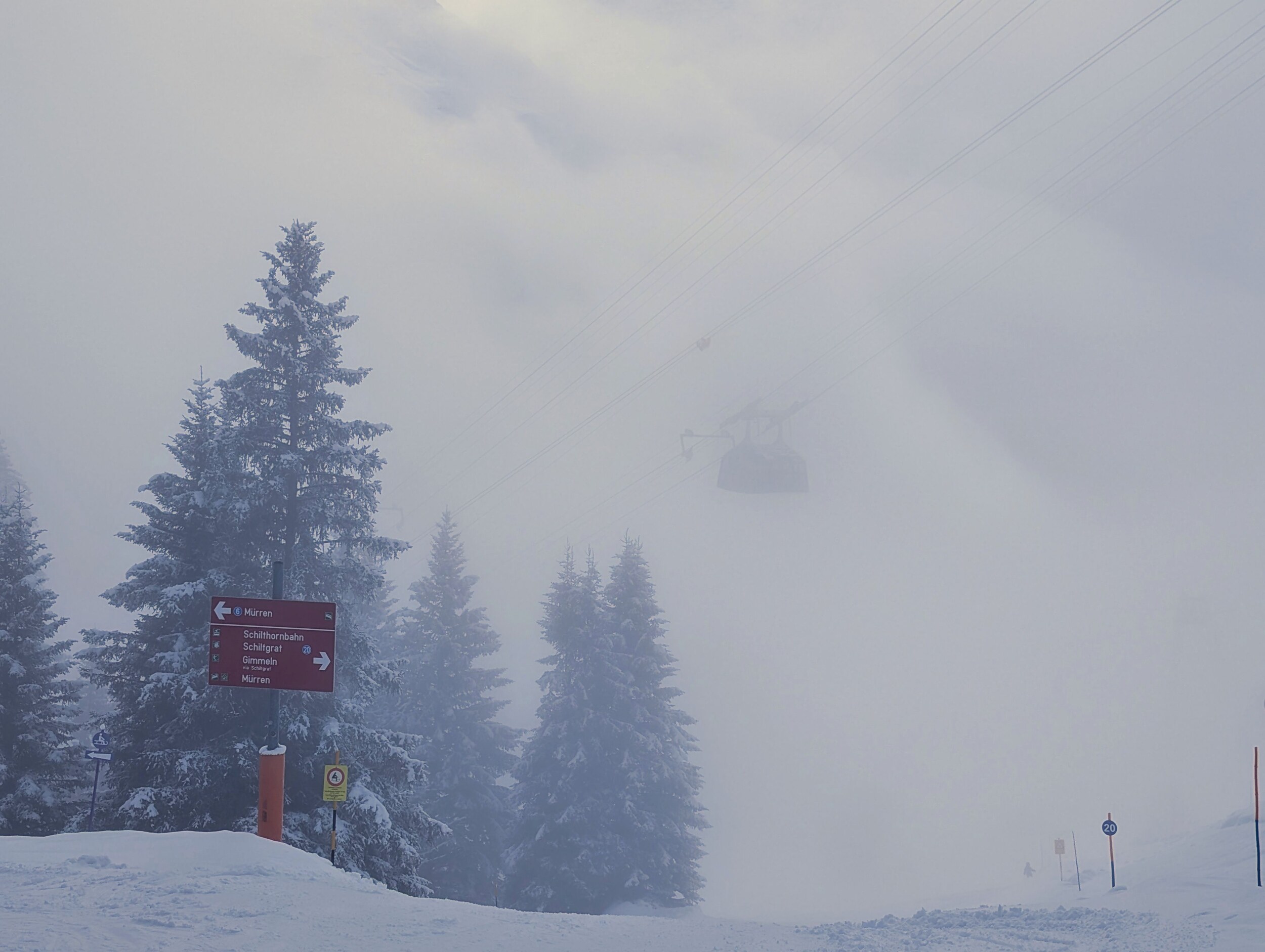 Da es keine P2P Wengen-Mürren gibt, geht es per Zug zuerst hinunter nach Lauterbrunnen, dann mit der BLM via Grütschalp zum Winteregg Sessellift. Über Nacht hatte es ca 10 cm Neuschnee gegeben und viele Pisten waren nicht präpariert. So wurden auch eigentlich einfache blaue Pisten zu einem Problem für weniger geübte Fahrer. Im unteren Teil des Gebietes war am Morgen nicht viel Sicht, aber kurz vor dem Schilthorn wurde es besser. Für den Thrill Walk hatte ich heute keine Zeit. Für ein Mittagessen und eine Runde im Drehrestaurant habe ich mir aber Zeit genommen. Die Piste vom Gipfel war am Morgen etwas einfacher zu fahren als am Nachmittag mit vereinzelt eisigen Stellen. Die Sicht wechselte zum Teil innerhalb von Minuten von mager zu interessant. Neben dem obersten Teil hat vor allem auch die Abfahrt vom Schiltgrat heute viel Spass gemacht. Auf dem Rückweg zur Winteregg gab's dann noch die Sicht auf Wengen und das Skigebiet von gestern.