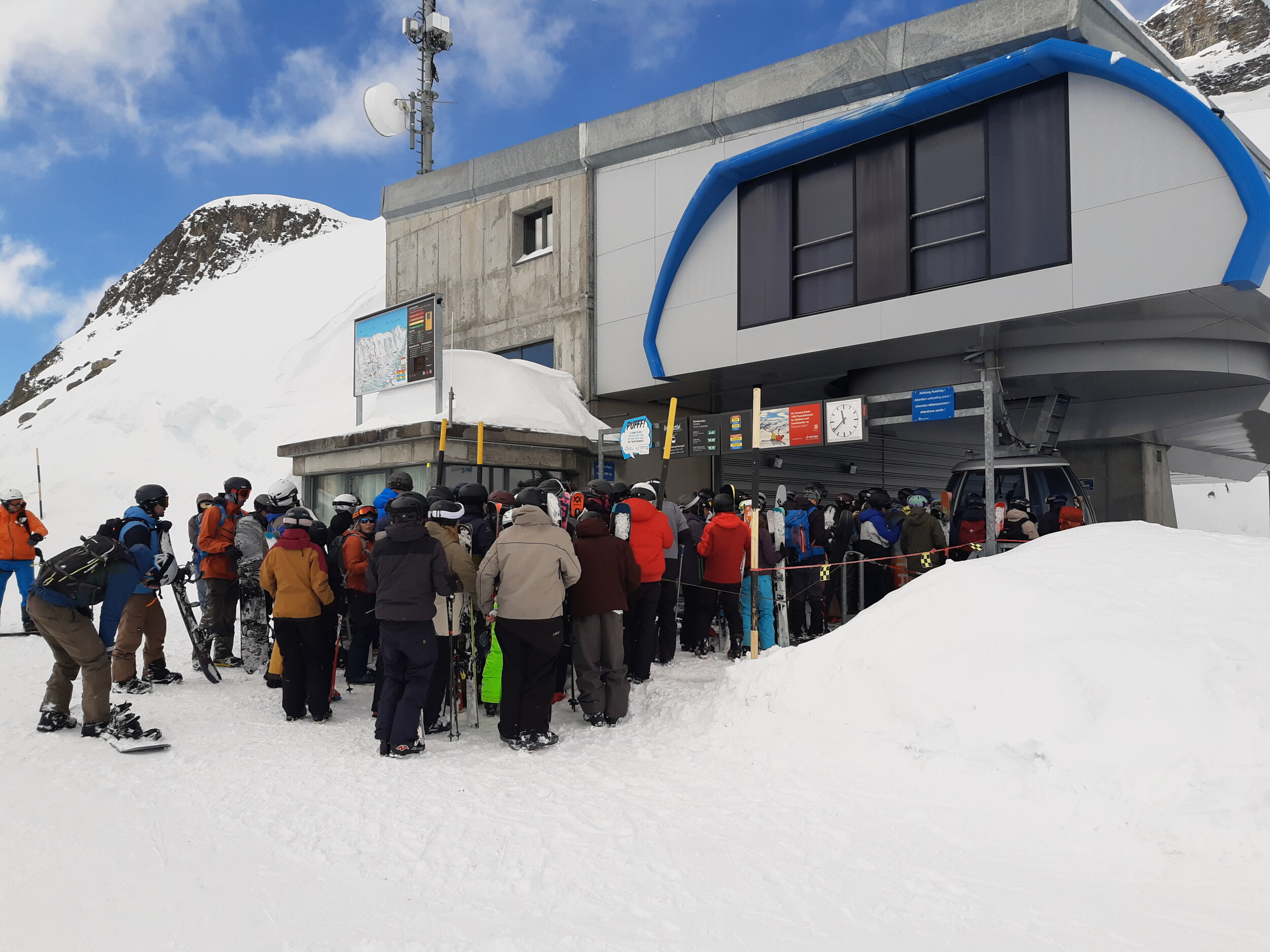 Viel los war nicht. Bei gutem Wetter, Sonntag, MagicPass... Nur als die Gondel öffnete war eine Schlange dort entstanden, weil alle gleich hoch wollten. 30min später konnte man dann den ganzen Tag ohne anstehen hochfahren.