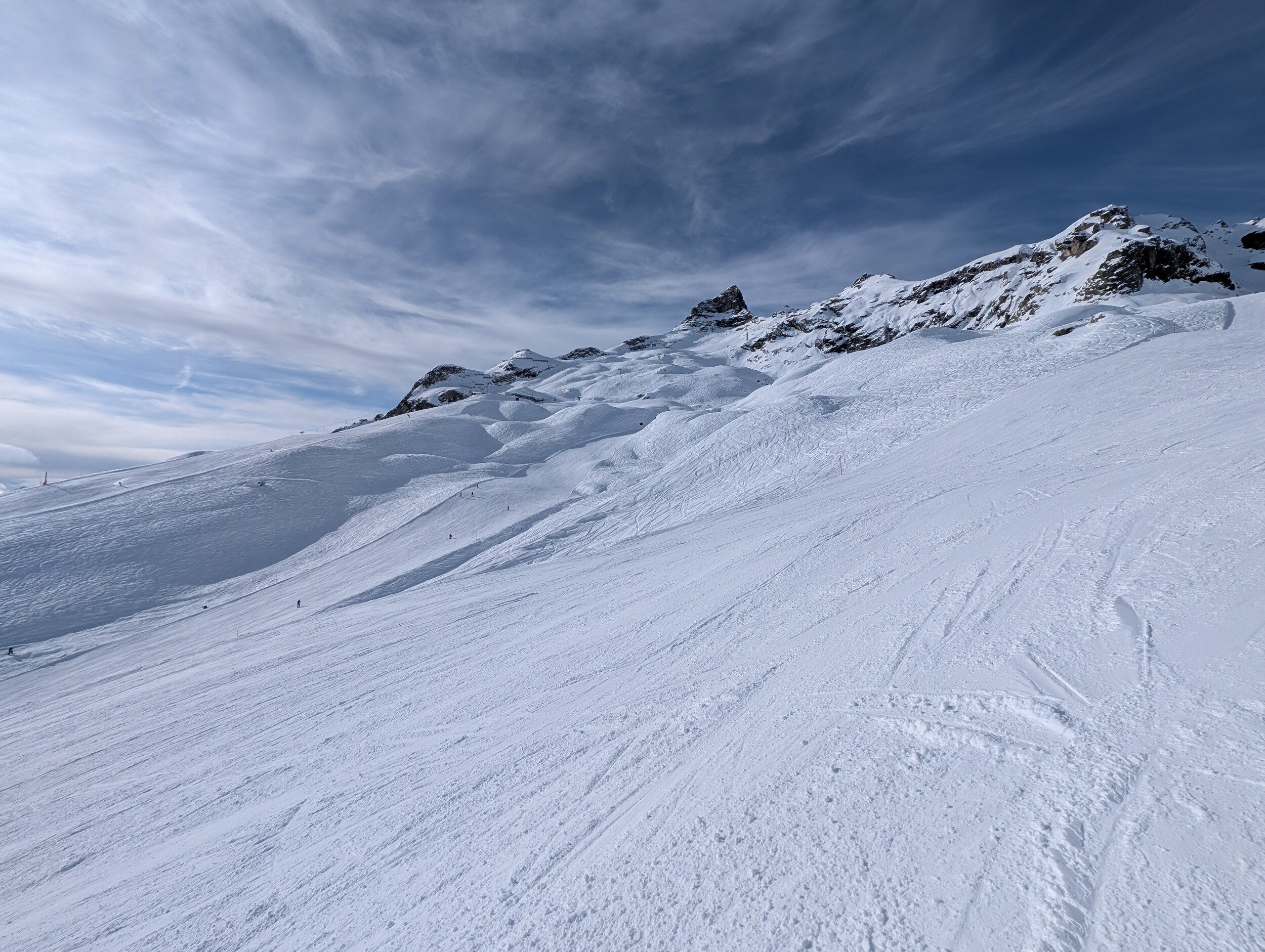Heute kaum Leute auf den Pisten und mild, zuoberst ziemlich windig.