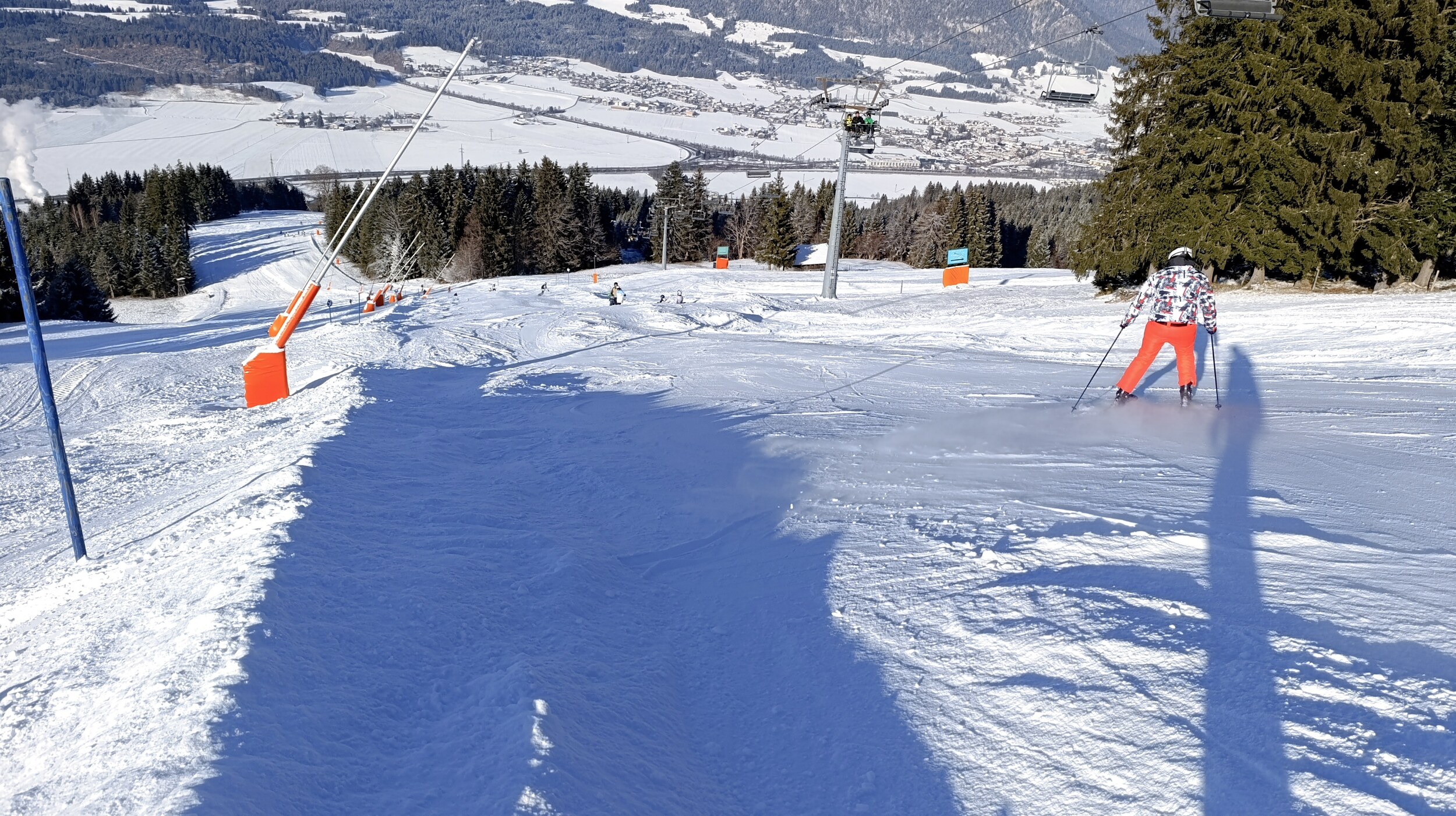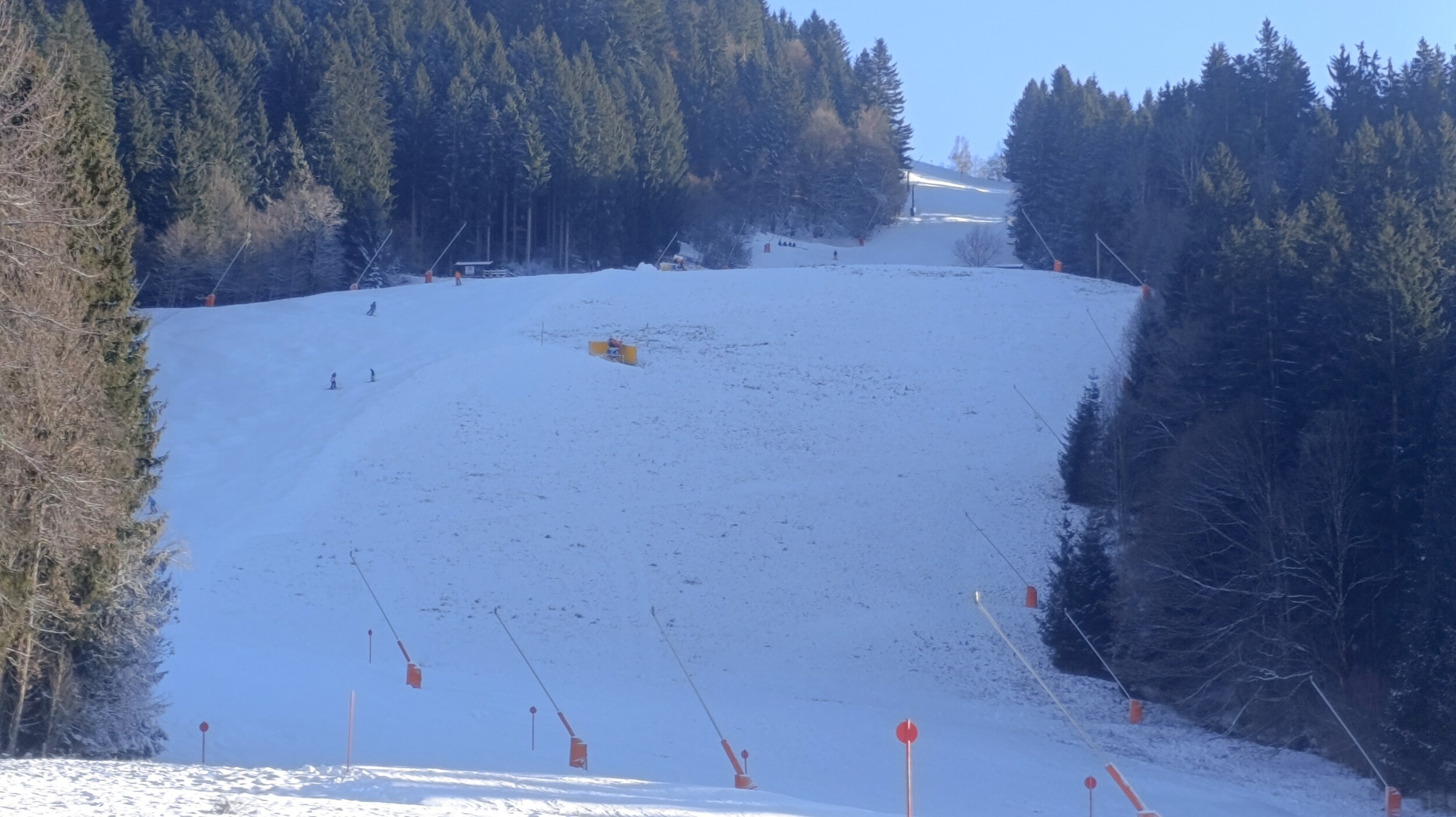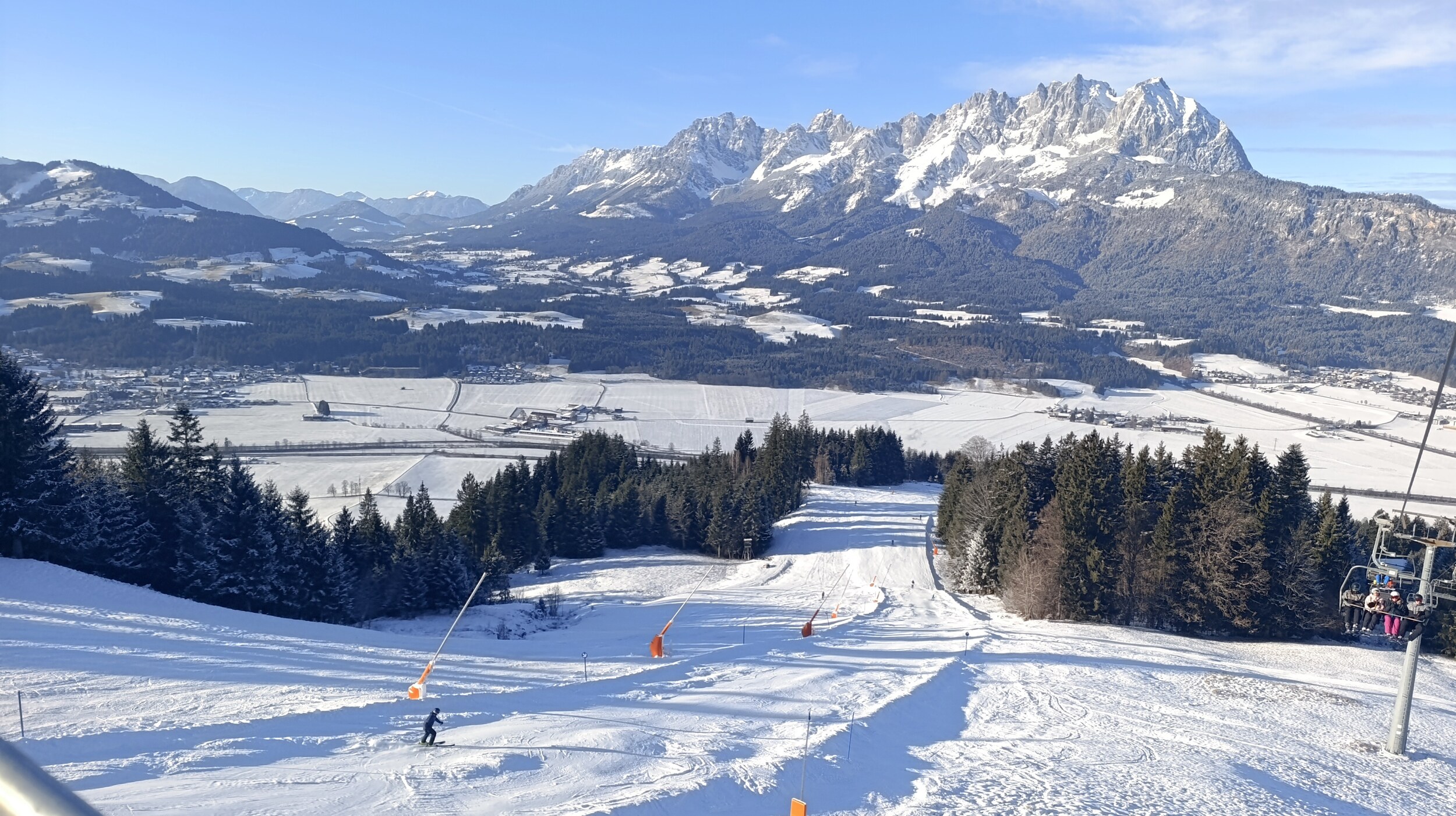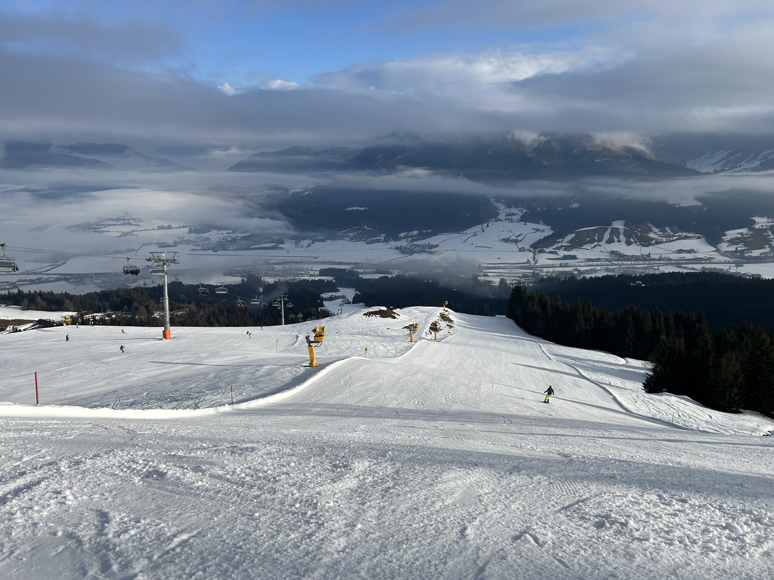 Die blaue 4c von der Talstation Jodlalm zur Talstation Harschbichl war auch offen (oben am Einstieg Warntafel: Achtung Schneemangel oder so). Ein wenig braun, aber auf den Wiesen unproblematisch. Die ist offenbar unbeschneit? Schon ein komischer Januar - man kann auf Naturschnee bis auf 680 m ins Tal fahren, während gleichzeitig unbeschneite Pisten auf 2000 m und mehr nicht geöffnet werden können: