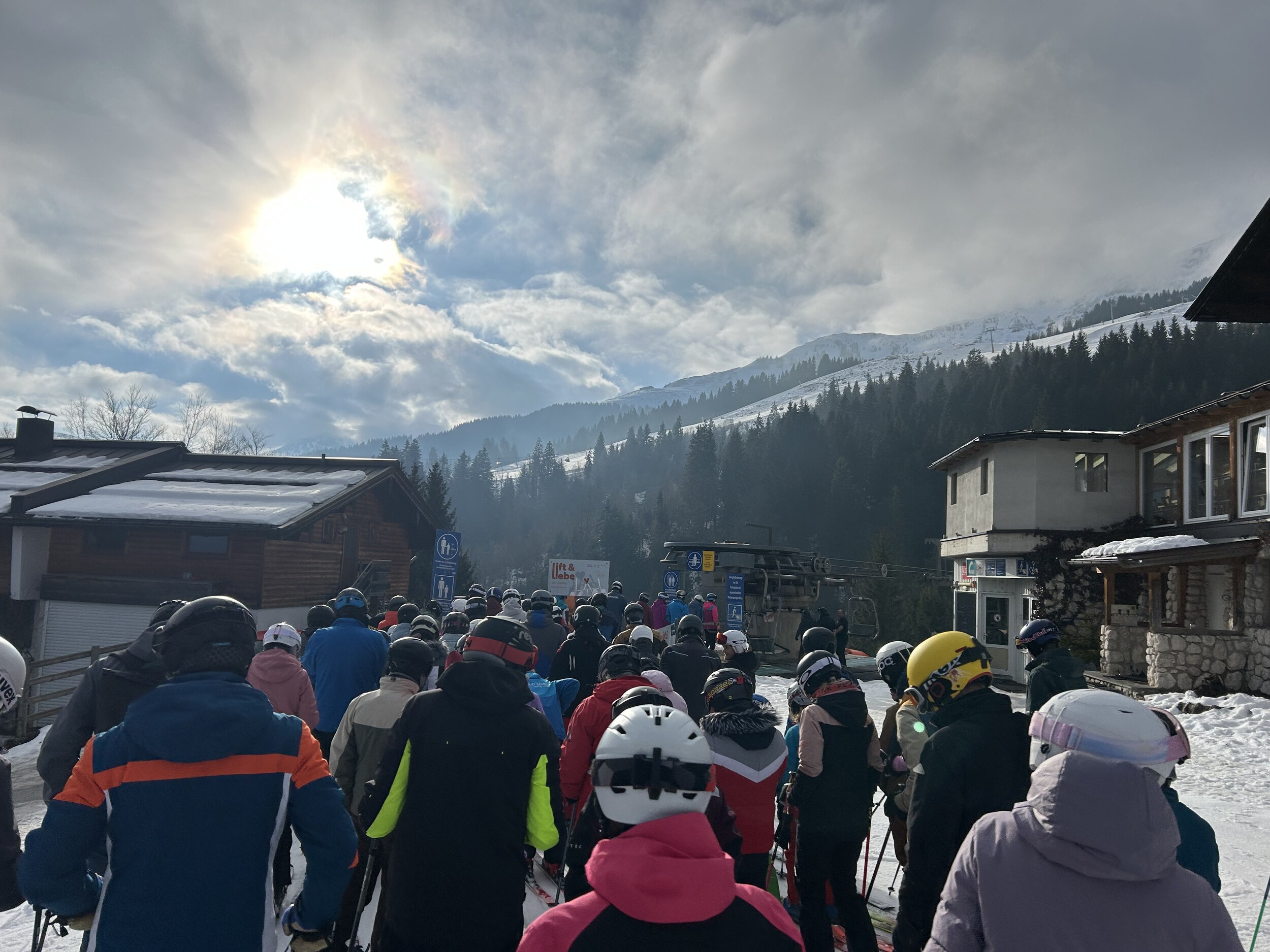 Bereits in der Früh um 9 Uhr habe ich 13 Busse gezählt und der Parkplatz hier war ziemlich voll. In der Früh dann noch etwas anstehen bei Gondel und 6er Sessel ungefähr bis 10:30. Danach keine Anstehzeiten mehr. Sogar öfter alleine im Lift.