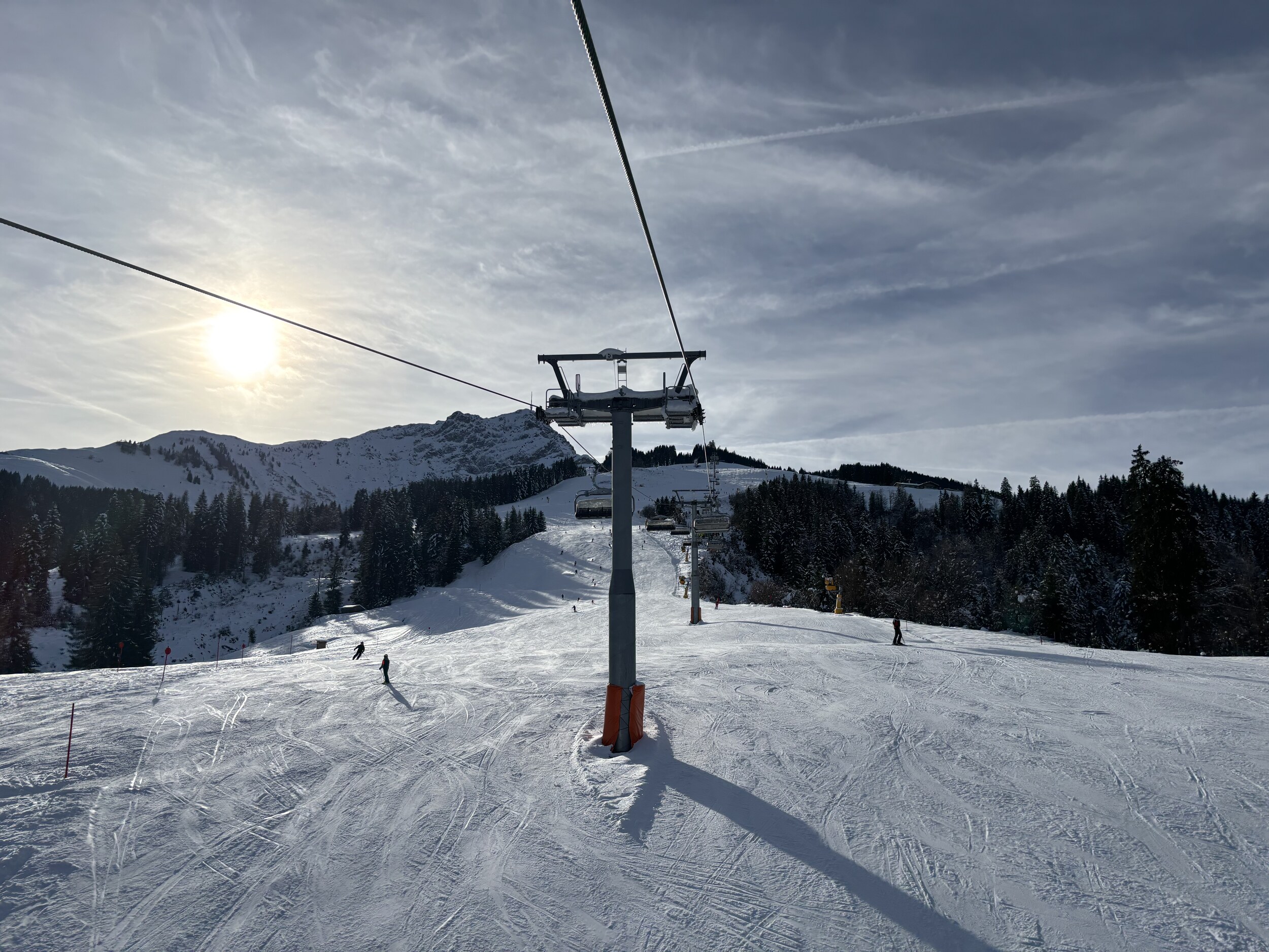 Heute morgen hatte es hohe Bewölkung, dadurch sehr diffuse Sicht. Die Pisten waren morgens schon weich und teilweise knollig. Dadurch am Vormittag eher schwierige Verhältnisse. Gegen Mittag kam dann die Sonne raus, die Sicht wurde besser. Durch den wenigen Andrang ging es am Nachmittag dann super zum fahren. Mit den entsprechenden Kanten ging es auf dem abgerutschten Untergrund besser als am Vormittag auf den weichen Pisten.