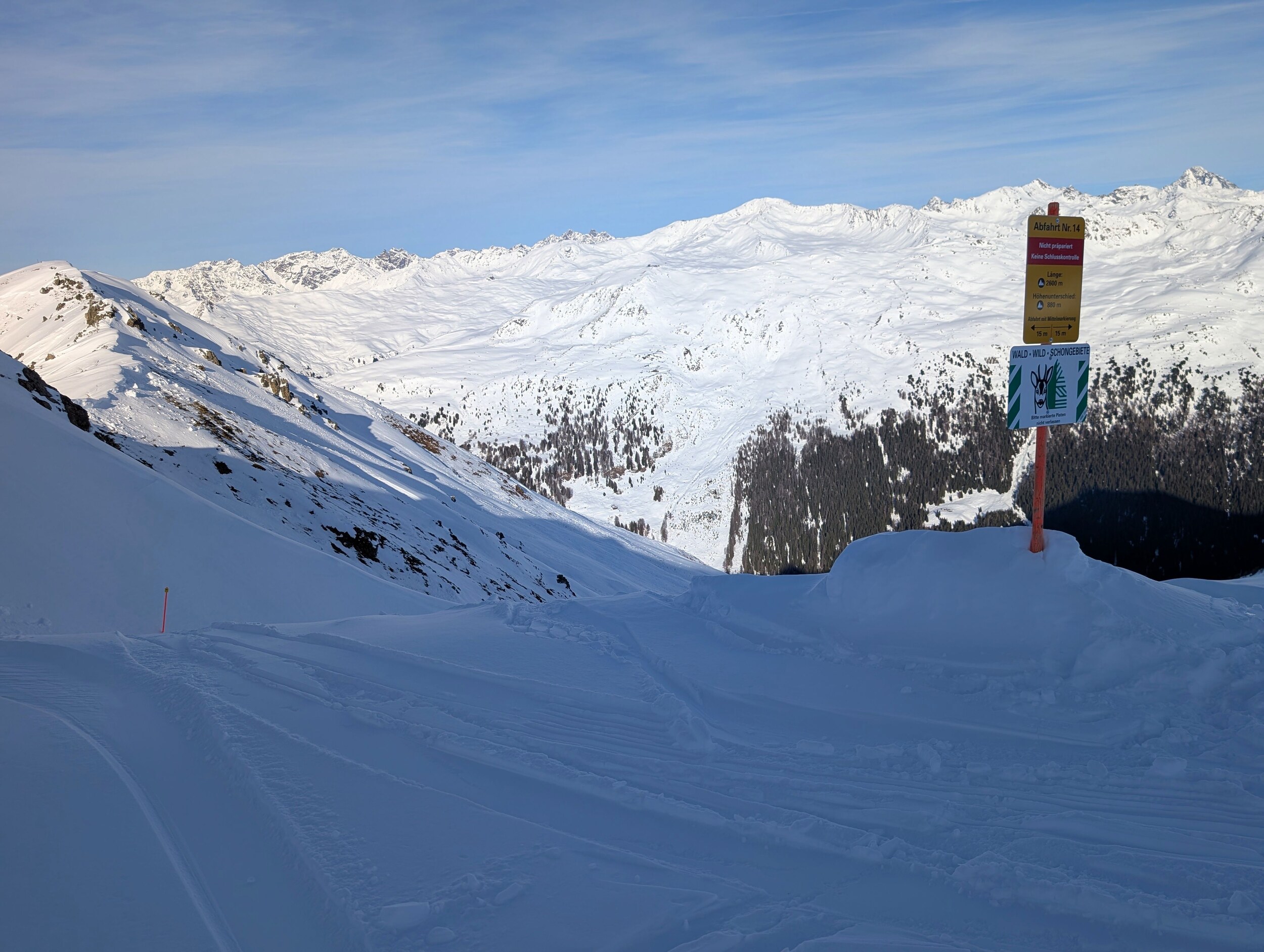 Erstmals die Ruchläger-Piste beim Glatteggen für mich: Leider führt die Ruchläger-Piste nicht direkt zum Glatteggen: Der Zugang momentan nur von der Bärnet: Meine erste Fahrt, ich weiss gar nicht, ob ich den schon mal gefahren bin: Die Ruchläger-Piste ist schon ein Mehrwert fürs Skigebiet, viel interessanter als die Piste beim Skilift Madrisa. Eigentlich hätte man diese Piste auch ohne Glatteggen-Lift machen können.