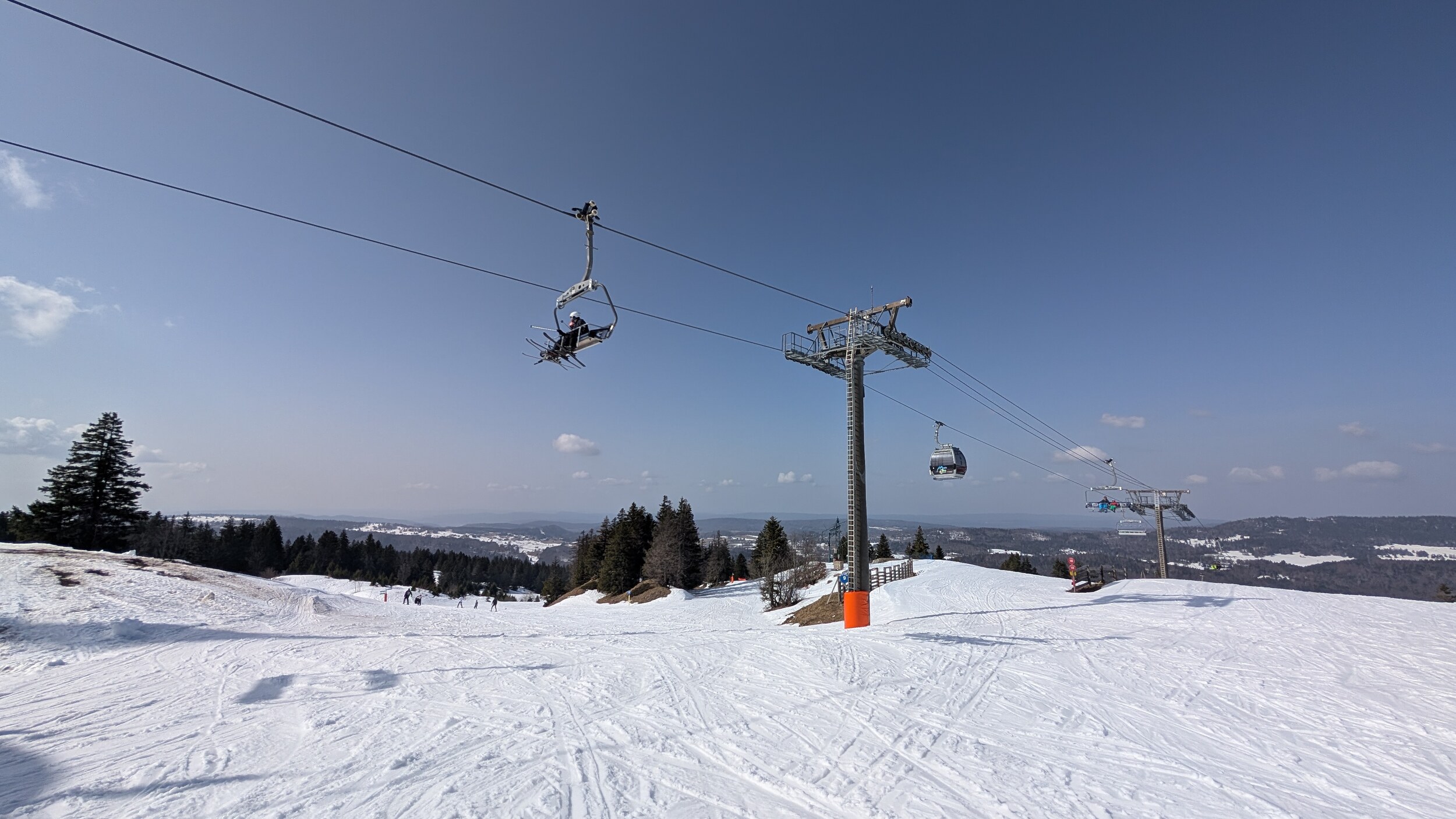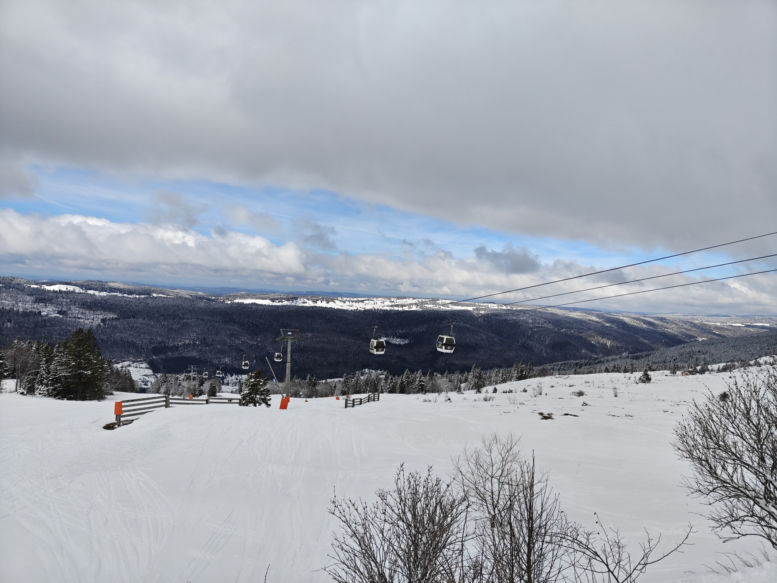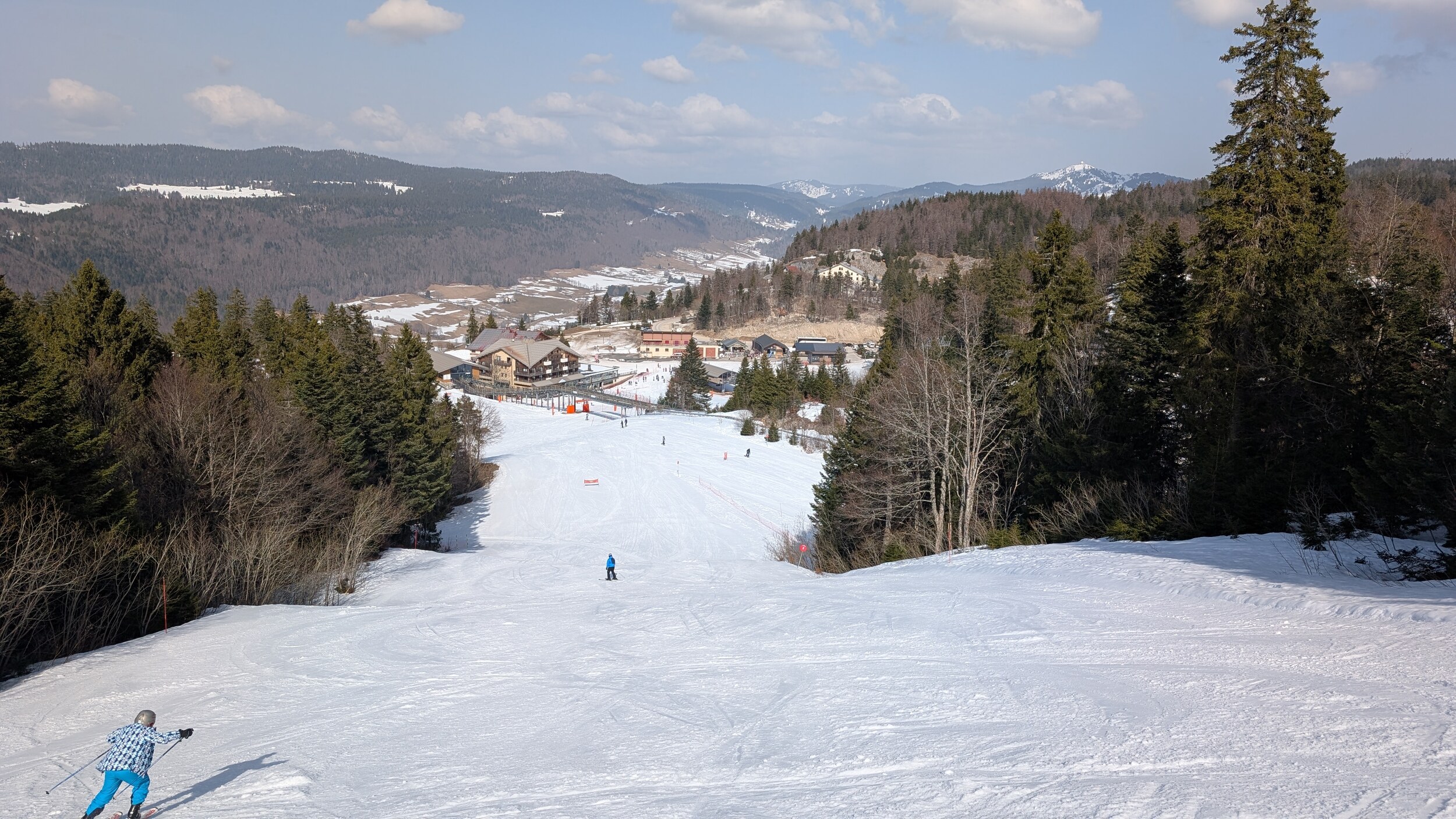 Ich war heute mal wieder im Jura unterwegs. Ein Tag Skivergnügen für 37 Euro - ein Traum. Dank Neuschnee von gestern Sonntag waren praktisch alle Pisten geöffnet und auch neben der Piste die Bedingungen gut. Ich hätte nicht gedacht, im März nochmals solch winterliche Bedingungen im Jura vorzufinden. Inzwischen bin ich ein wirklicher Mittelgebirgsfan, ich mag das „lockerere“ Skifahren. Vom Höhenunterschied her ist es wohl das interessanteste Gebiet im Jura und mich beeindrucken die Landschaft der Haute-Chaîne sowie der Blick Richtung Mont Blanc jedes Mal aufs Neue. In nächster Zeit stehen im Gebiet einige Veränderungen an: Die beiden Kabinenbahnen werden ersetzt und die Beschneiung im Gipfelbereich wird noch leicht ausgebaut.