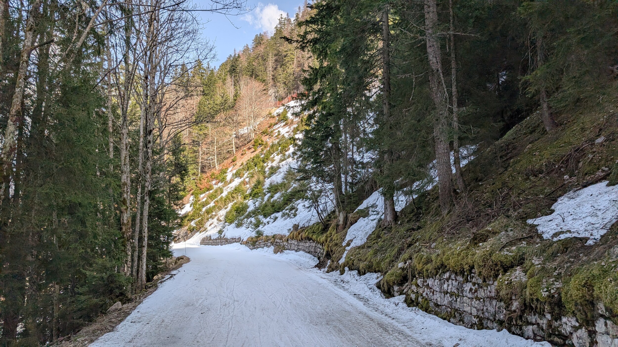 - Und kurz vor 16 Uhr trete ich die Talabfahrt an, um noch rechtzeitig in Genf für die drei Stunden Wellness Karte in einem Bad zu sein was um 20 Uhr schließt. Die direkte Talabfahrt die mich bis zum Auto bringt ist gesperrt aber egal ich fahre einfach durch, von unten habe ich gesehen dass der Schnee bis unten reicht.