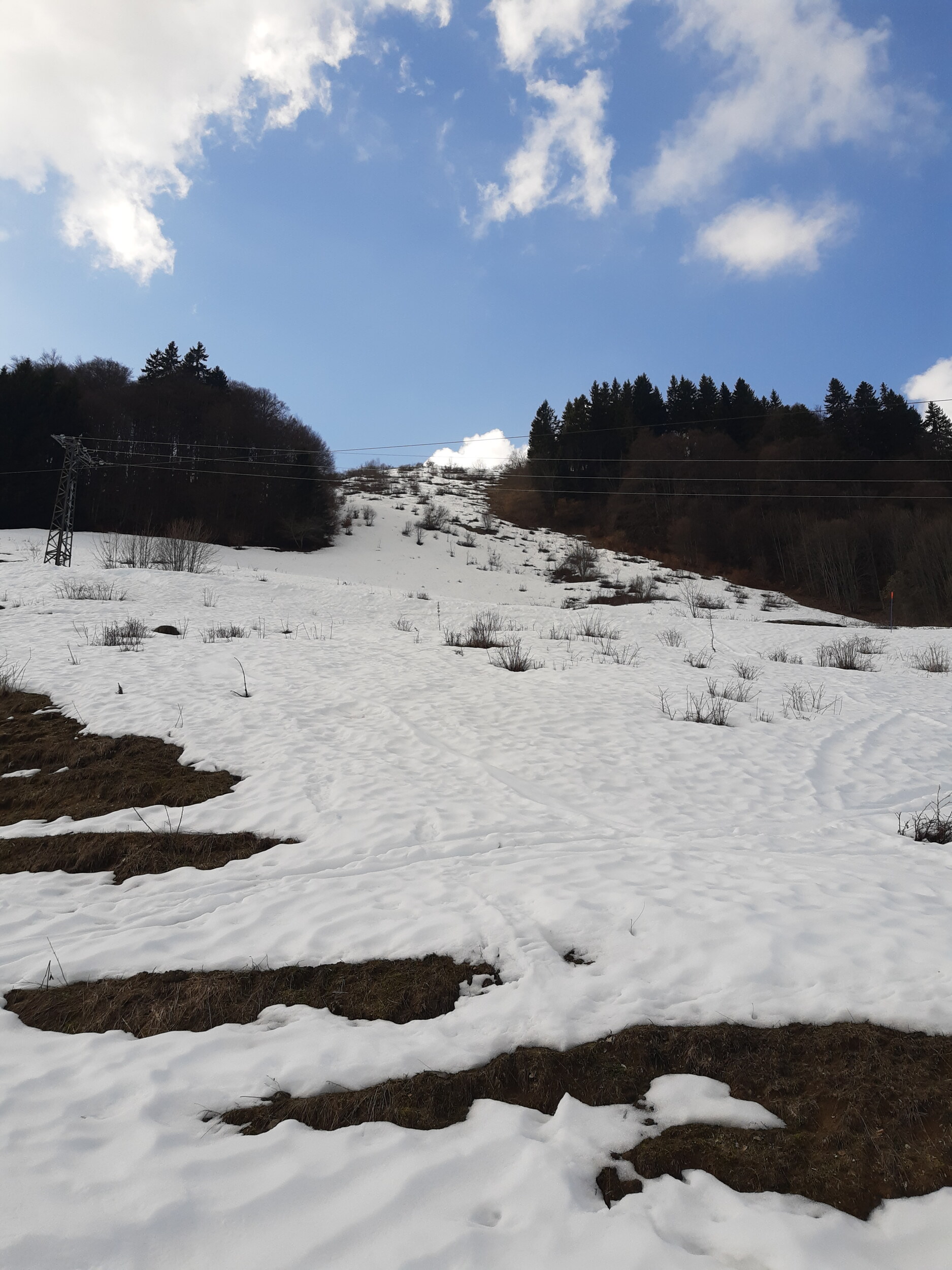 Oben hat es genug Schnee, es liegt bestimmt 1m. Hier ist man auch mal mit der Raupe drüber, und trotzdem reicht es nicht, denn die Piste ist nicht gepflegt. Es ragen immer noch 1m über den Schnee Himbeeren und kleine Sträucher heraus. So kann man natürlich nicht öffnen, egal wie viel Schnee liegt.
