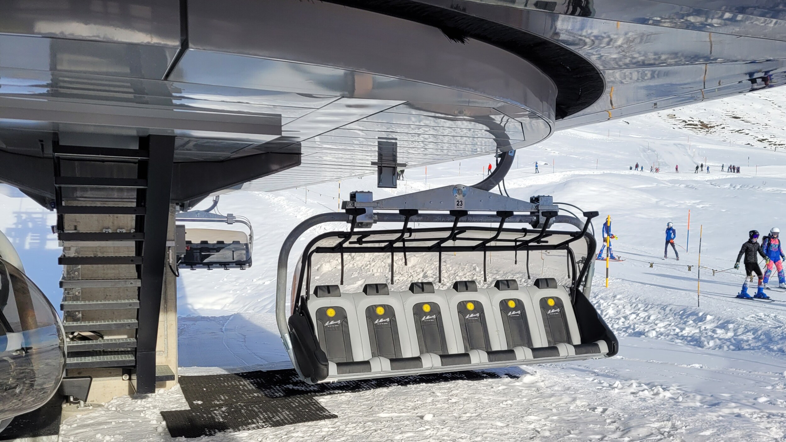 Auf dem PP in Celerina warten die Sessel für den Lej da la Pesche Lift auf ihren Transport zum Einsatzort. Sieht durch die Abdeckung nicht schlecht aus.
