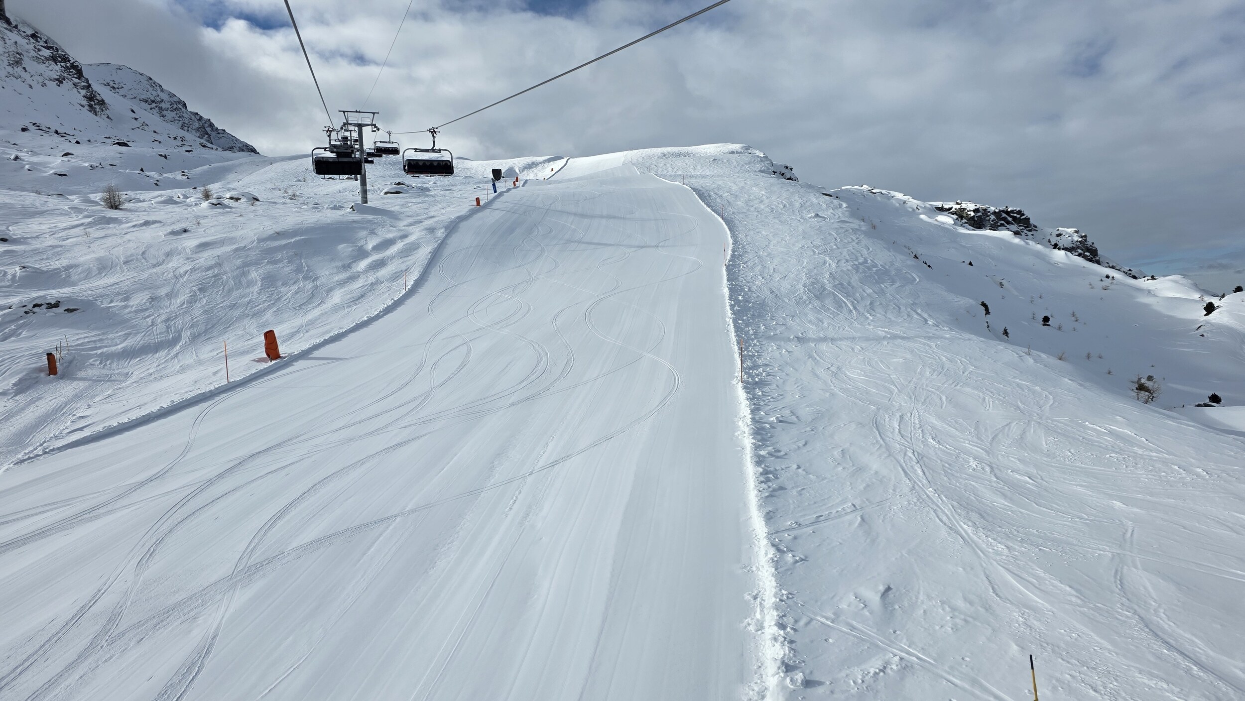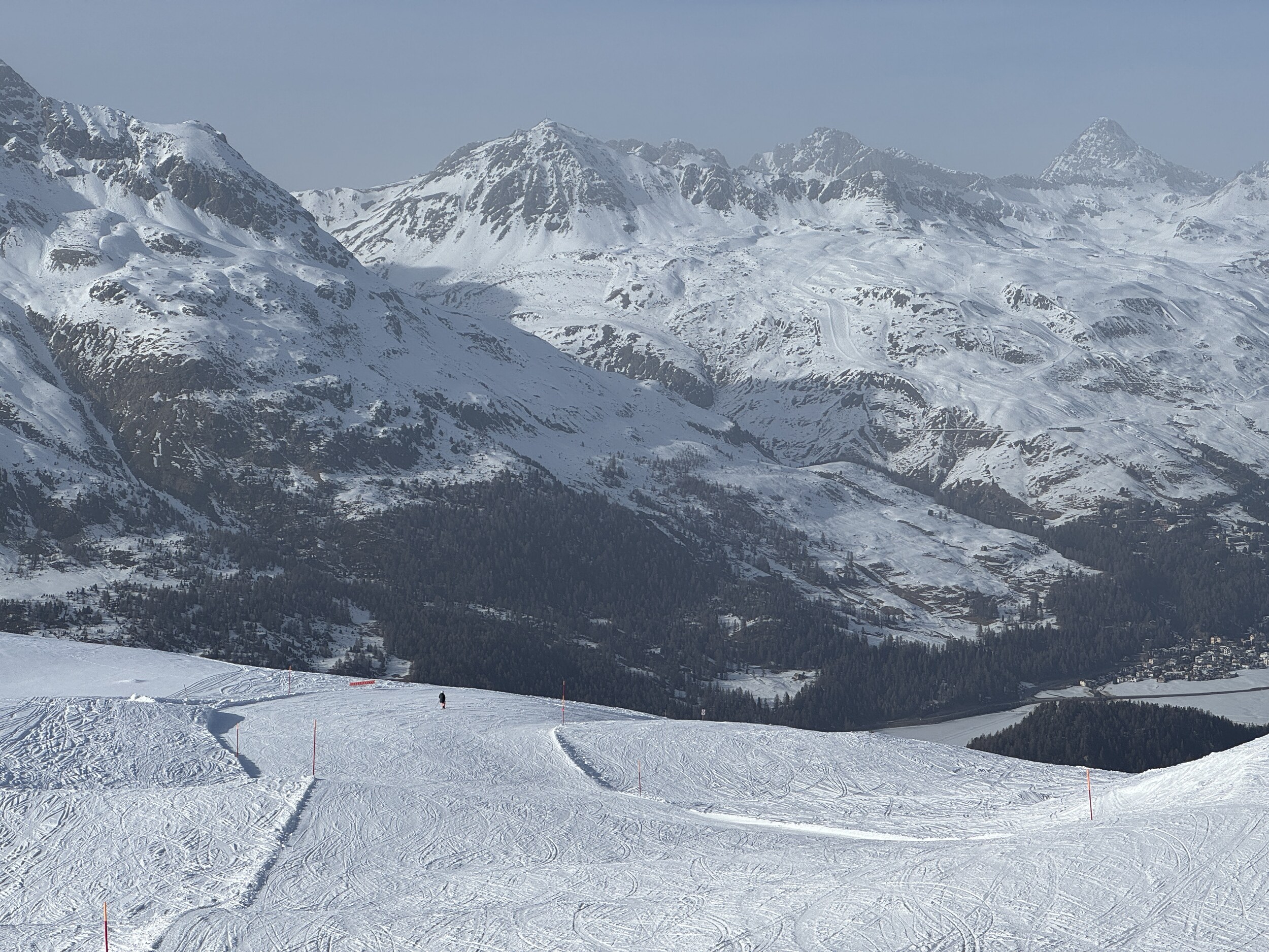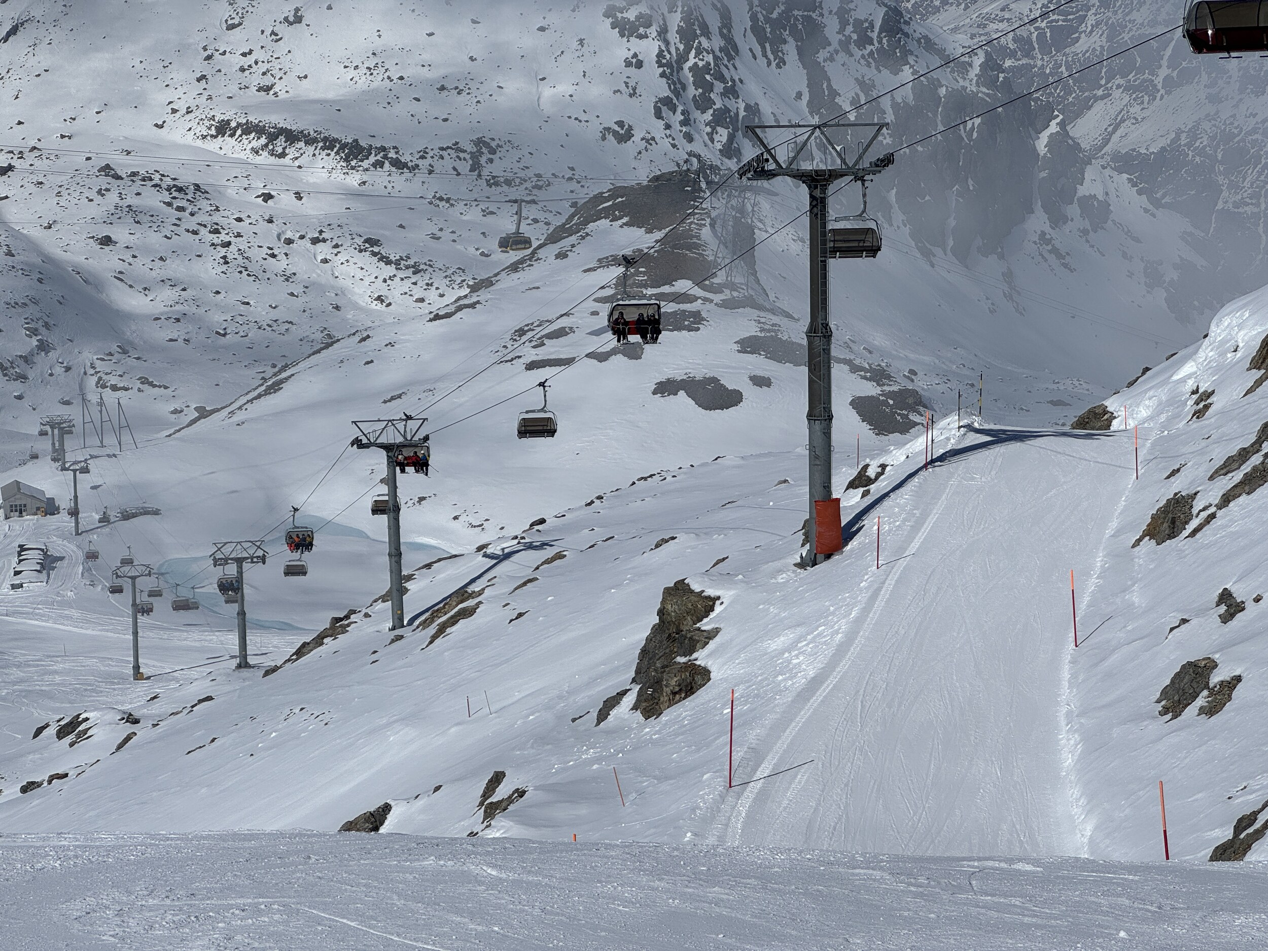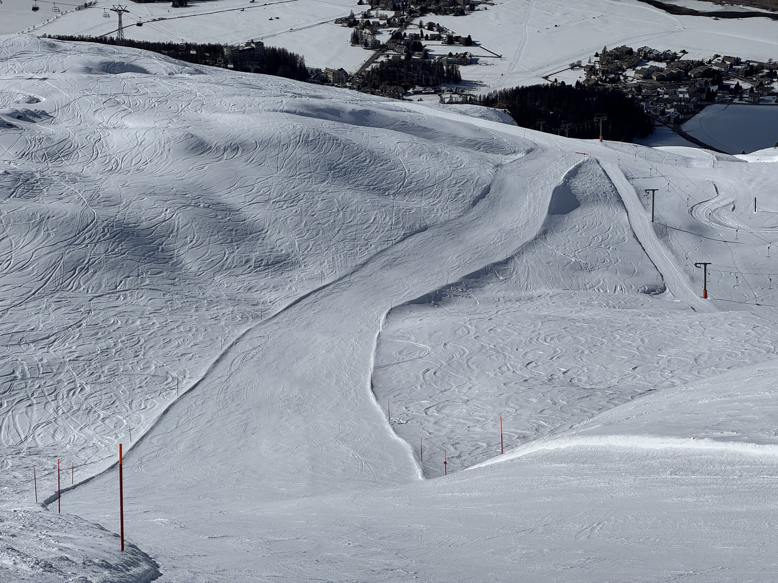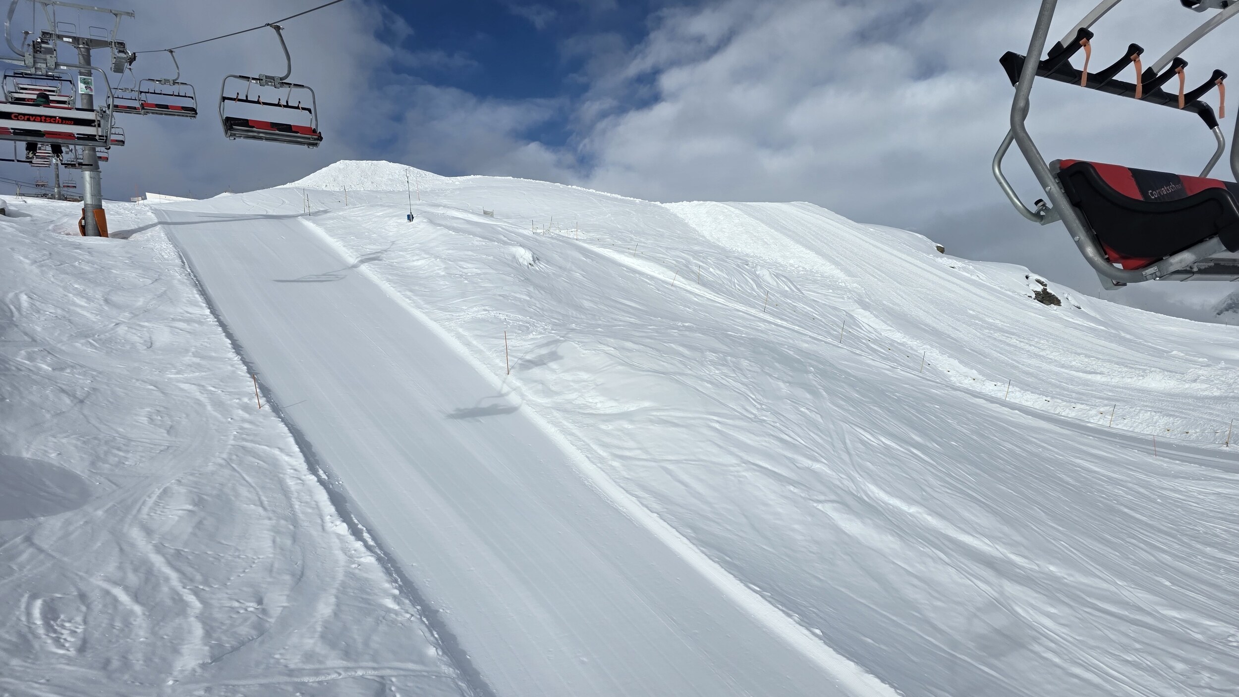 Heute dann Corviglia. Viel Pistenrasen, wenig Bilder trotz Postenkartenpanoramen. Deutlich mehr Betrieb als auf der anderen Seite, aber trotzdem leere Pisten und kein nennenswertes Anstehen. Aber man merkt hier den Pisten am Nachmittag zumindest an, dass sie befahren wurden. Die mit neuen Haubsesesseln ausgestatteten alten von-Roll KSB gefallen mir sehr. Warum geht das in Furtschellas nicht?