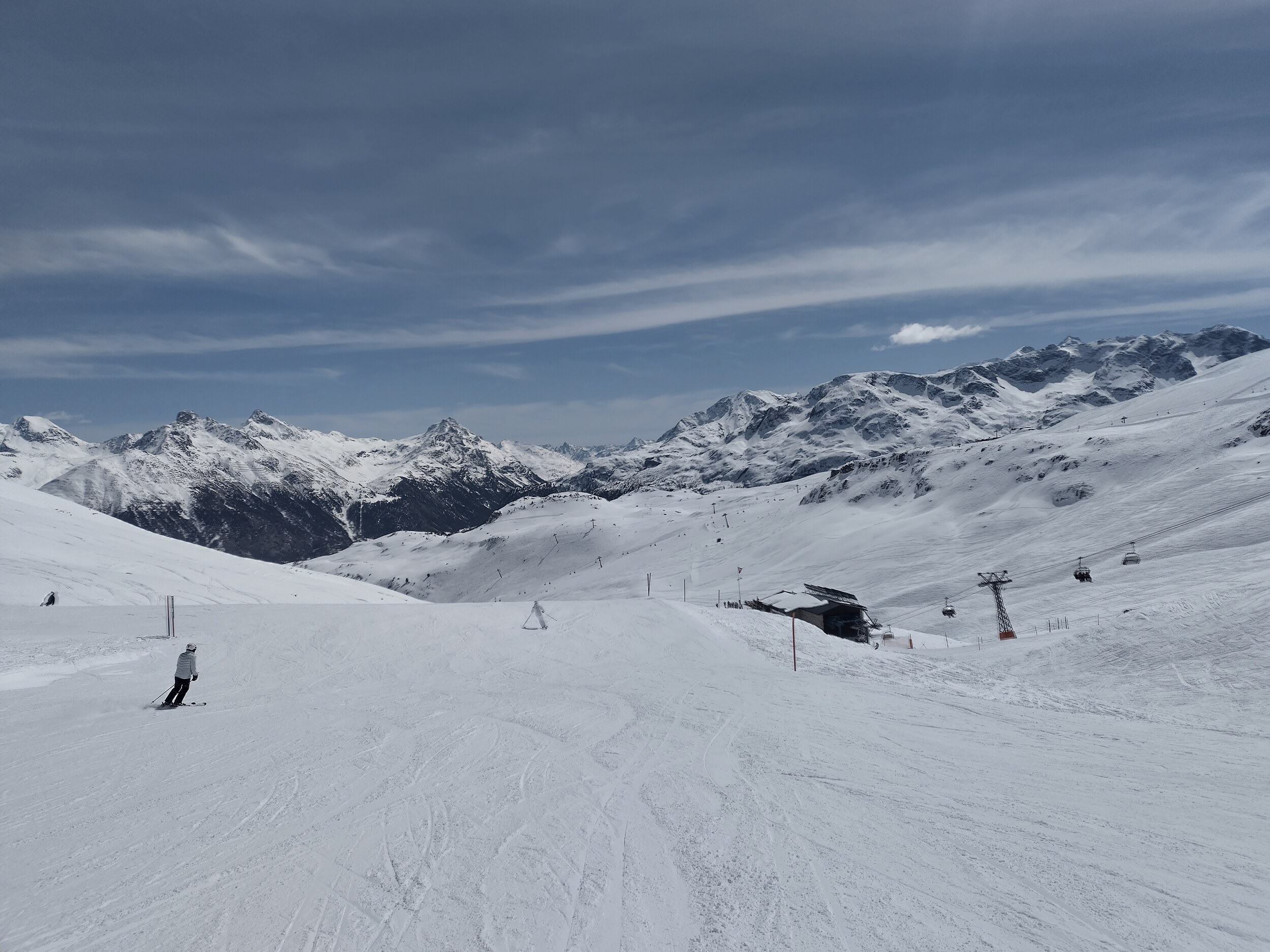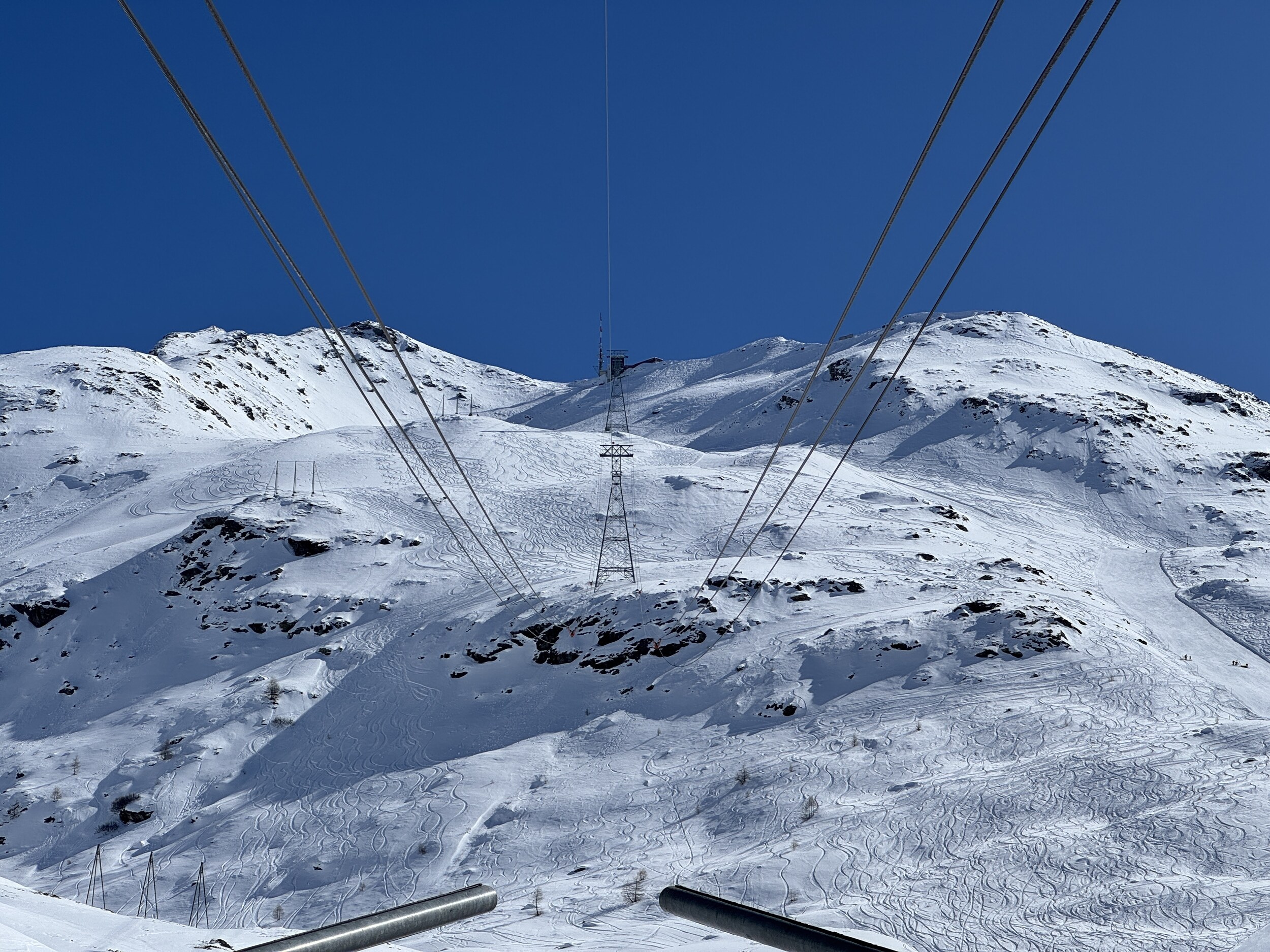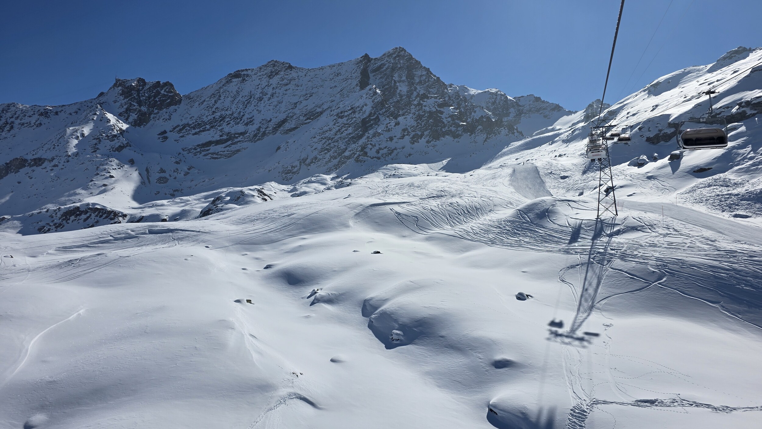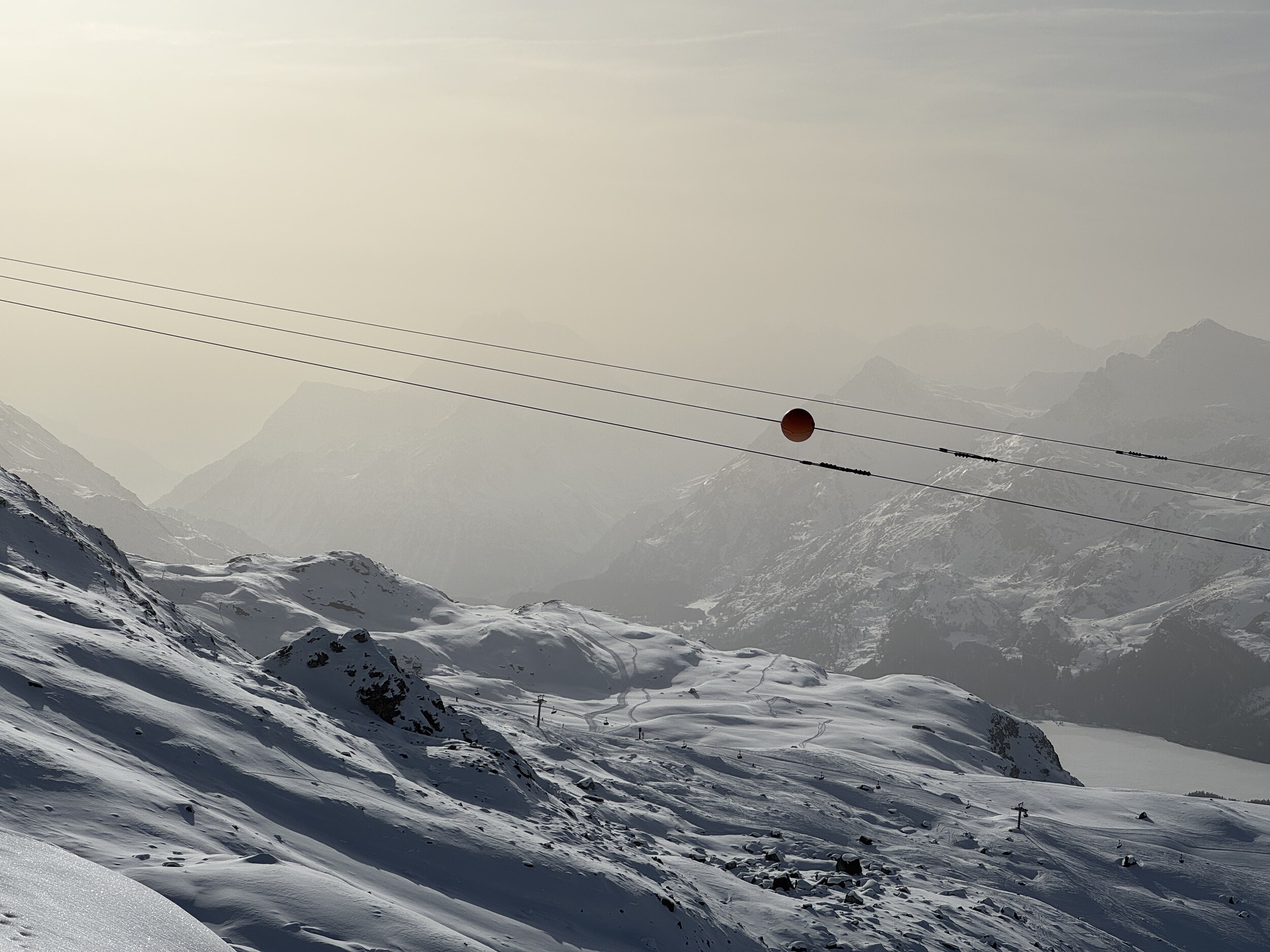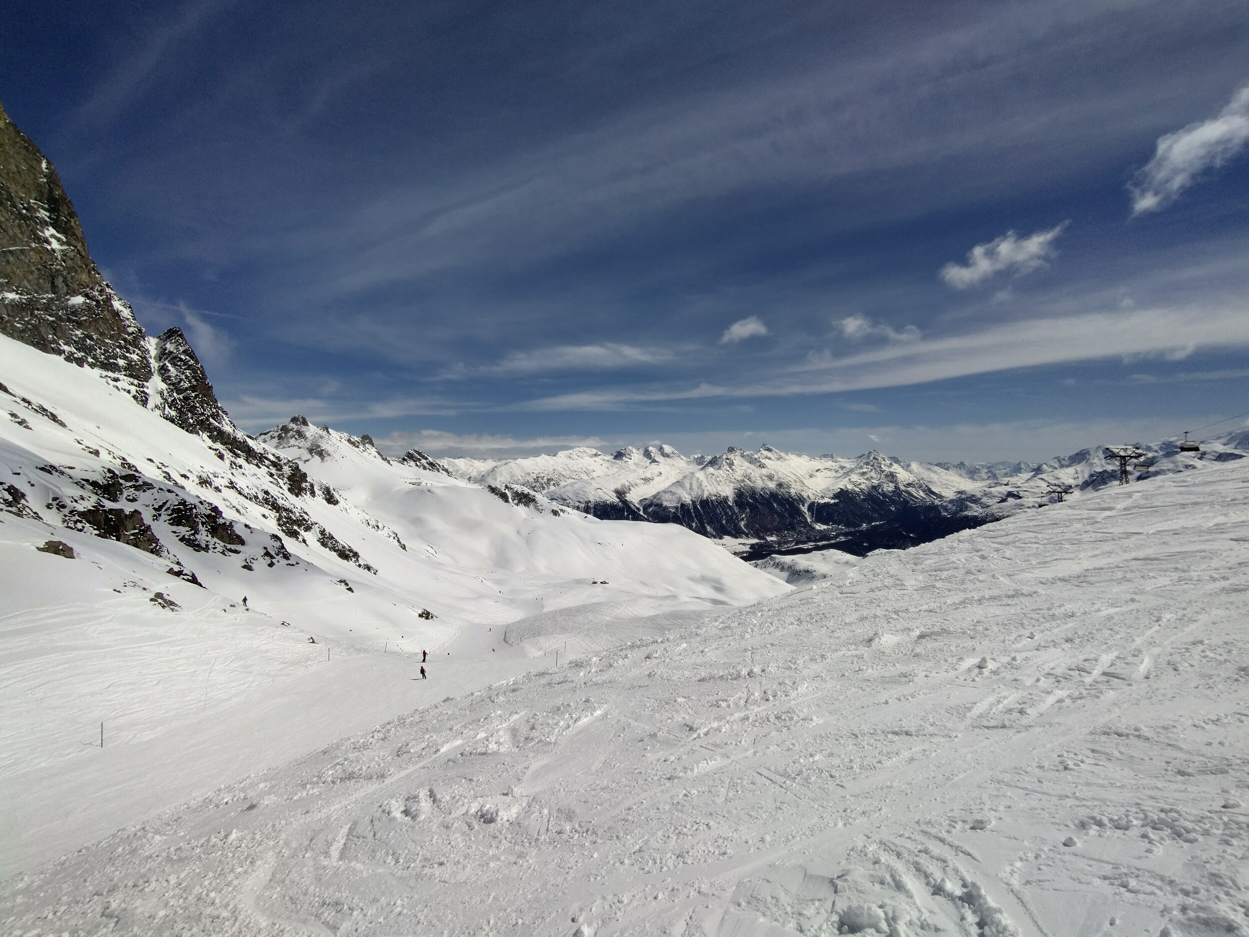 Heute dann Corviglia. Viel Pistenrasen, wenig Bilder trotz Postenkartenpanoramen. Deutlich mehr Betrieb als auf der anderen Seite, aber trotzdem leere Pisten und kein nennenswertes Anstehen. Aber man merkt hier den Pisten am Nachmittag zumindest an, dass sie befahren wurden. Die mit neuen Haubsesesseln ausgestatteten alten von-Roll KSB gefallen mir sehr. Warum geht das in Furtschellas nicht?