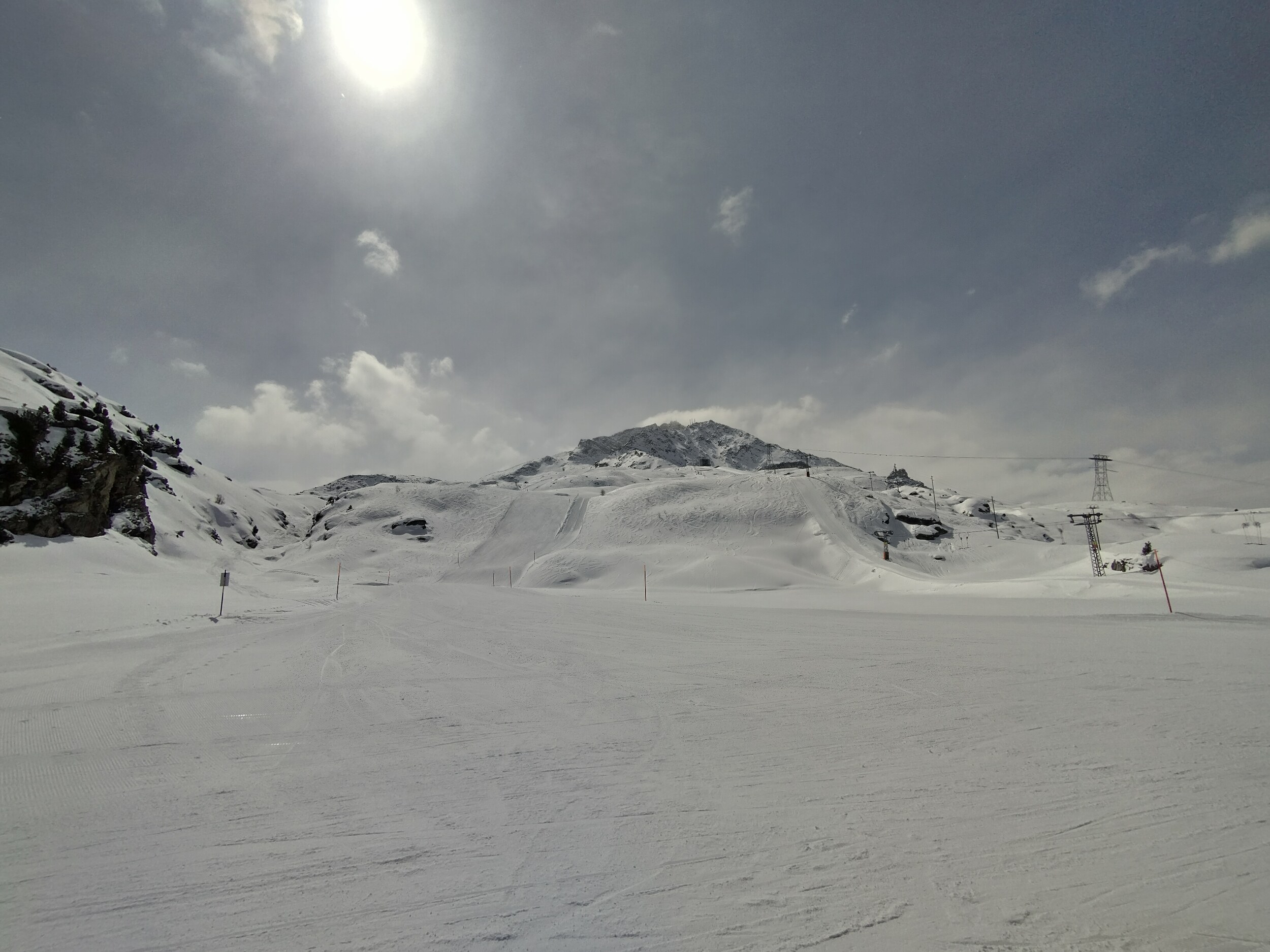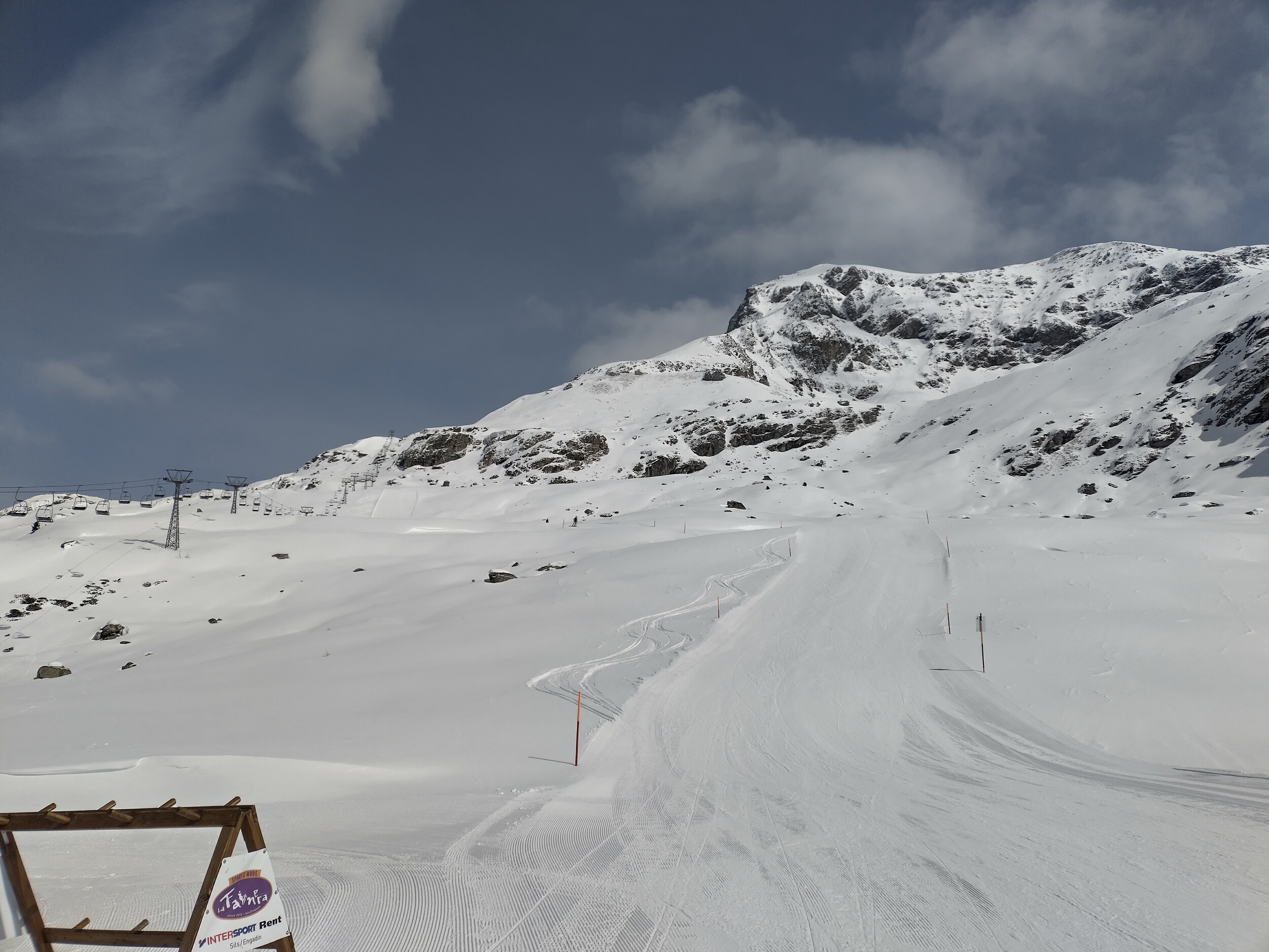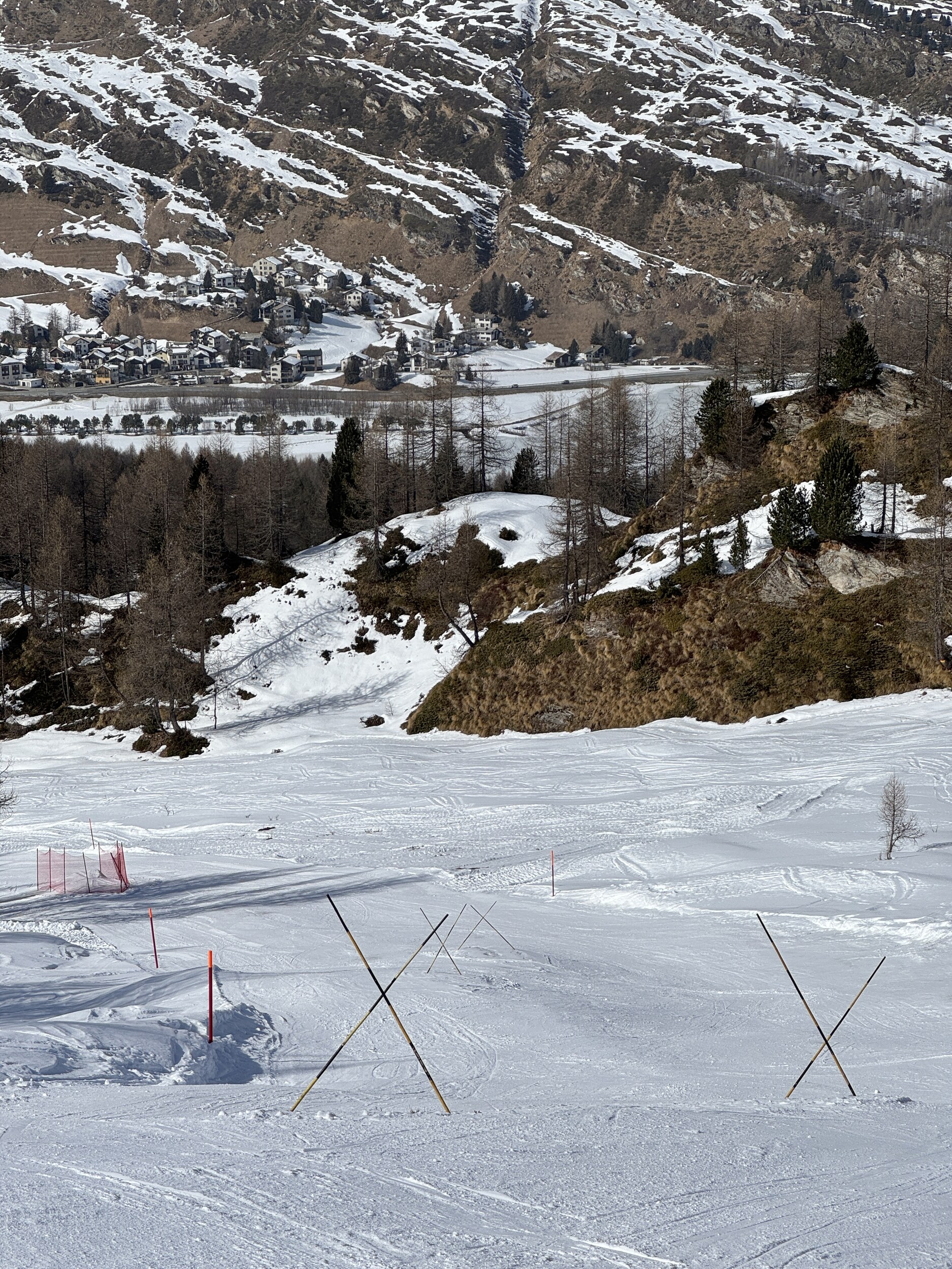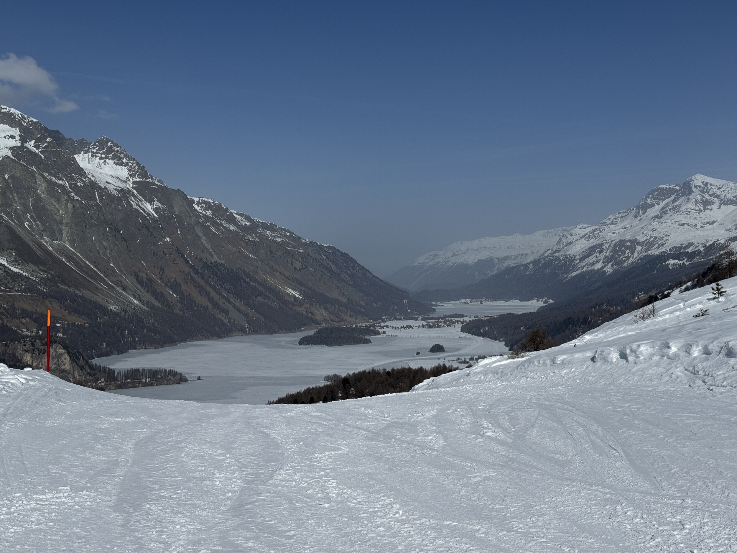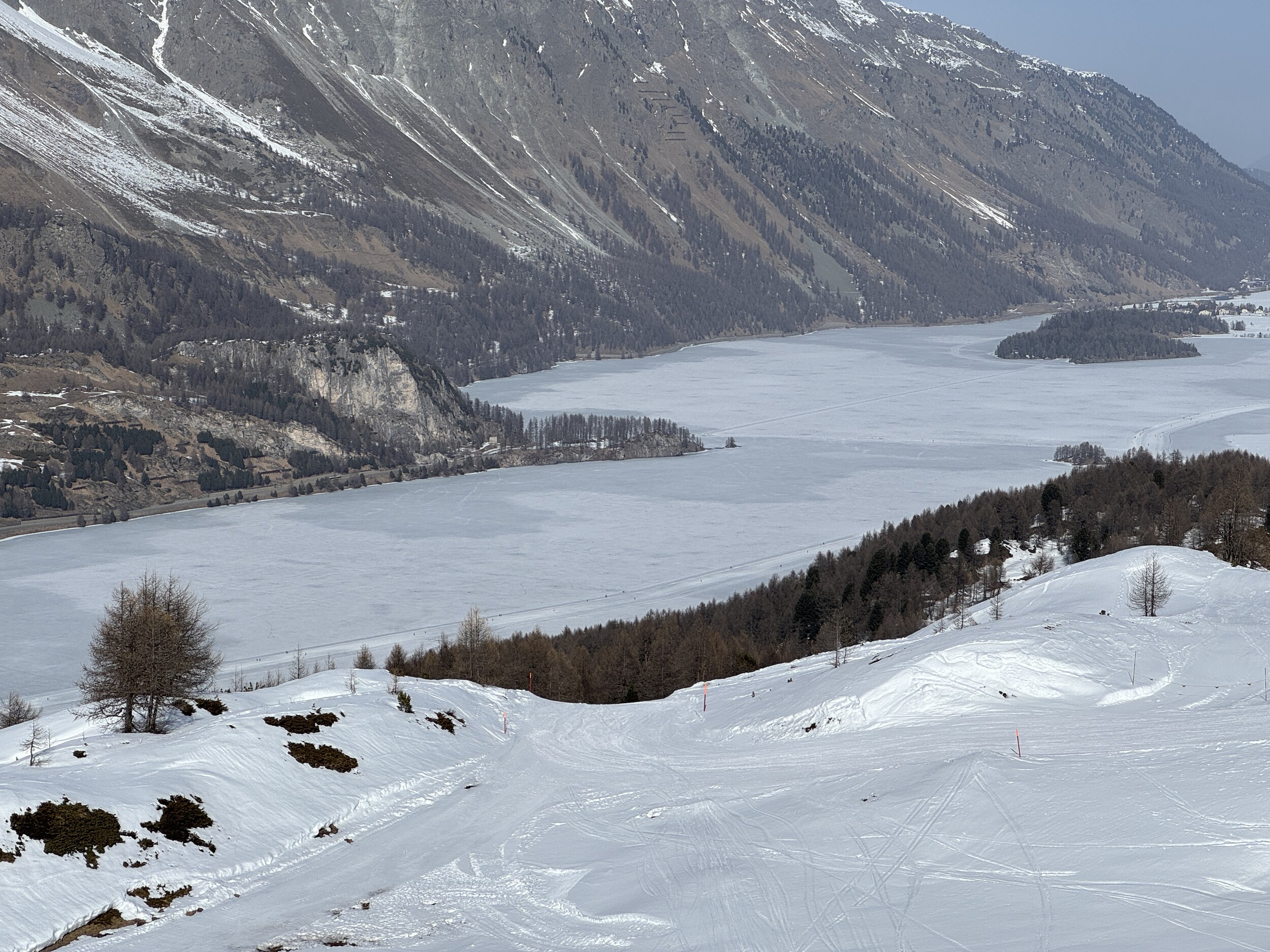 Gestern sind wir erst über den Silsersee spaziert. Danach noch kurz Aela. Dort natürlich merklich wenig Schnee. Teils durch Kreuze gesicherte, steinige Stellen. Ich gehe davon aus, dass in dieser Pistenqualität auch Hahnensee geöffnet werden könnte.