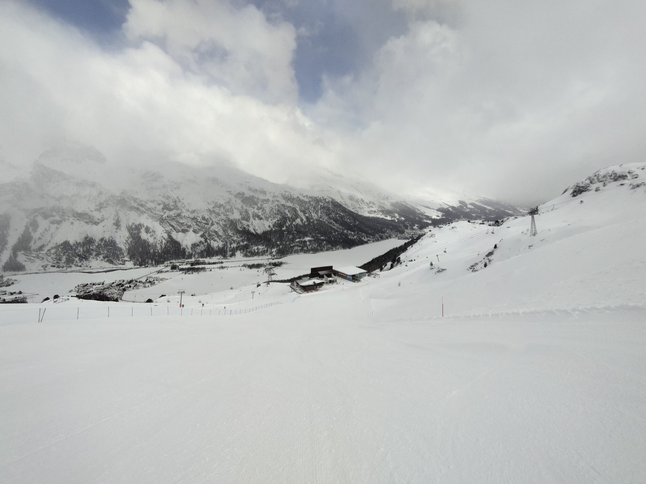Am Dienstag war das Wetter eigentlich ziemlich schlecht angesagt, aber am Vormittag kam die Sonne dann doch recht gut durch. Es war allerdings saukalt und sehr windig. Die Corvatsch-Bahn stand still.