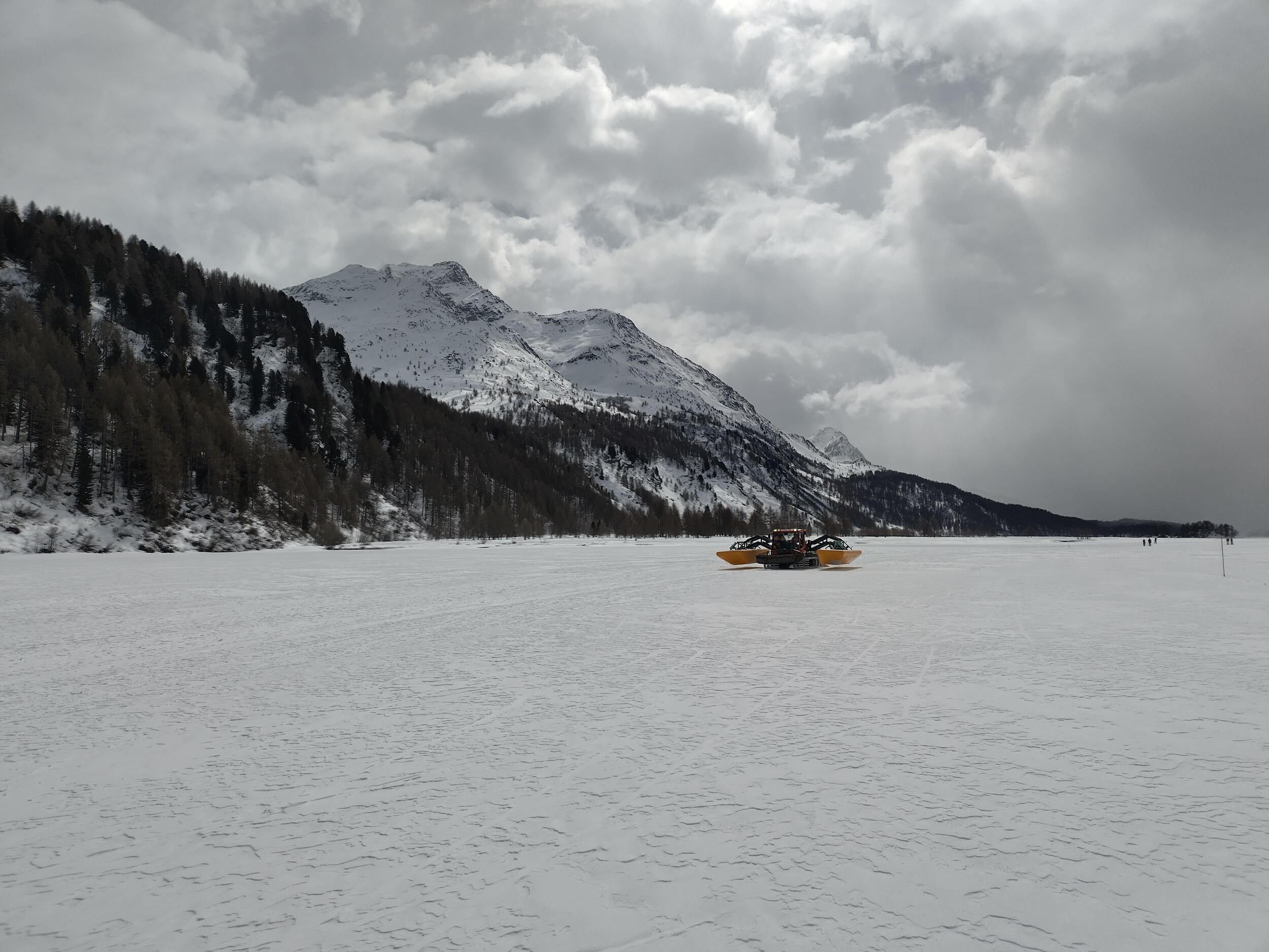 Wobei es am Nachmittag dann doch wieder recht hell wurde. Auf dem Silser See dann eine Sichtung diese kuriosen amphibischen Loipenfahrzeugs.