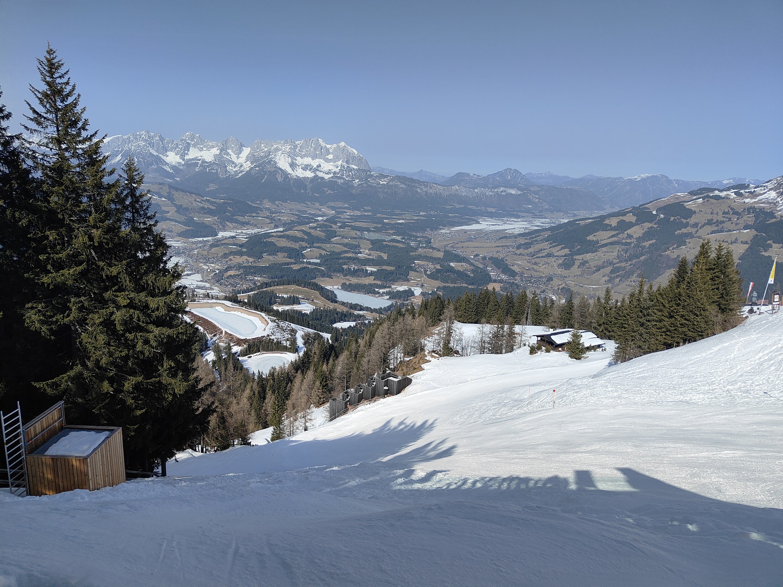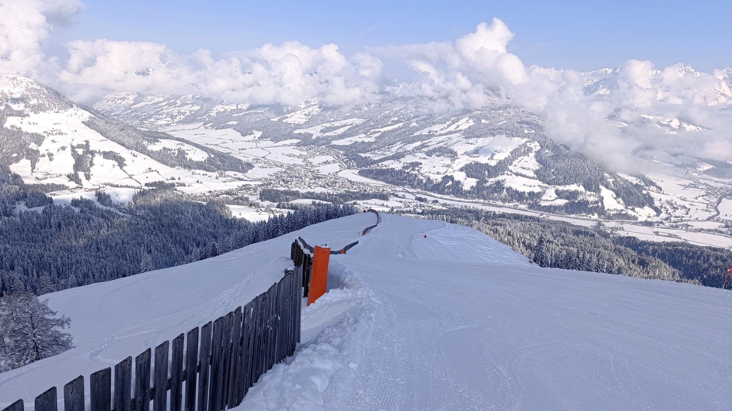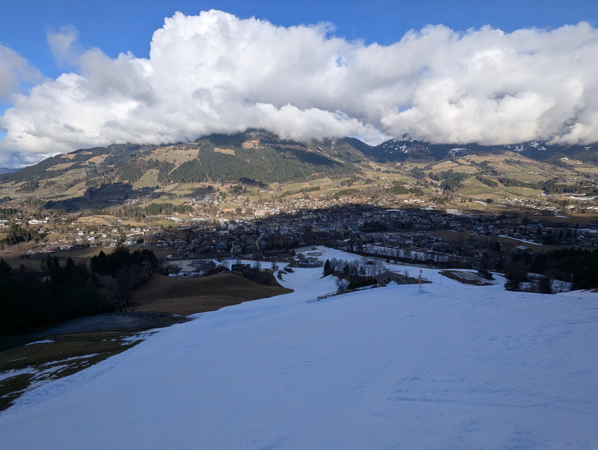 Trotz der gesparten 1 1/2 Stunden kommen wir ziemlich spät in Kirchberg an, und fahren über die Maierlbahn hoch auf die Bergkrete, schauen uns den Start der Streif an, und entscheiden dann bei +15°C angesichts des Nassschnees den Tag zu beenden.