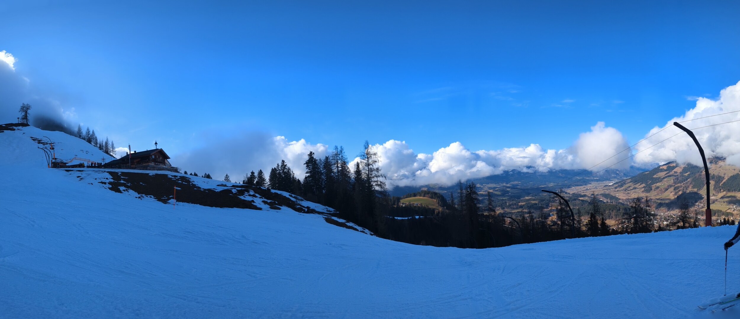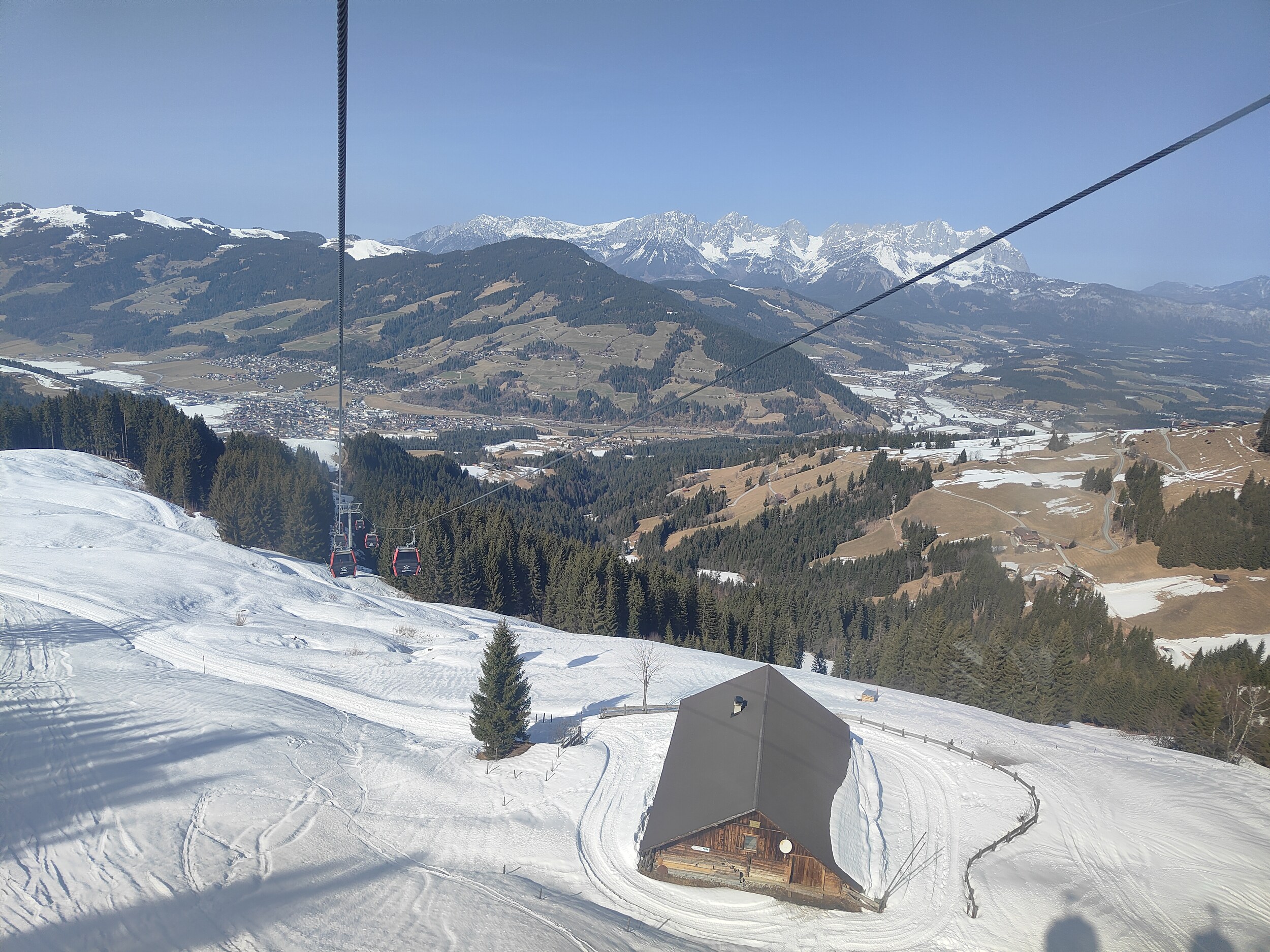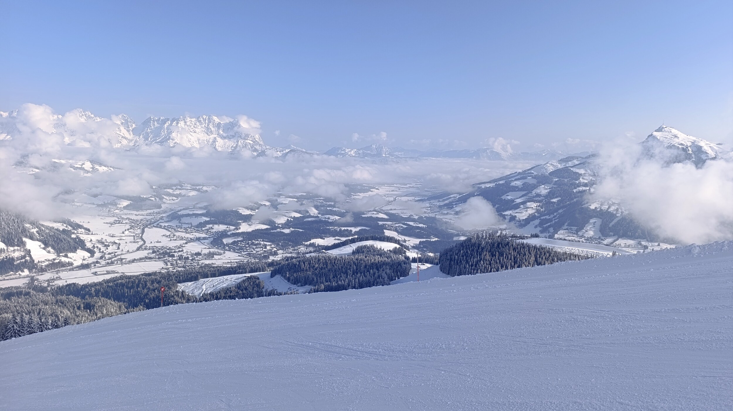 Trotz der gesparten 1 1/2 Stunden kommen wir ziemlich spät in Kirchberg an, und fahren über die Maierlbahn hoch auf die Bergkrete, schauen uns den Start der Streif an, und entscheiden dann bei +15°C angesichts des Nassschnees den Tag zu beenden.