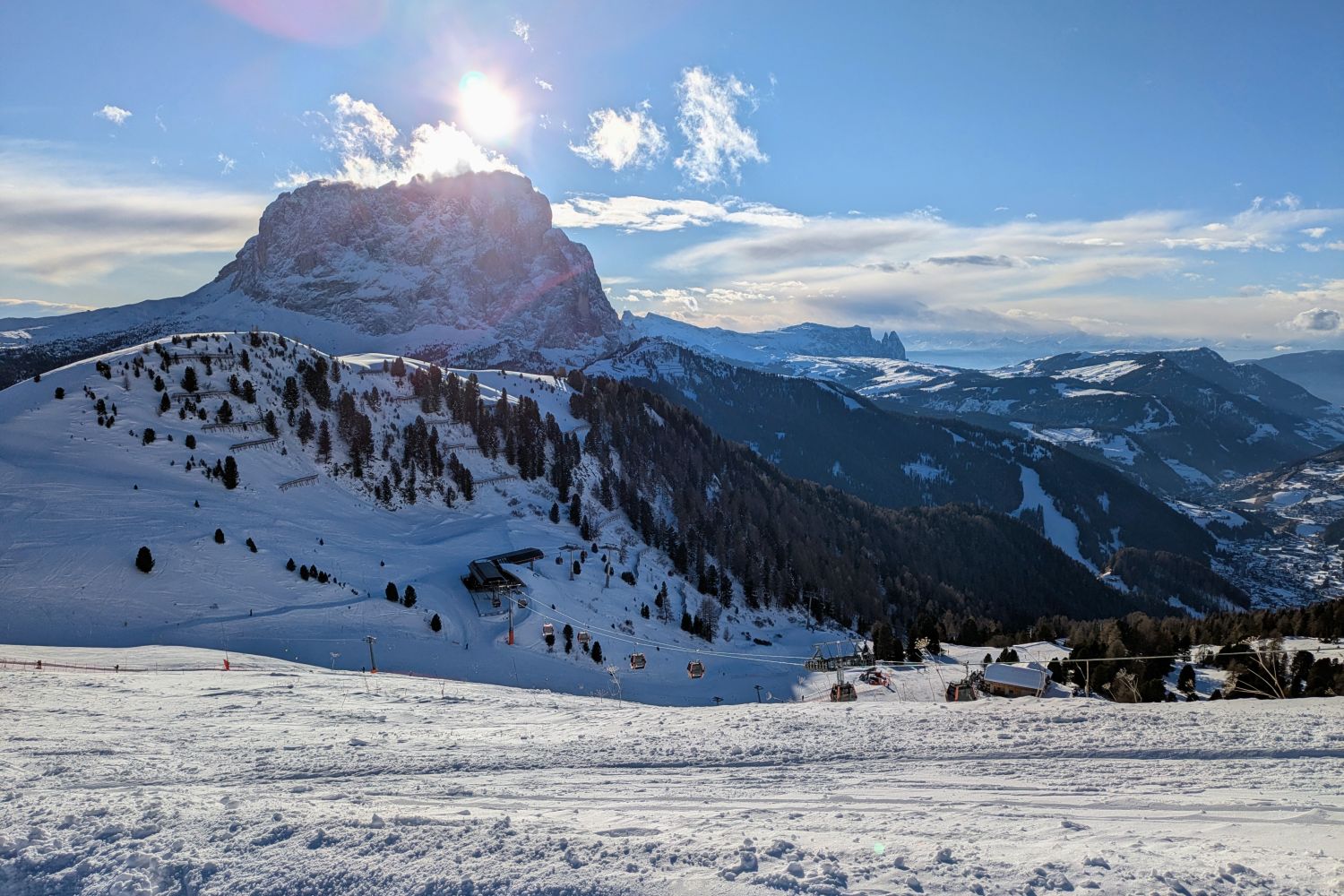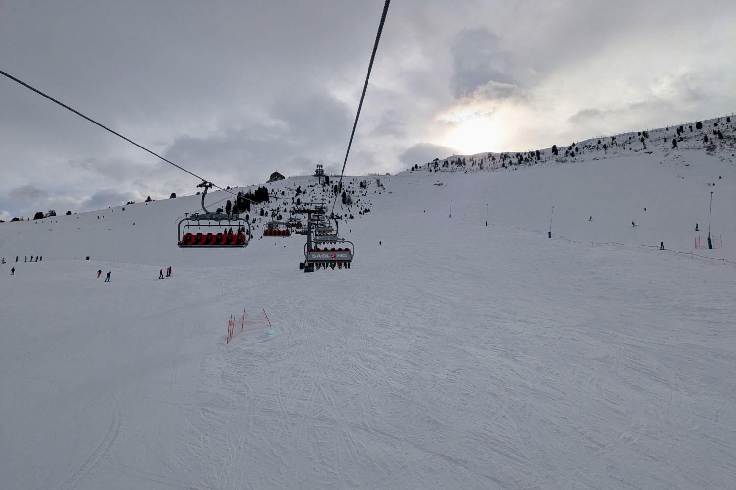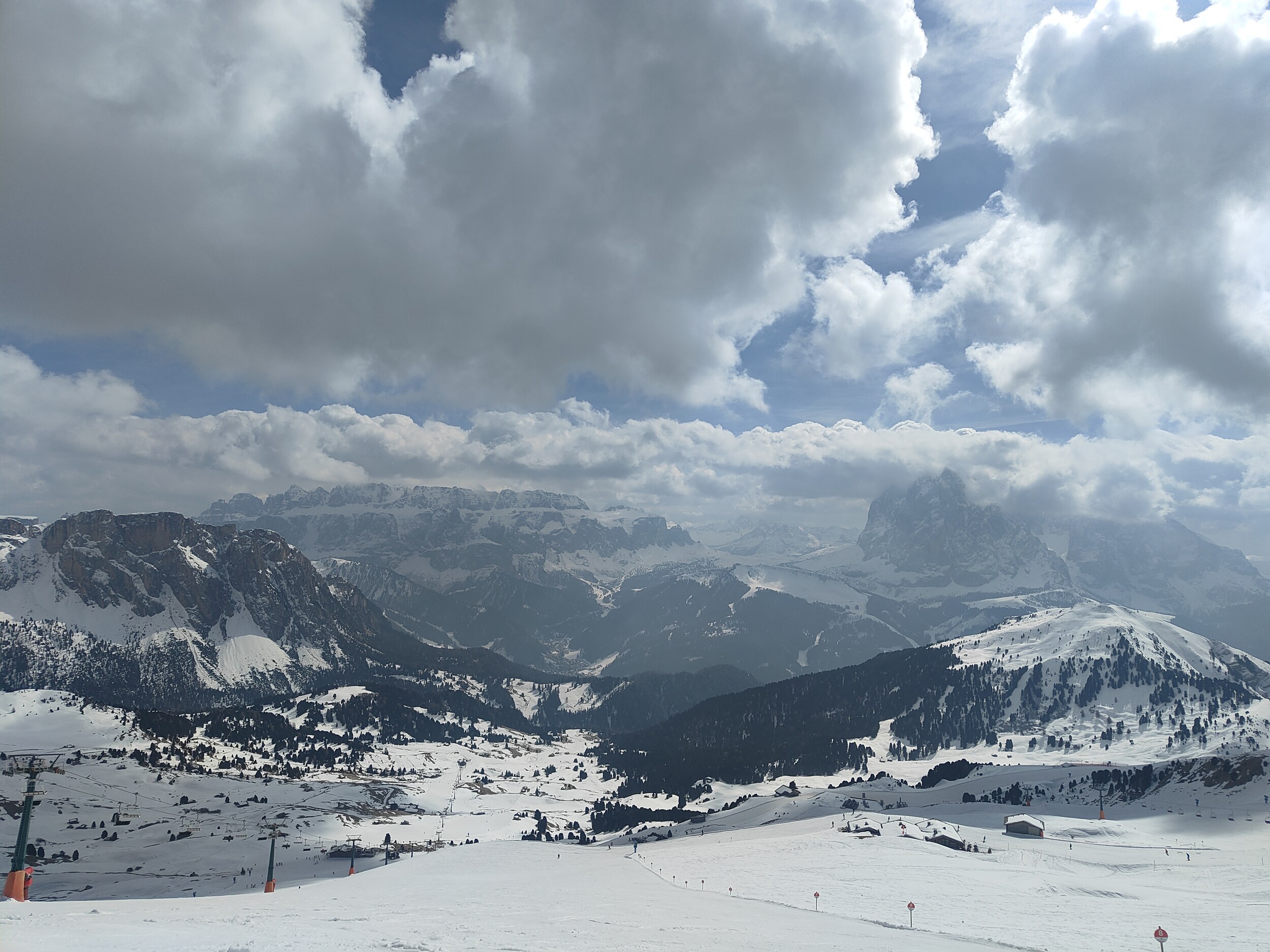 Das Wetter war gemischt, bewölkt und sonnig im Wechsel, vormittags waren auch noch unergiebige Schneeschauer dabei. Ohne Sonne war es weiterhin arg kalt. Die Bodensicht war aber fast ausnahmslos gut. Trotz riesigem Ansturm auf der Seiser Alm haben die Pisten gut durchgehalten, was einfach an der Kälte und immer wieder verschatteten Sonne lag.