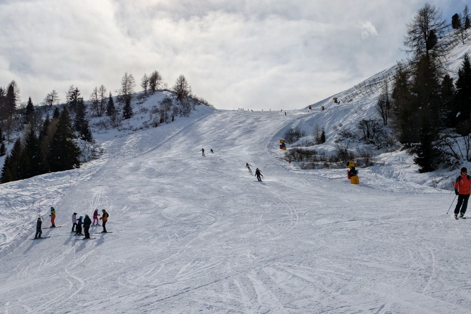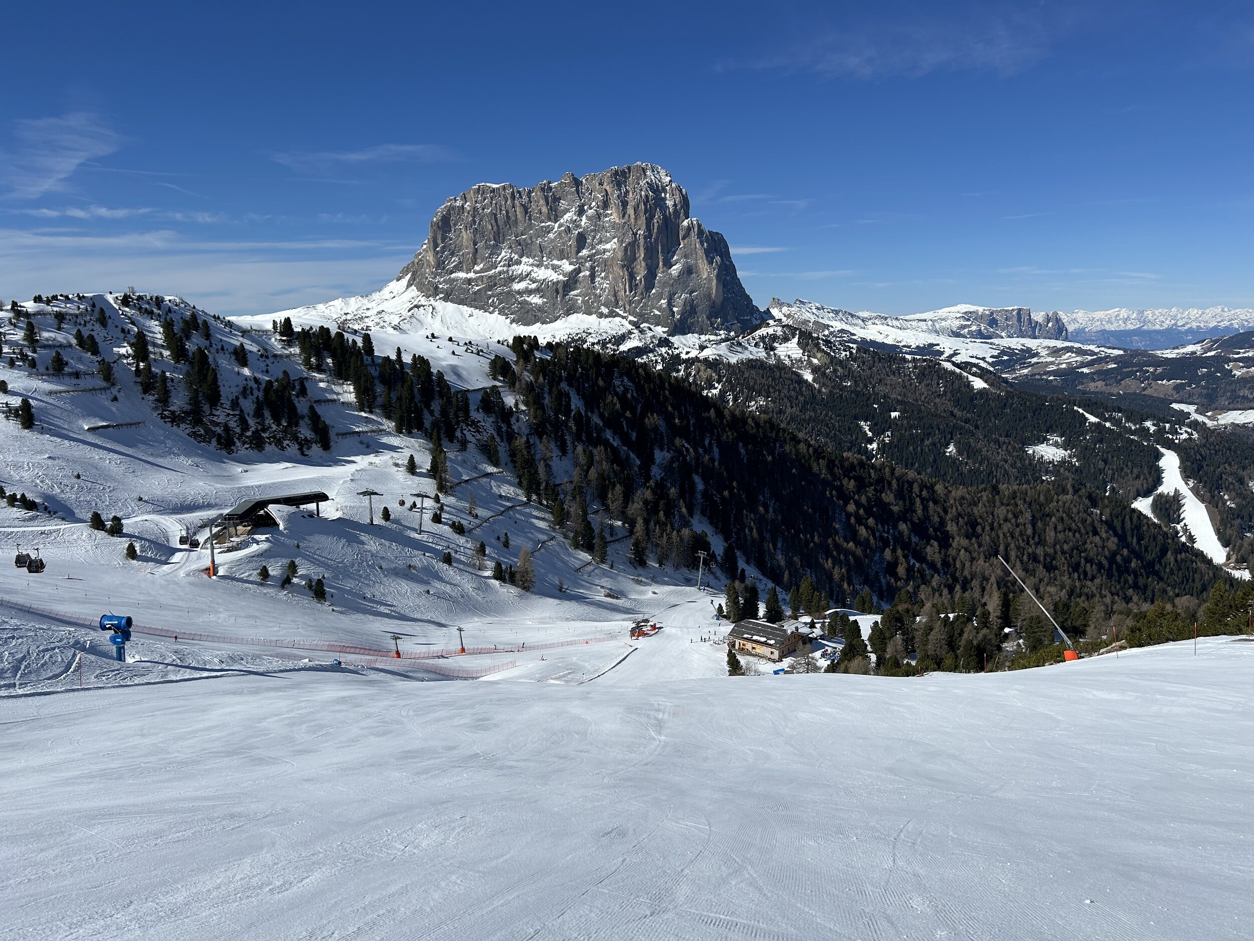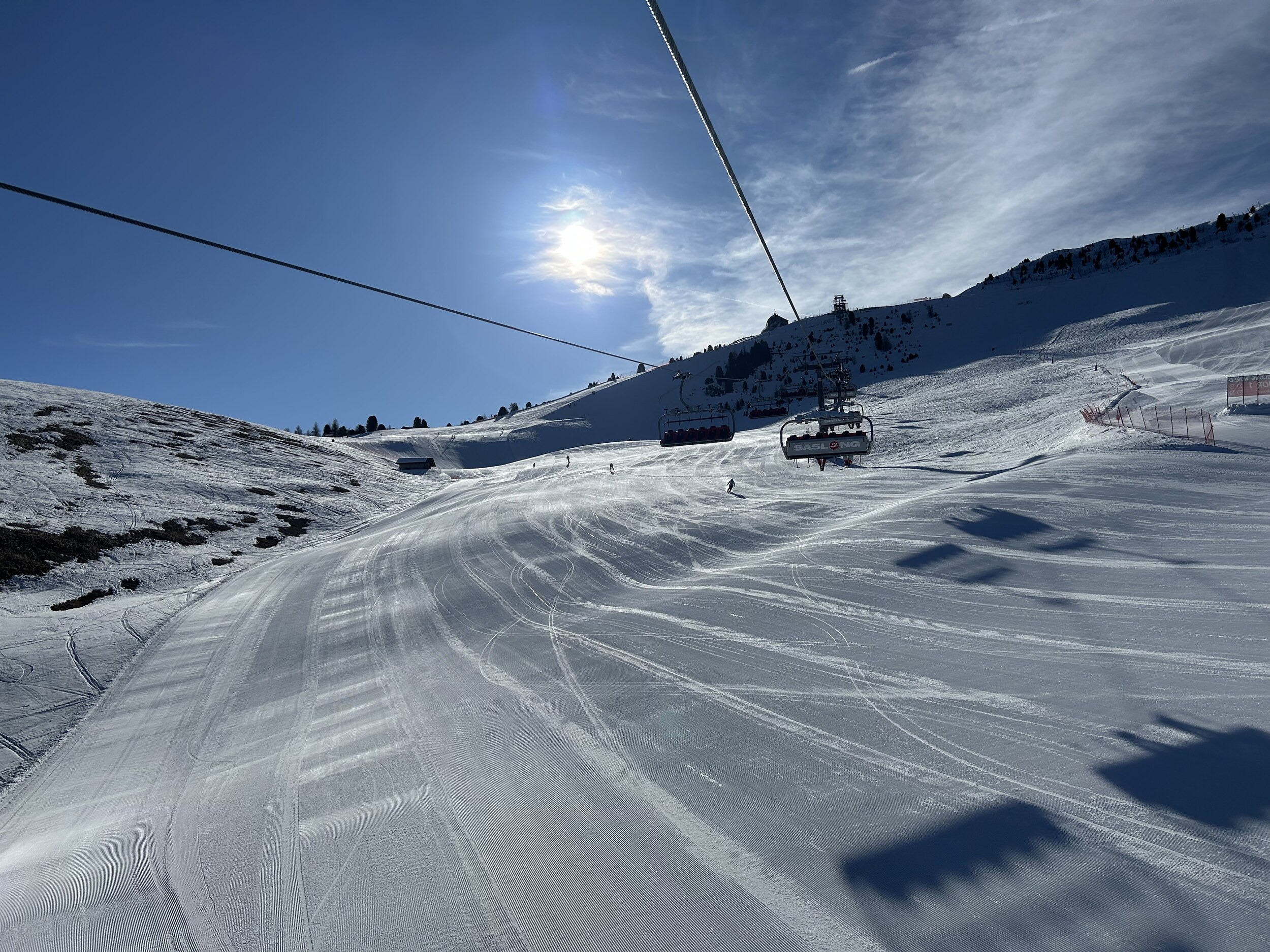 Das Kernproblem ist aber schlicht, dass es in der Hauptsaison viel zu voll ist! Egal ob auf der Piste, vor dem Lift, im Lift, oder auf der Hütte. Dazu viele alte leistungsschwache Anlagen machen es nicht besser, aber auch mit neuen leistungsstarken Anlagen wird das Problem nicht grundsätzlich gelöst, wie man z.B. an Bamby und Spitzbühl sehen kann, die beide zeitgemäße 6er CLDs sind. Und die Pisten sind halt vielfach auch zu voll. Eigentlich müsste auch die Seiser Alm zu einer Limitierung von Skipässen greifen, wie es ein anderes Skigebiet in Italien jetzt wohl gemacht hat. Aufgrund der Zugehörigkeit zu Dolomiti Superski und auch Verbund Gröden/Seiser-Alm dürfte das aber kaum möglich sein. Im Vergleich zur Sella Ronda ist das Problem vor allem, dass man ja auch nicht einfach mal irgendwo in ein Seitental oder sonstwie weniger frequentierten Bereich ausweichen kann - man ist auf der Seiser-Alm quasi "gefangen". Die Menschenmassen am Panorama (den man zum Glück nicht fahren muss) reichen schon fast an die Bilder aus amerikanischen Skigebieten ran. Und auf den vollen Pisten sind natürlich jede Menge Kandidaten dabei, denen man mal einen Skikurs nahelegen würde.