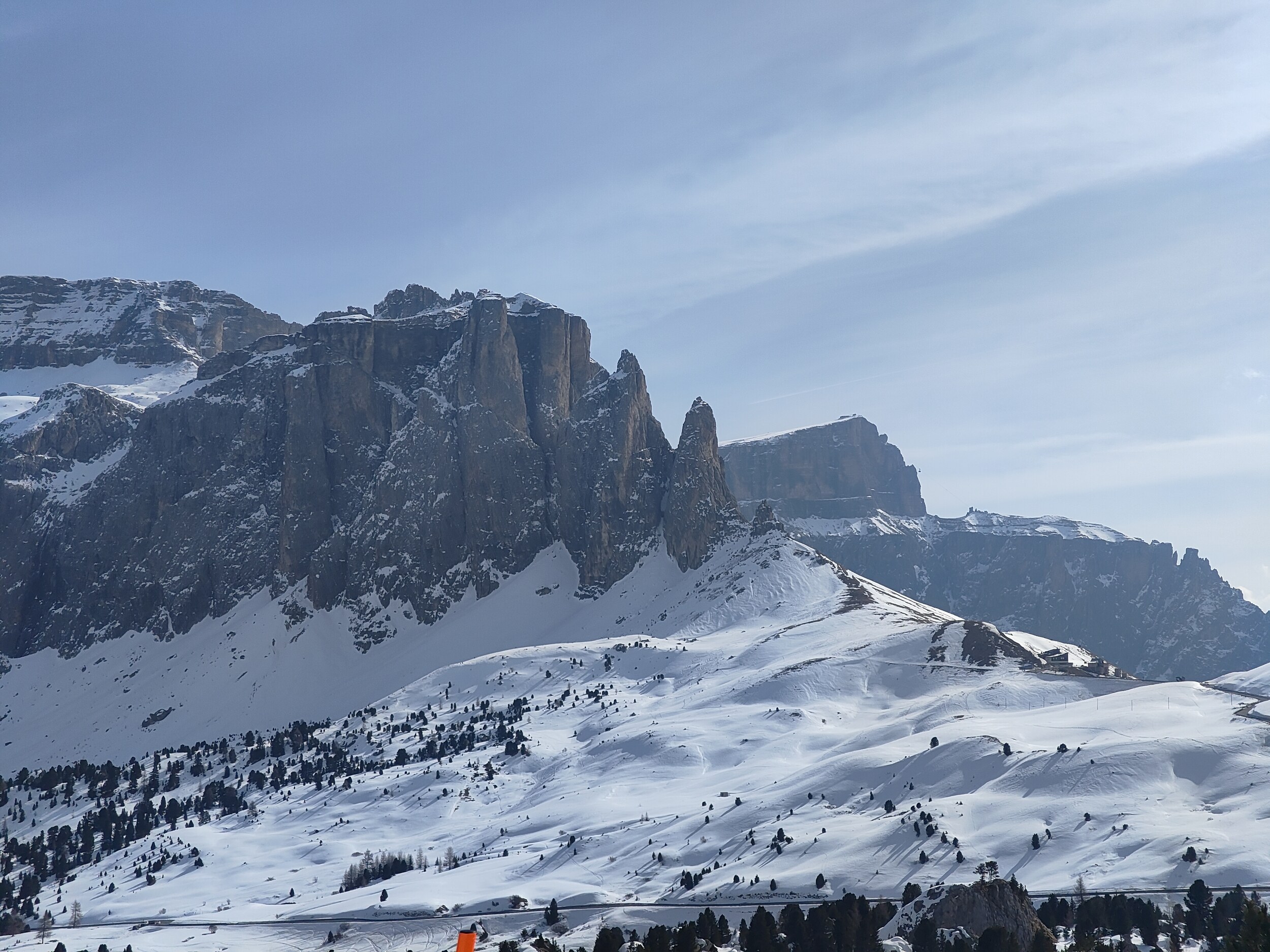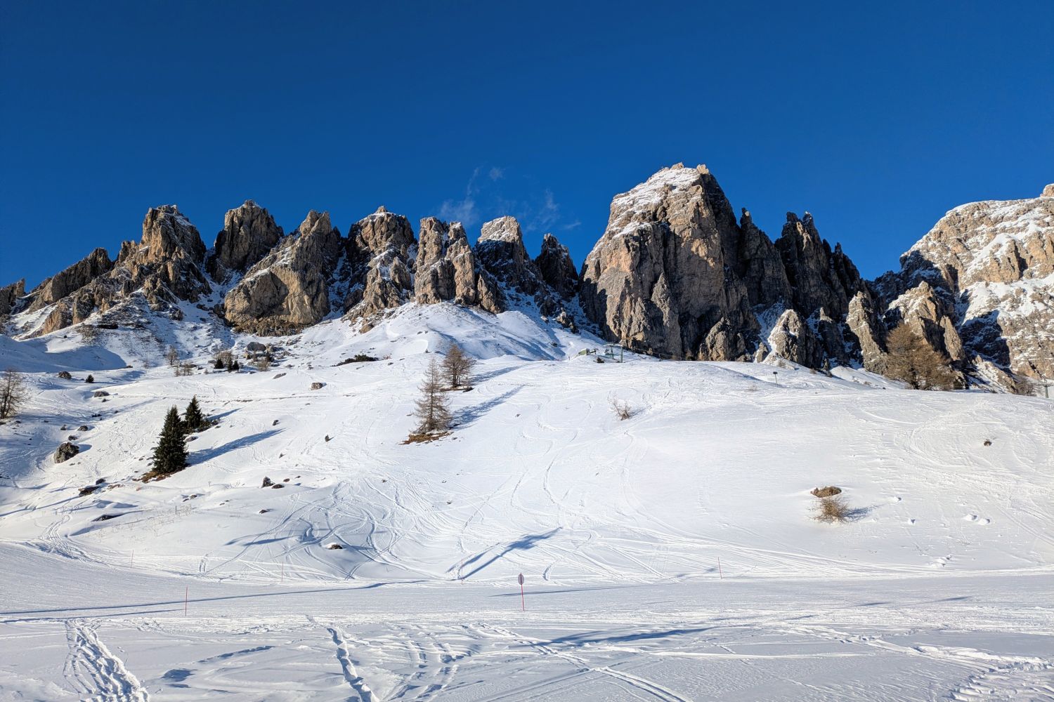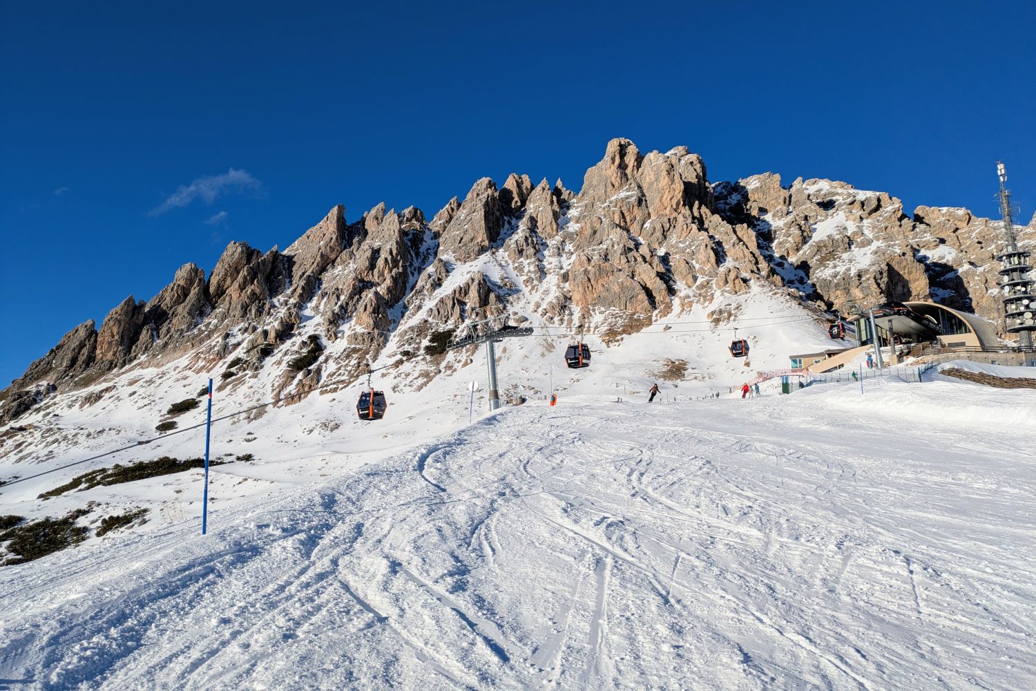 P.S.: Es war heute oben raus auch recht windig. Da wurde an Kanten und Graden auch Schnee verblasen. Auf die Ronda hatte das wohl keine Auswirkungen, aber ich hatte zwischenzeitlich auf einer Anzeige gesehen, dass Pralongia II und Masarei geschlossen sind. Da oben pfeift es eh immer besonders kräftig (warum auch immer, ist ja nun gar nicht so ein hoher Gipfel), kann also gut sein, dass die Schließung real und windbedingt war.