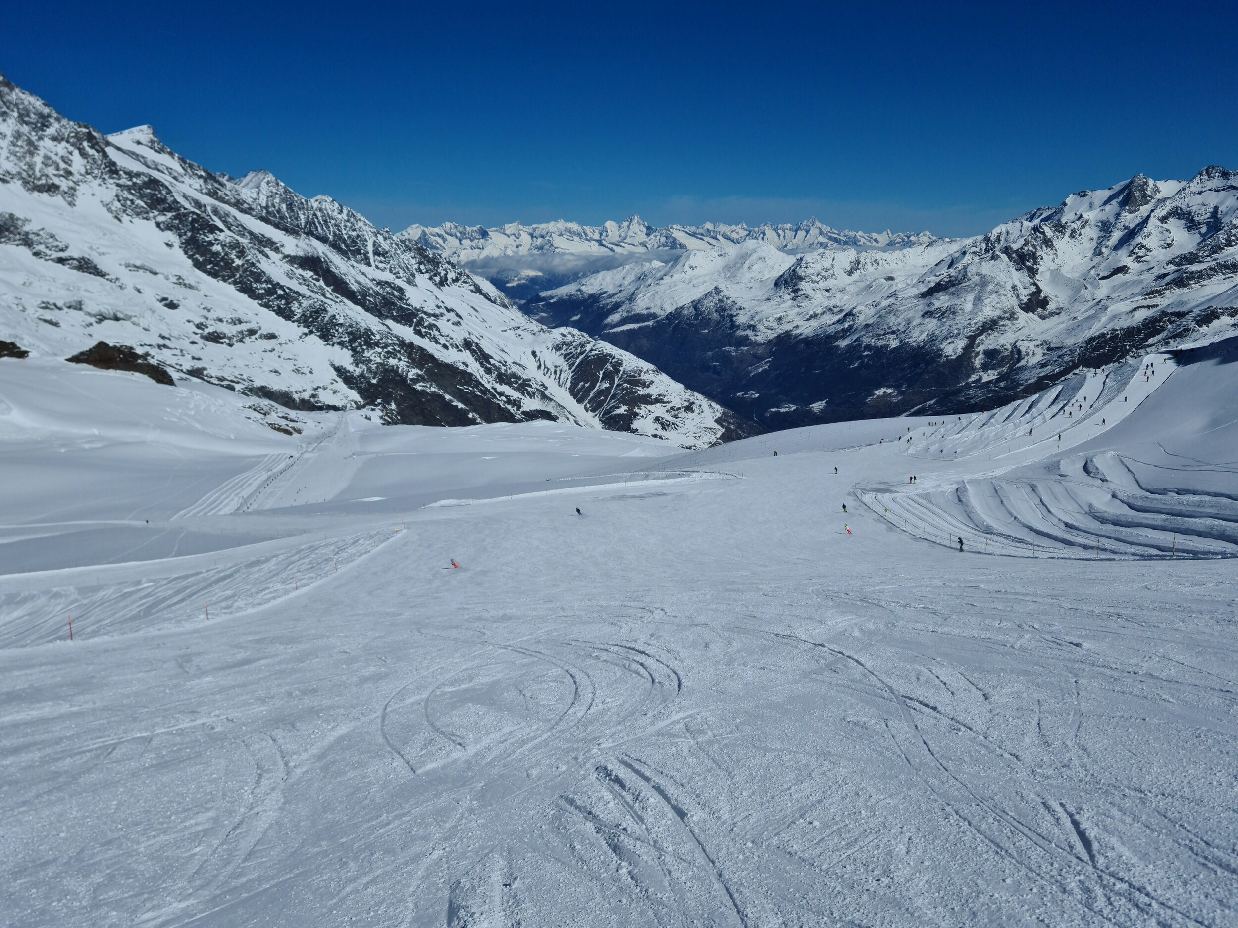 Nach dem Mittag sind sind wir auf den Gletscher. Wie bereits erwartet waren die Pisten am Allalin 2+3 noch sehr weich und deshalb stark ausgefahren. Egginerjoch hat nach dem Mittag auch geöffnet. Dort herrschte aber grosser Andrang (einige Minuten Wartezeit) und die Piste war ebenfalls stark ausgefahren: Allgemein war am Nachmittag rund um Morenia sehr viel los, was zu stark ausgefahrenen Pisten führte. So sind wir zuerst an Spielbodeb/Längfluh gewechselt. Die Piste am Längdluh-Sessel war wie erwartet ein Acker, danach ging aber ganz gut zu fahren. Zum Schluss sind wir an den Plattjen, die Piste dort hat sich bis am späten Nachmittag gut gehalten. Fazit: Alles in allem ein guter Tag, jedoch nicht der beste der Woche. Wetter und Schnee waren top, der Andrang war aber schon sehr gross. Zu grossen Teilen konnten wir den Leuten zwar ausweichen, zwischendurch wurde es aber auch mal unangenehm voll auf den Pisten.
