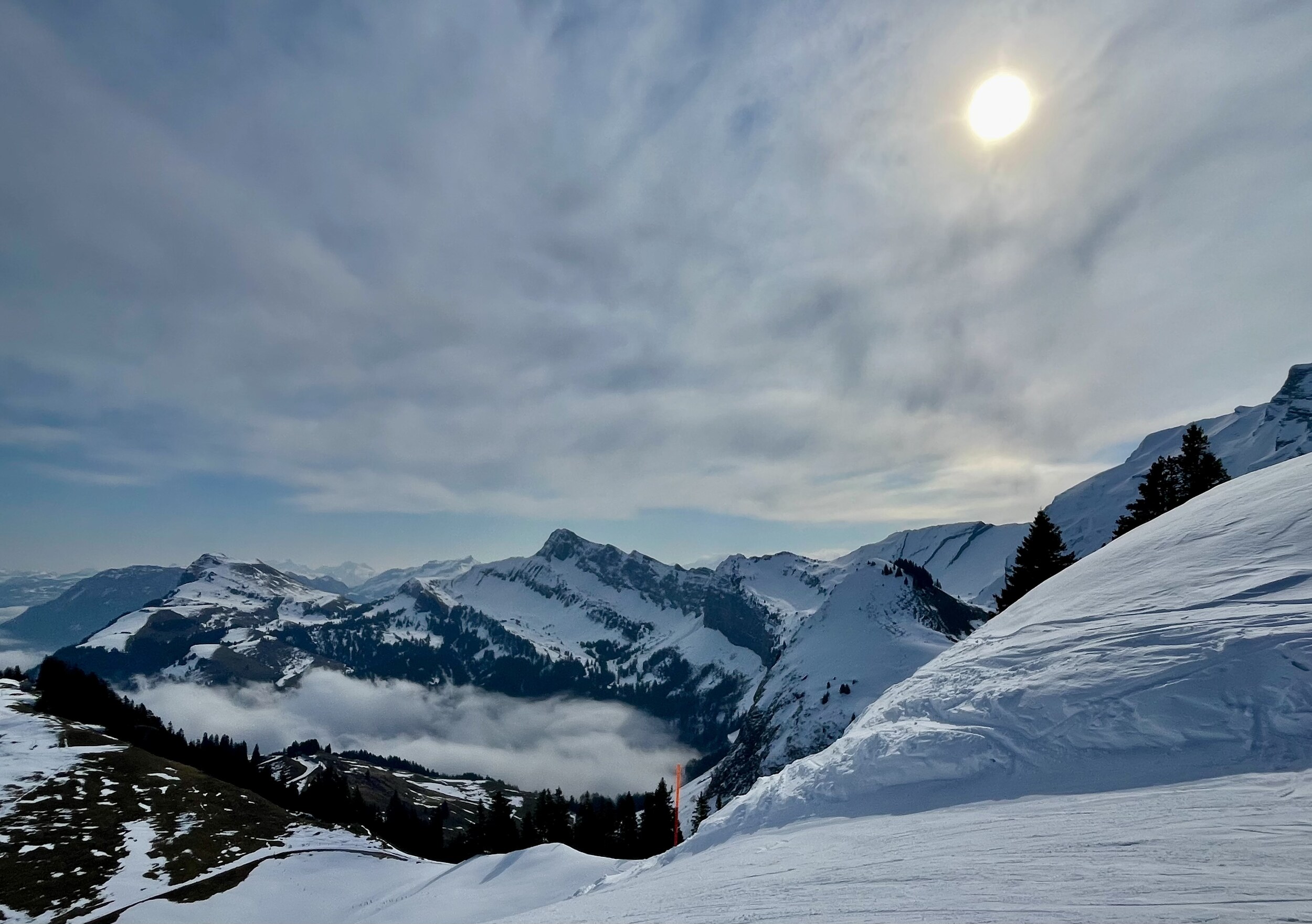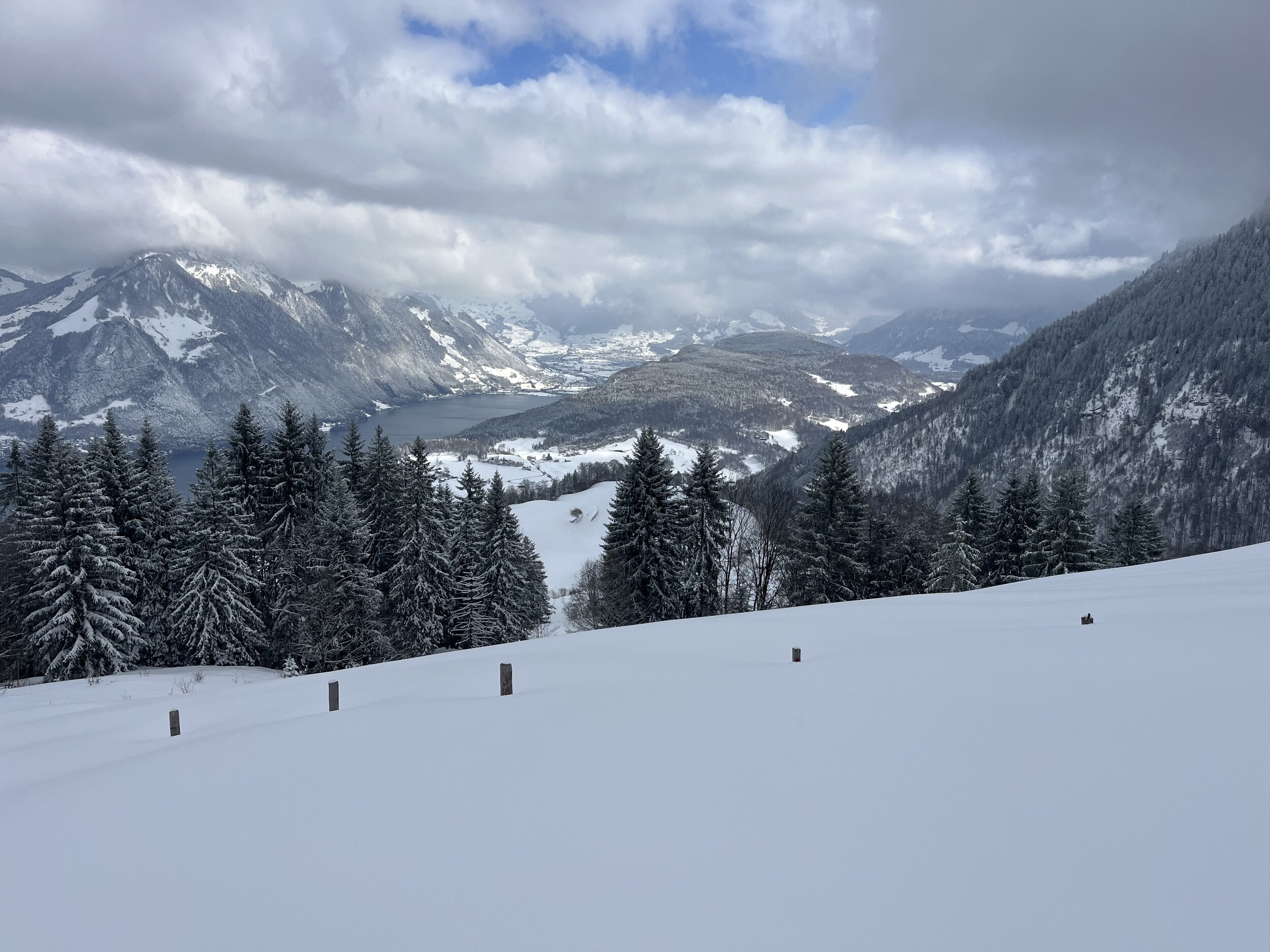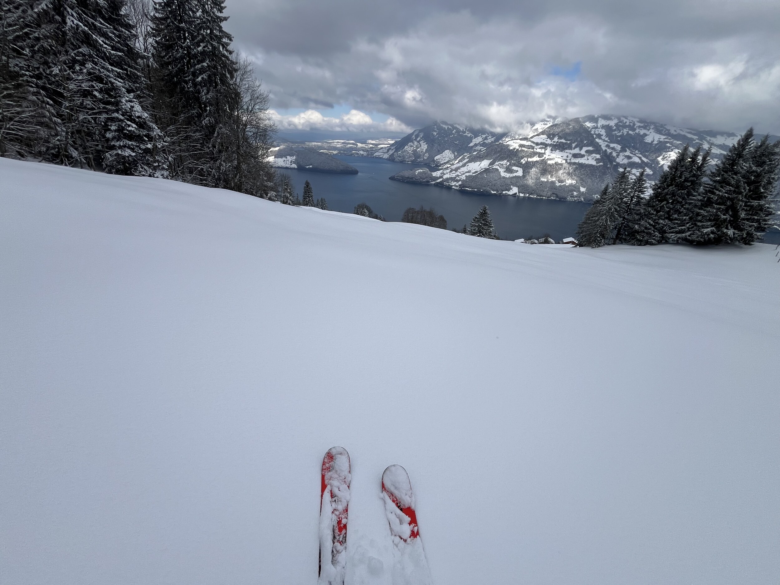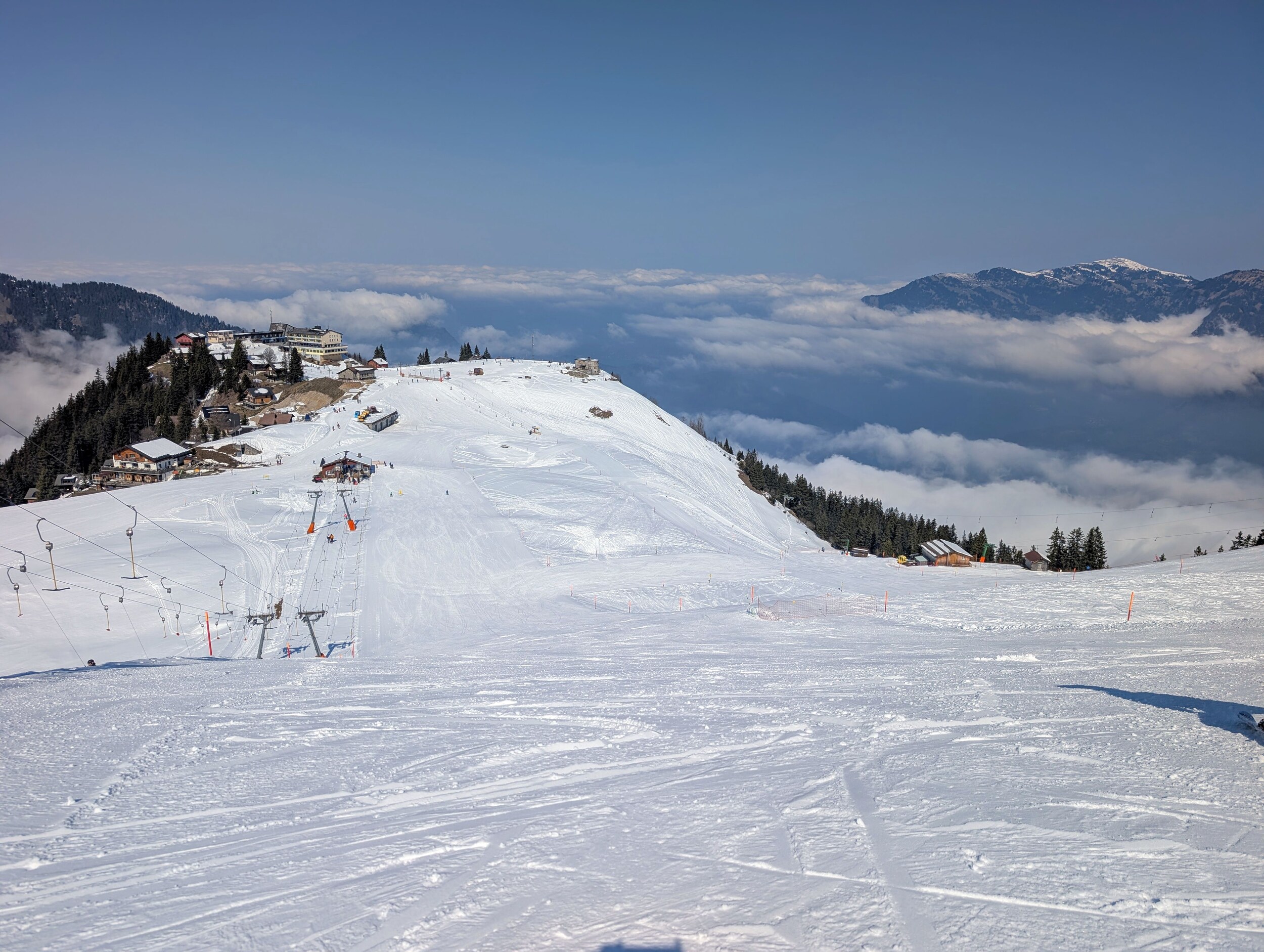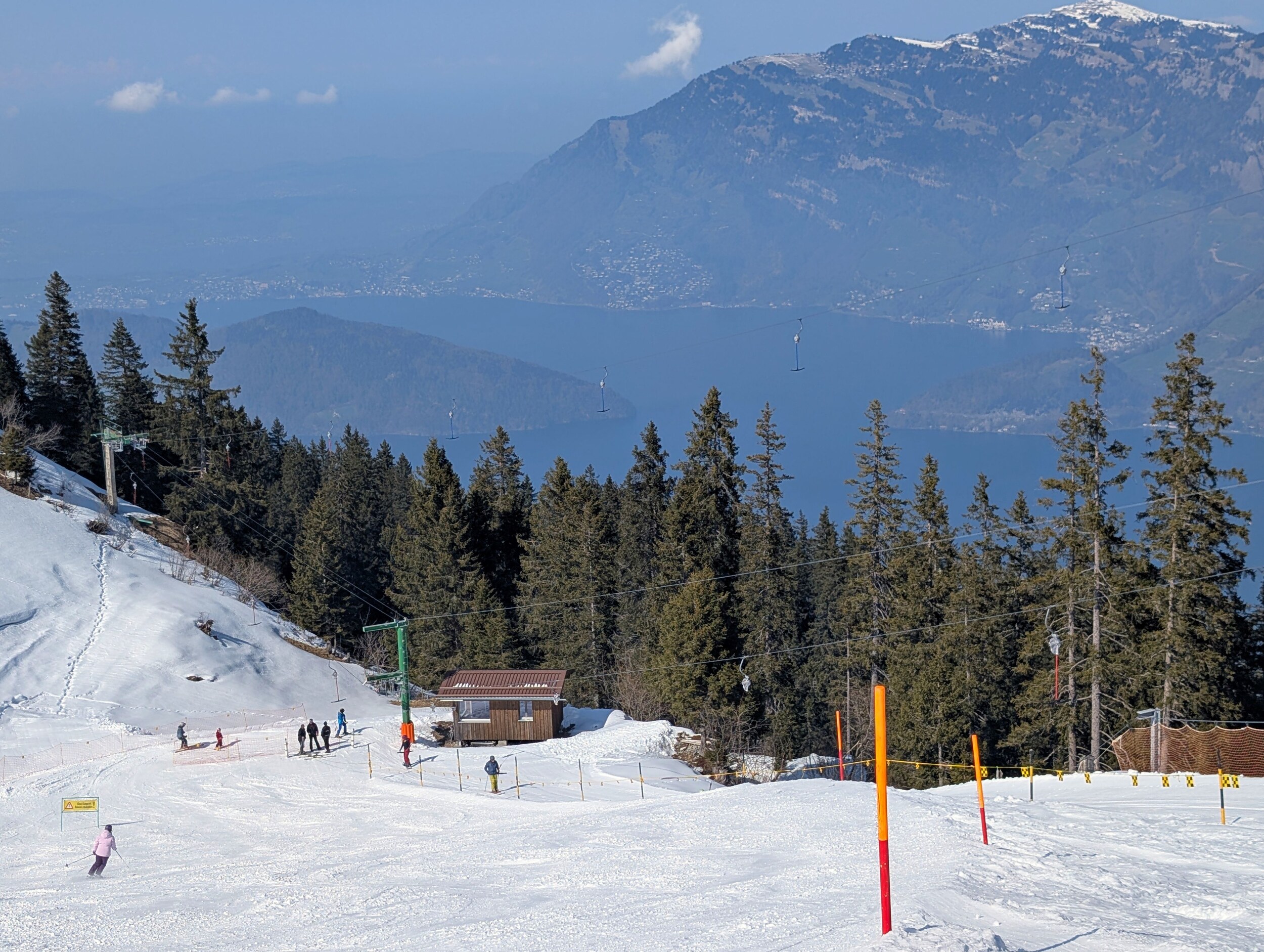Oben angekommen, staune ich ob dem winterlichen Anblick. Ist das tatsächlich der letzte Betriebstag der Saison? Einzig die geschlossene Verbindung zur Stockhütte hat heute etwas gezeigt, dass das Saisonende naht. Es hatte nicht sehr viele Leute und wir mussten nie länger anstehen und haben den Tag auch kulinarisch genossen. und am Nachmittag war dann auch freie Sicht auf den See, auf dem wir heute so gediegen angereist sind. Das war der letzte Skitag hier heute, und die Pisten werden eingepackt. Vielleicht gibt es nächstes Jahr mit dem Magic Pass eine längere Saison?