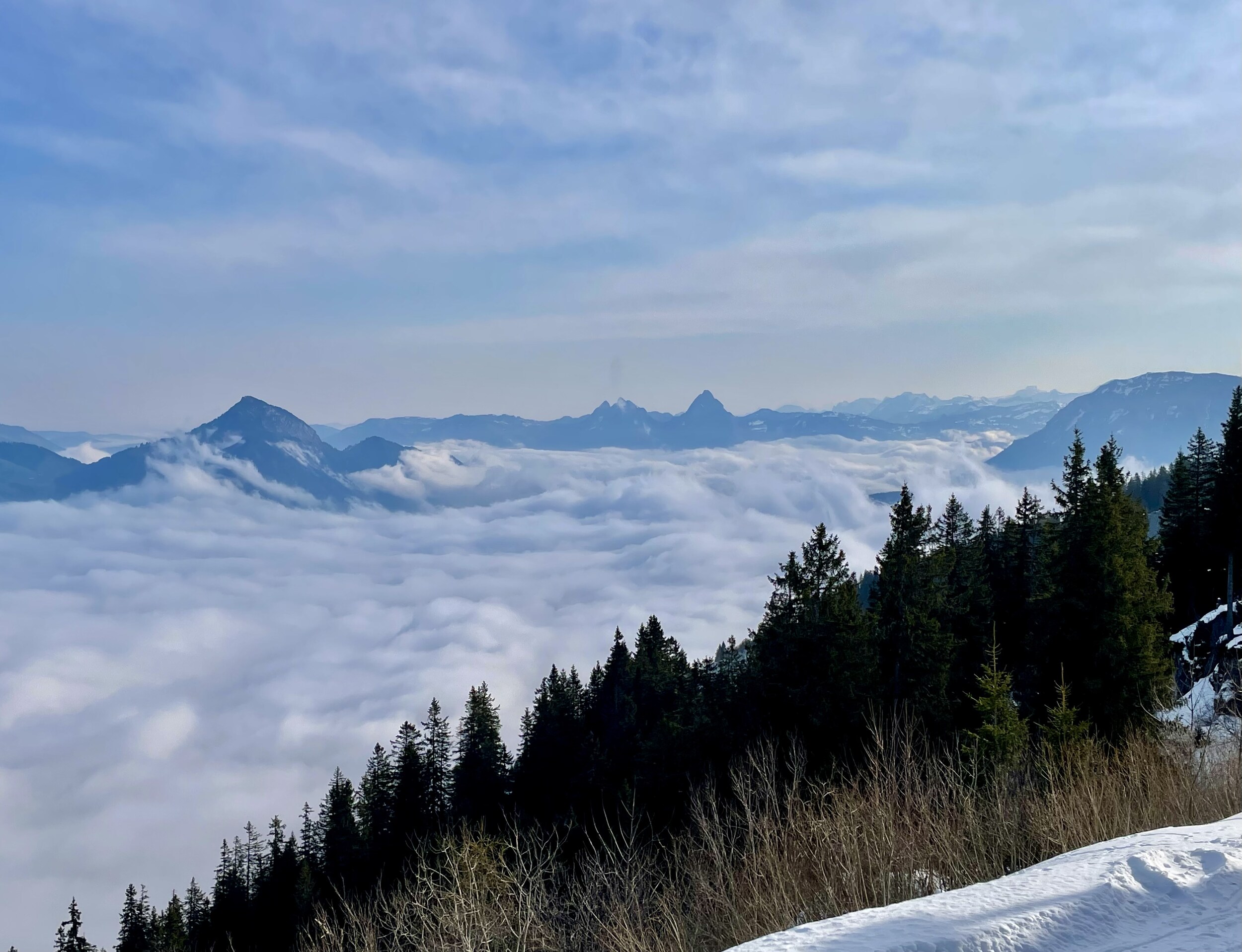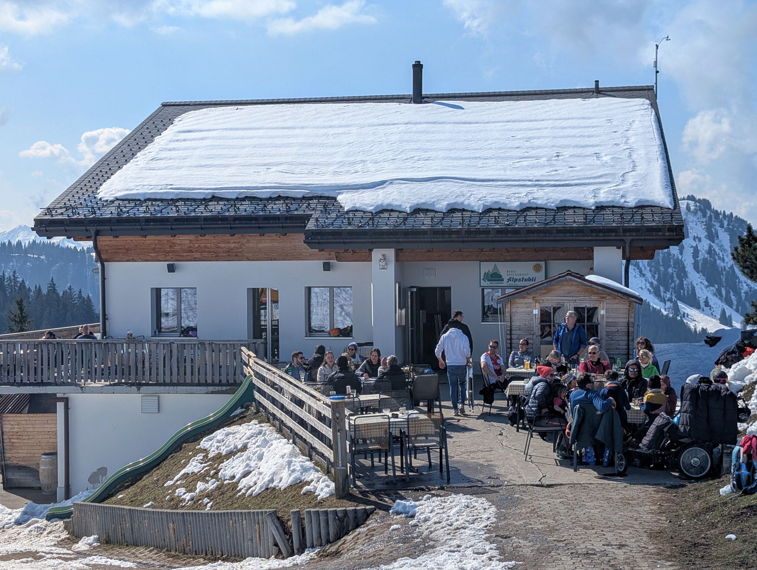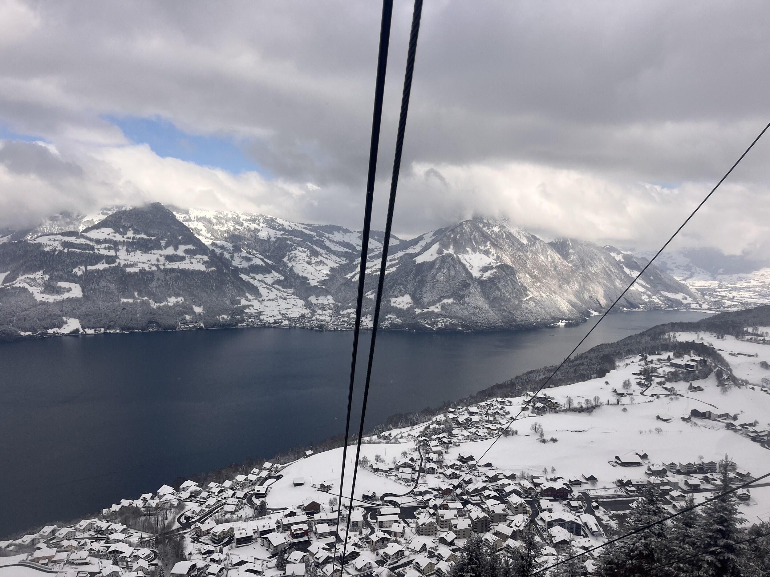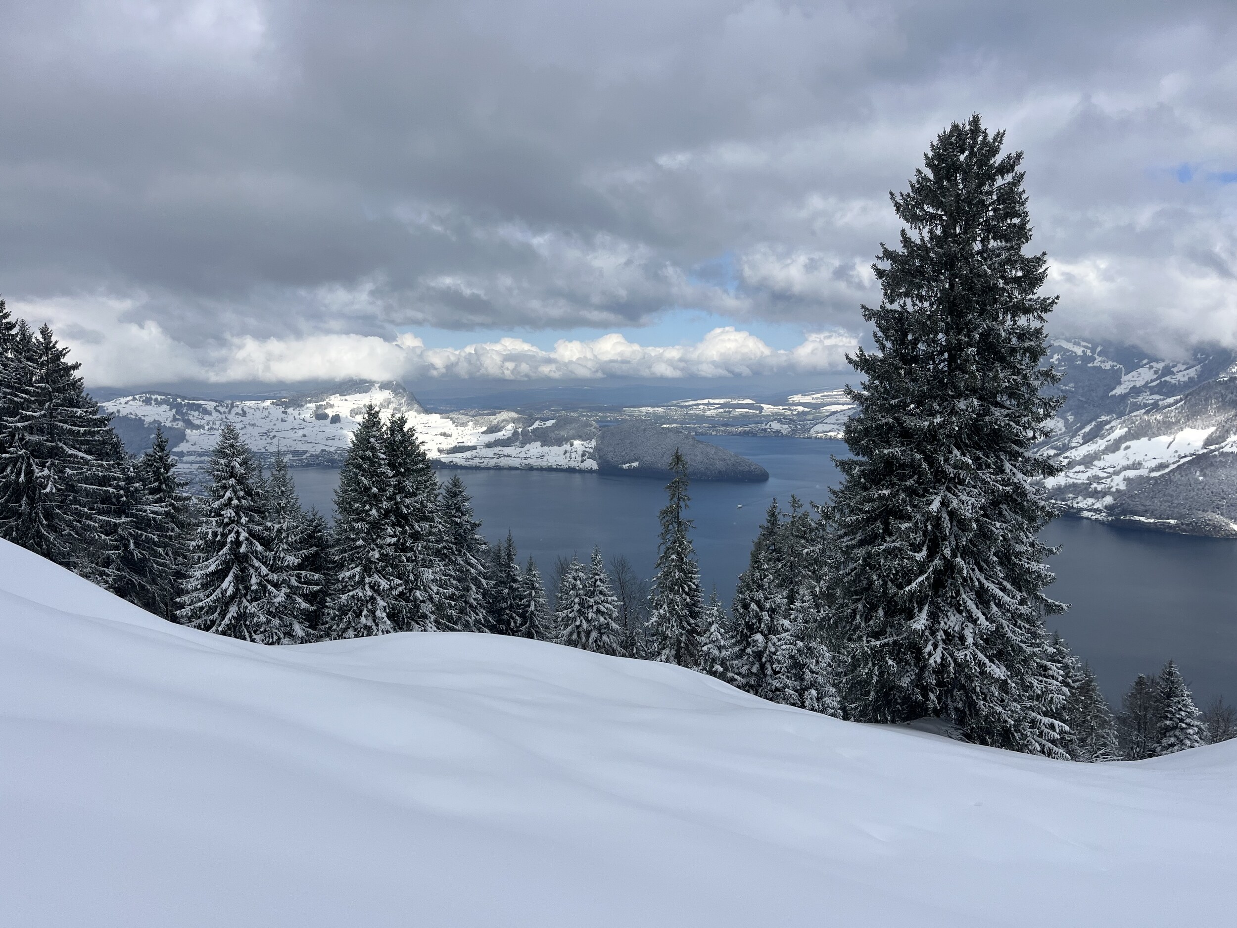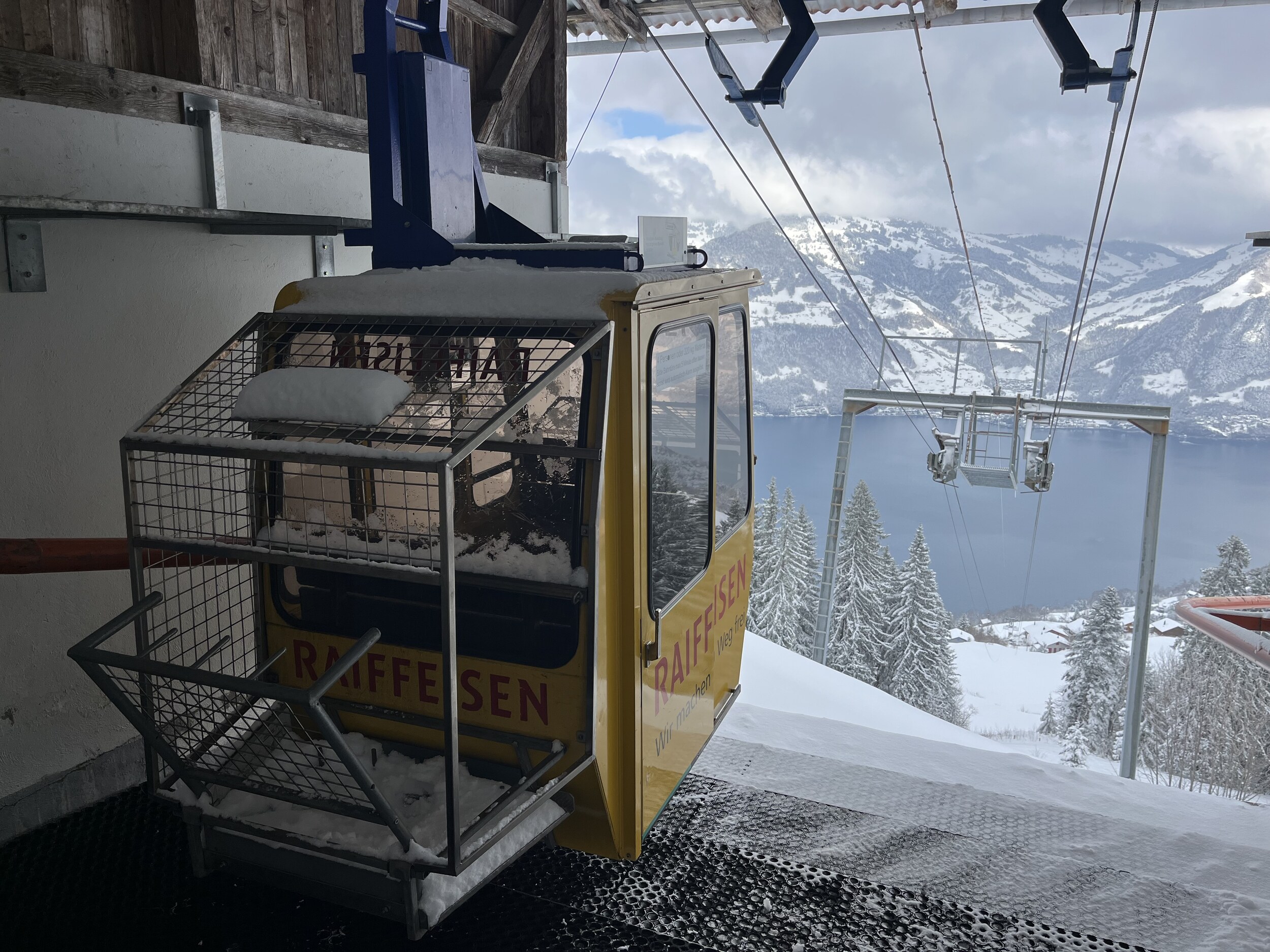 Oben angekommen, staune ich ob dem winterlichen Anblick. Ist das tatsächlich der letzte Betriebstag der Saison? Einzig die geschlossene Verbindung zur Stockhütte hat heute etwas gezeigt, dass das Saisonende naht. Es hatte nicht sehr viele Leute und wir mussten nie länger anstehen und haben den Tag auch kulinarisch genossen. und am Nachmittag war dann auch freie Sicht auf den See, auf dem wir heute so gediegen angereist sind. Das war der letzte Skitag hier heute, und die Pisten werden eingepackt. Vielleicht gibt es nächstes Jahr mit dem Magic Pass eine längere Saison?