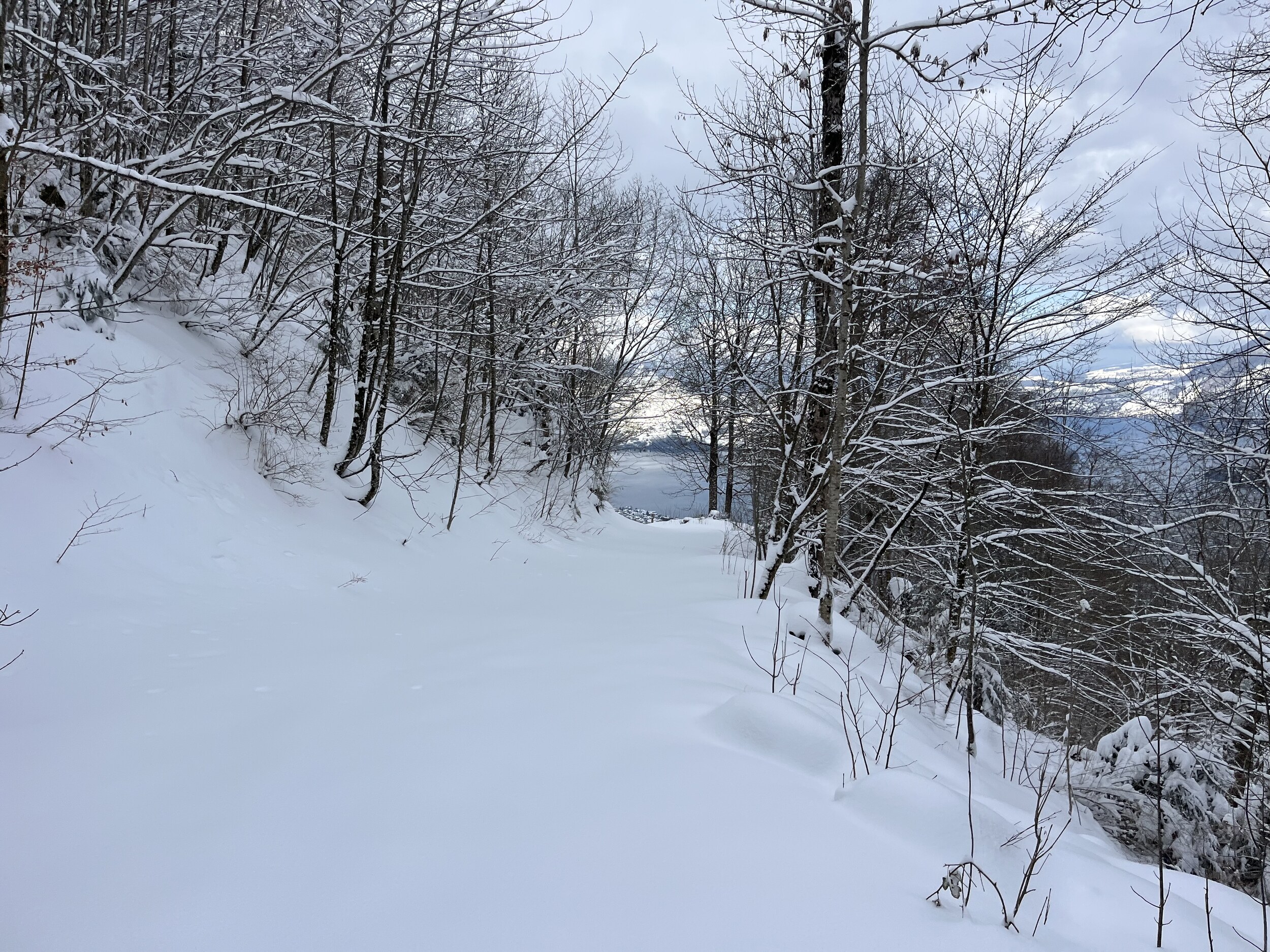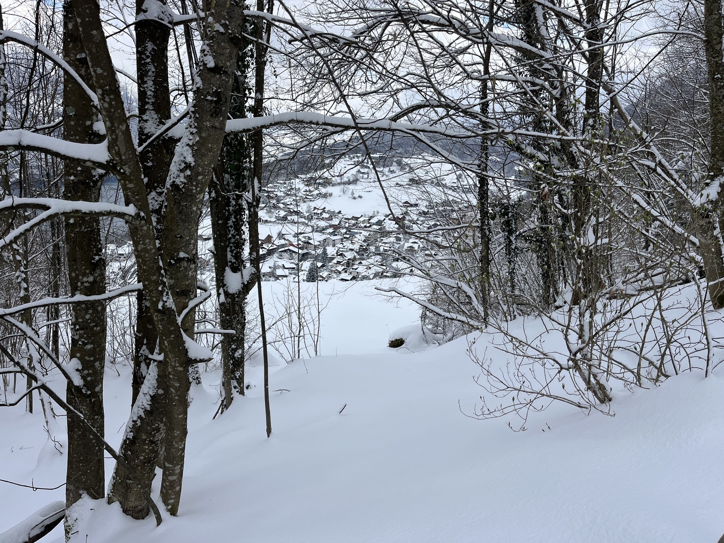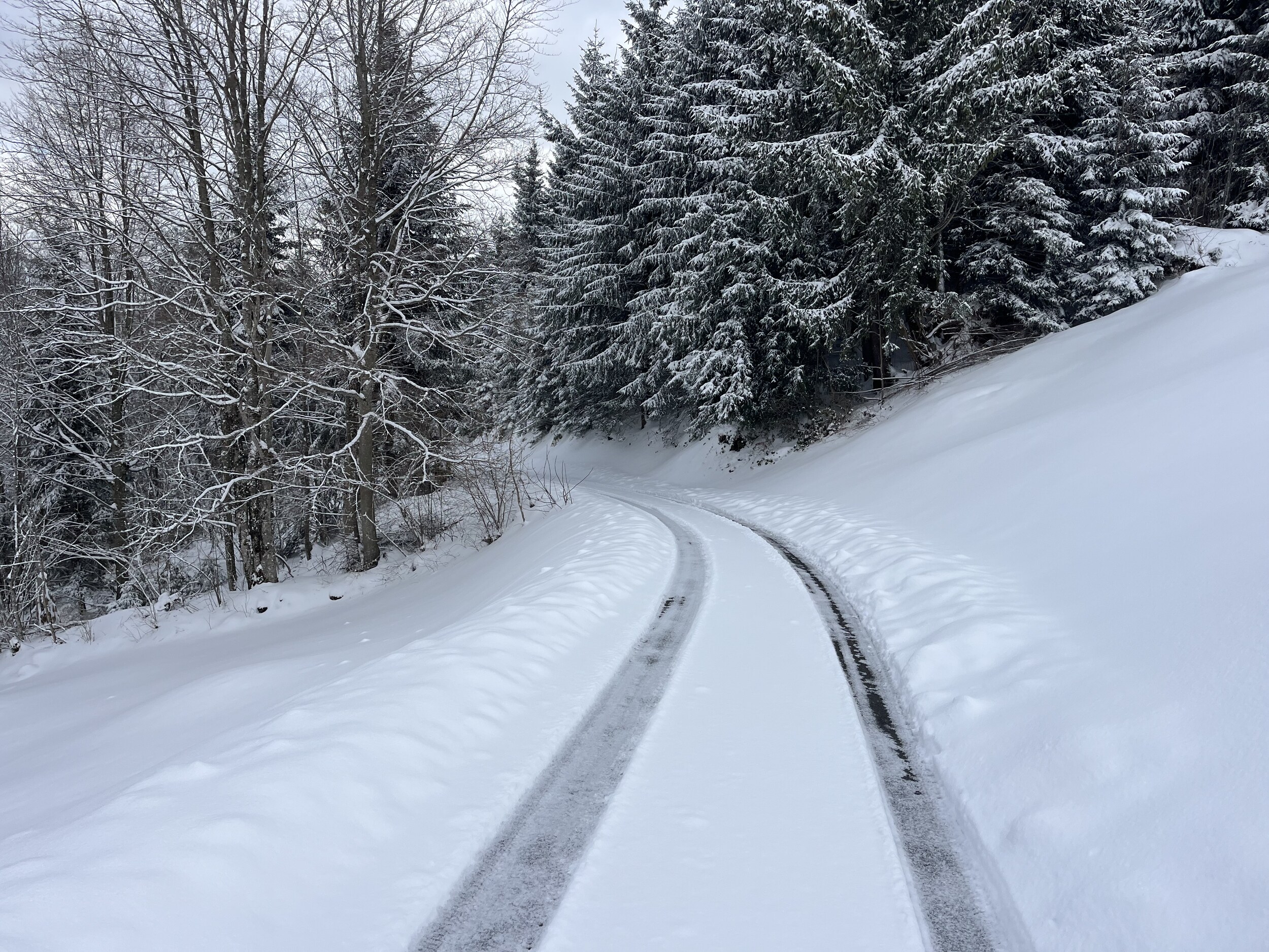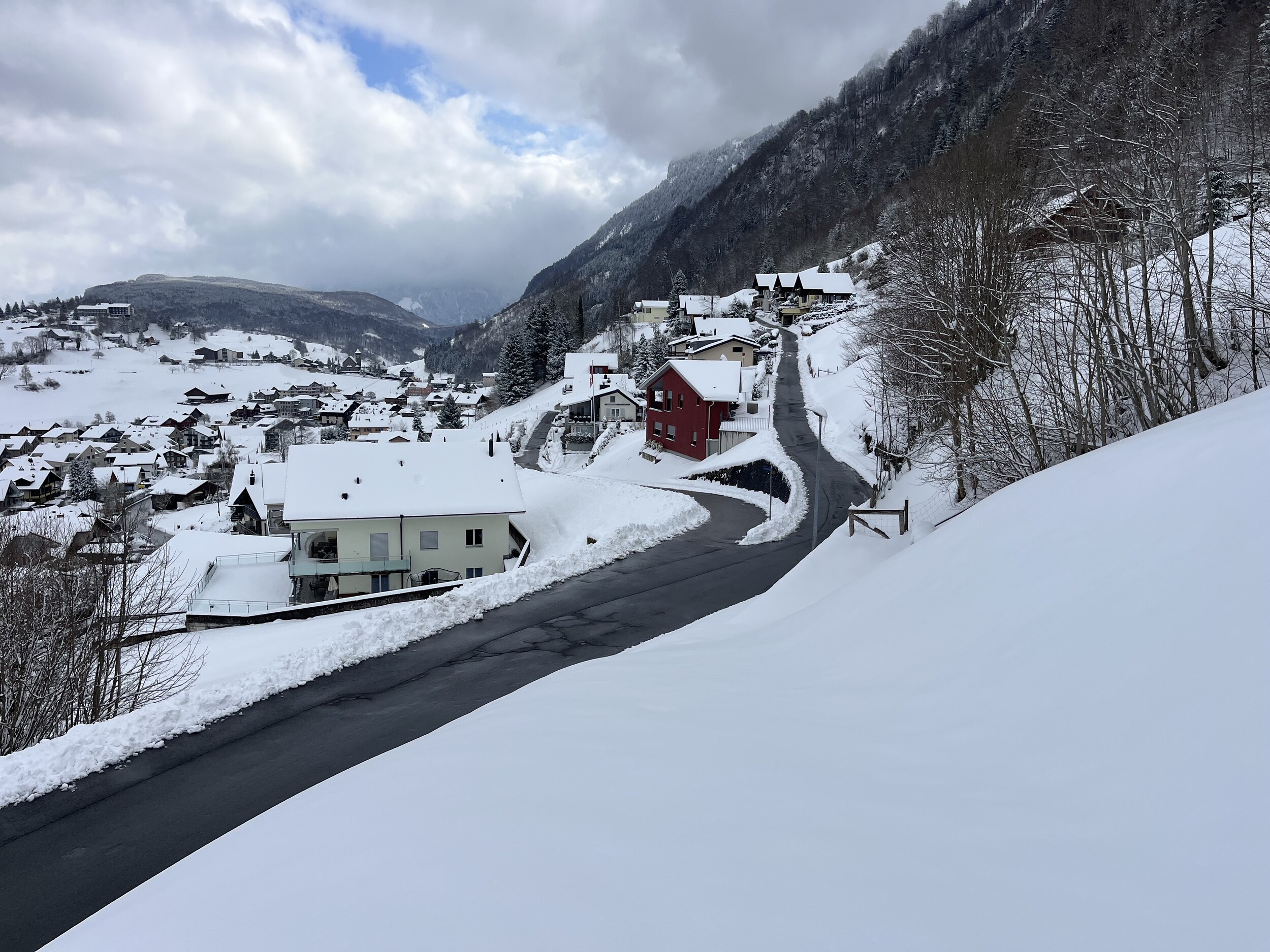 Um 9.58 Uhr schnalle ich an: Es liegt viel Schnee: Man kann kaum Kurven machen mit meinen kurzen Slalomskis: Mittlerweile könnte man die Waldibahn per Internet (15.-) bezahlen. Aber ich habe noch einen Jeton (damals 22.-) zuhause rumliegen. Geht viel schneller. Die Fahrt über unser Haus… dauert nur 6min: Oben angekommen: Ui, sehr viel Schnee. Schon nur die paar Meter bis zur Abfahrt sind kräfteraubend: Somit geht es heute die Waldschneise runter. Bei wenig Schnee geht die nicht gut. Wunderbar! Wegen des vielen Schnees nehme ich den Wanderweg. Der hat eine gleichmässigere Neigung -> weniger Schieben: Die Strasse wurde gestern geräumt, heute nicht. Ideal, geht auf dem Mittelstreifen flott vorwärts. Walddurchstich: Der schönste Teil: Herrlich! Nach lediglich 30min wieder unten: Superschön!