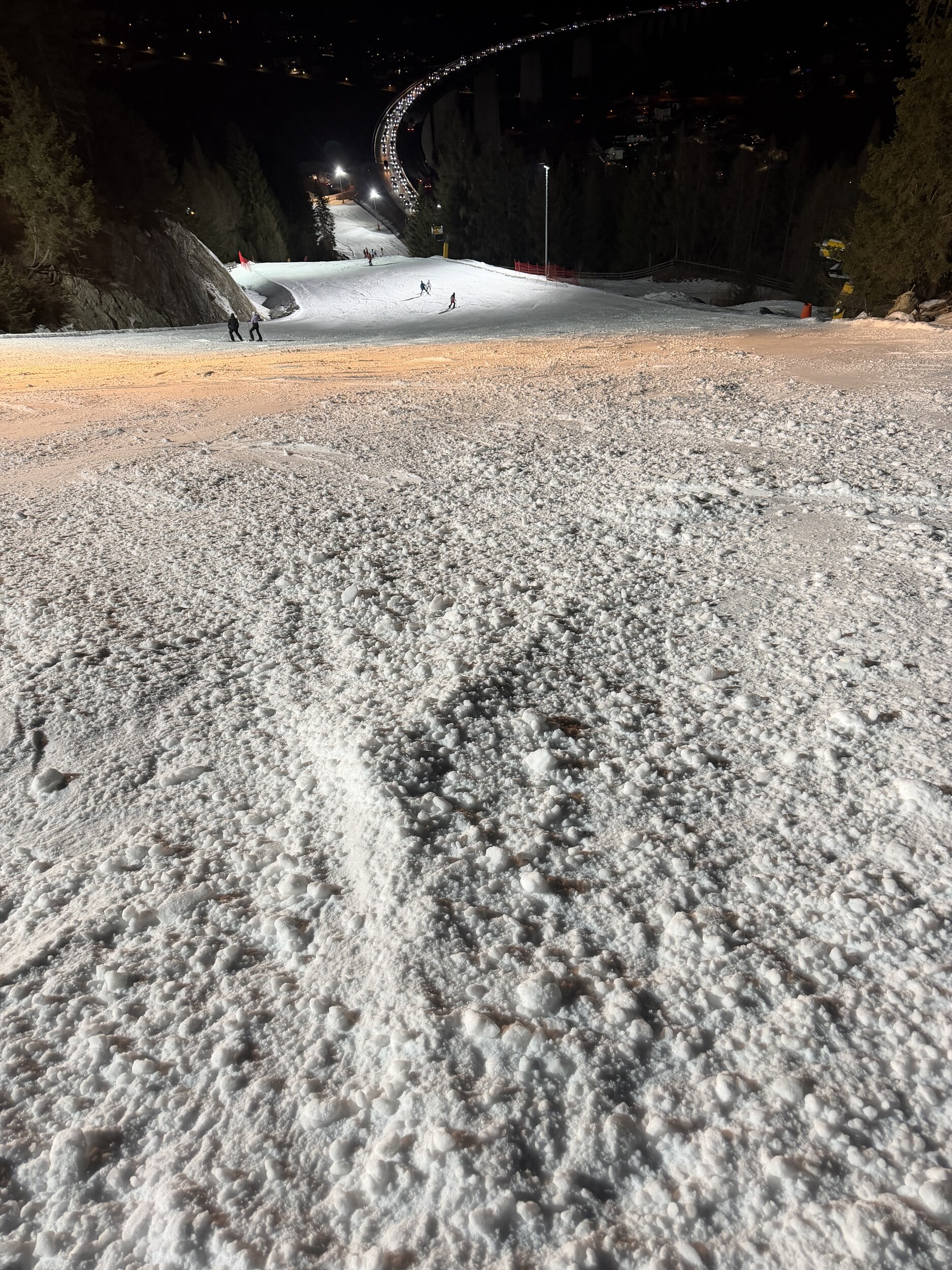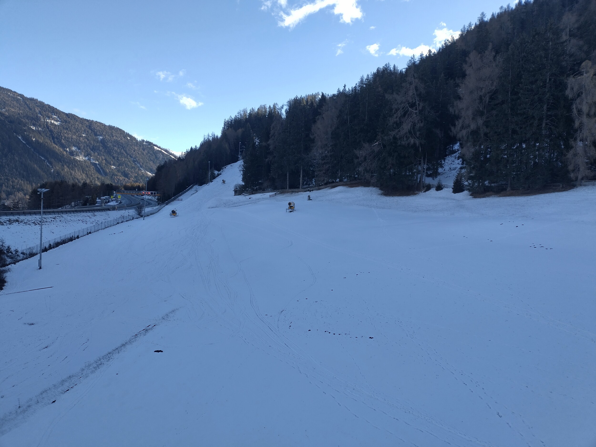Inzwischen sind auch 2 der 3 Talabfahrtsvarianten geöffnet, die dritte hat ein paar Kunstschneehaufen.