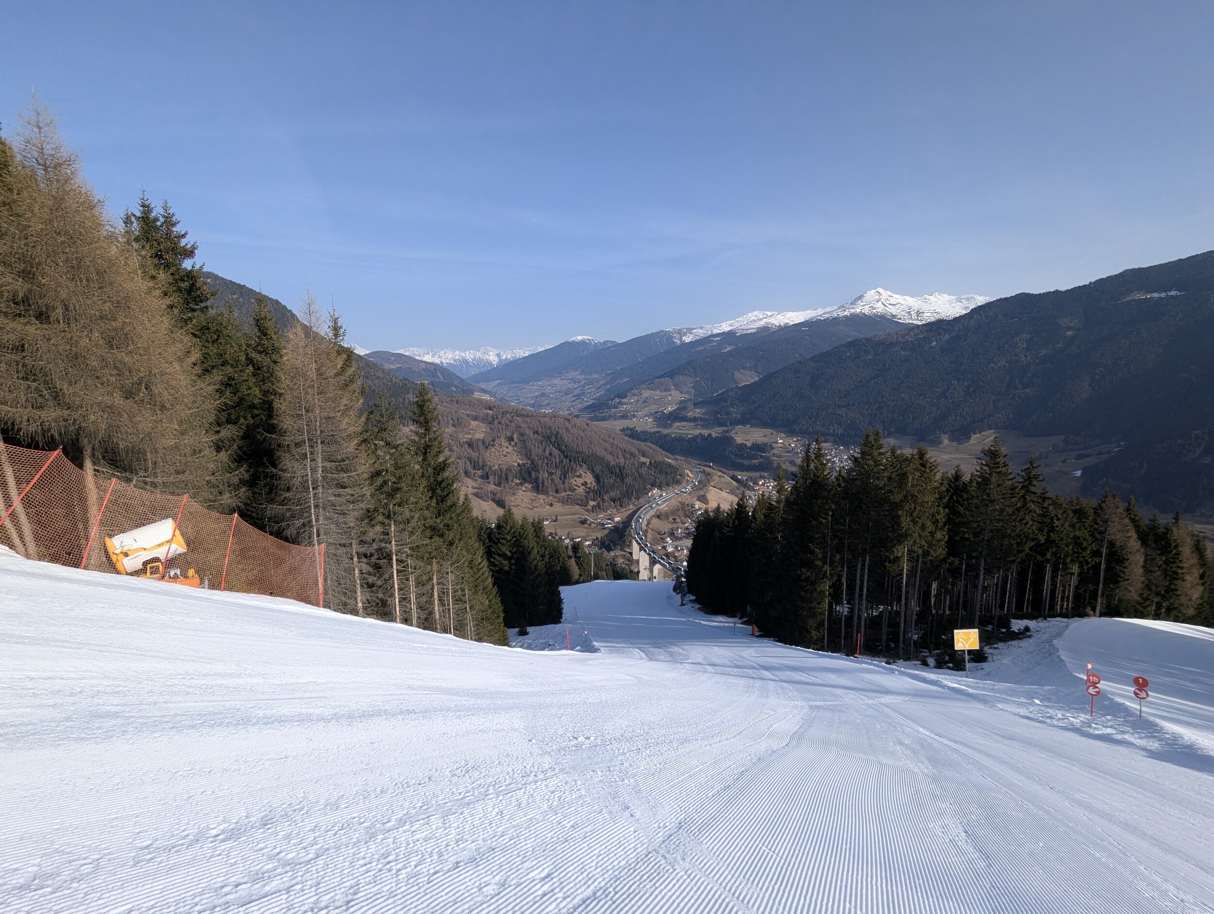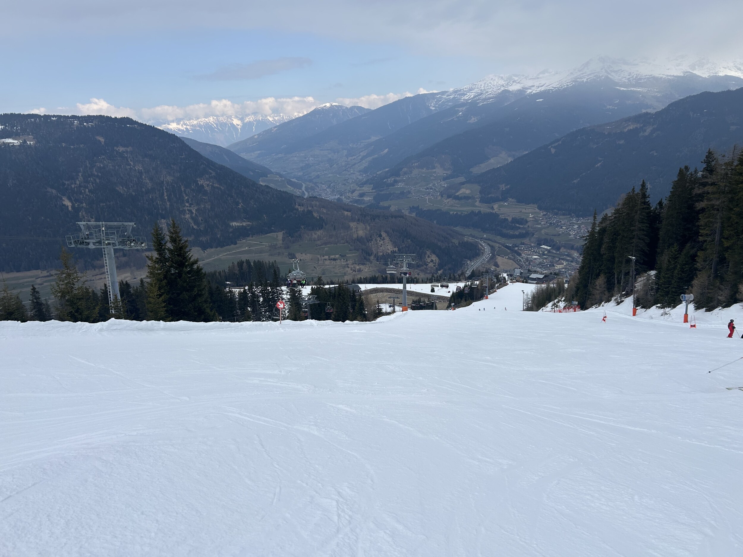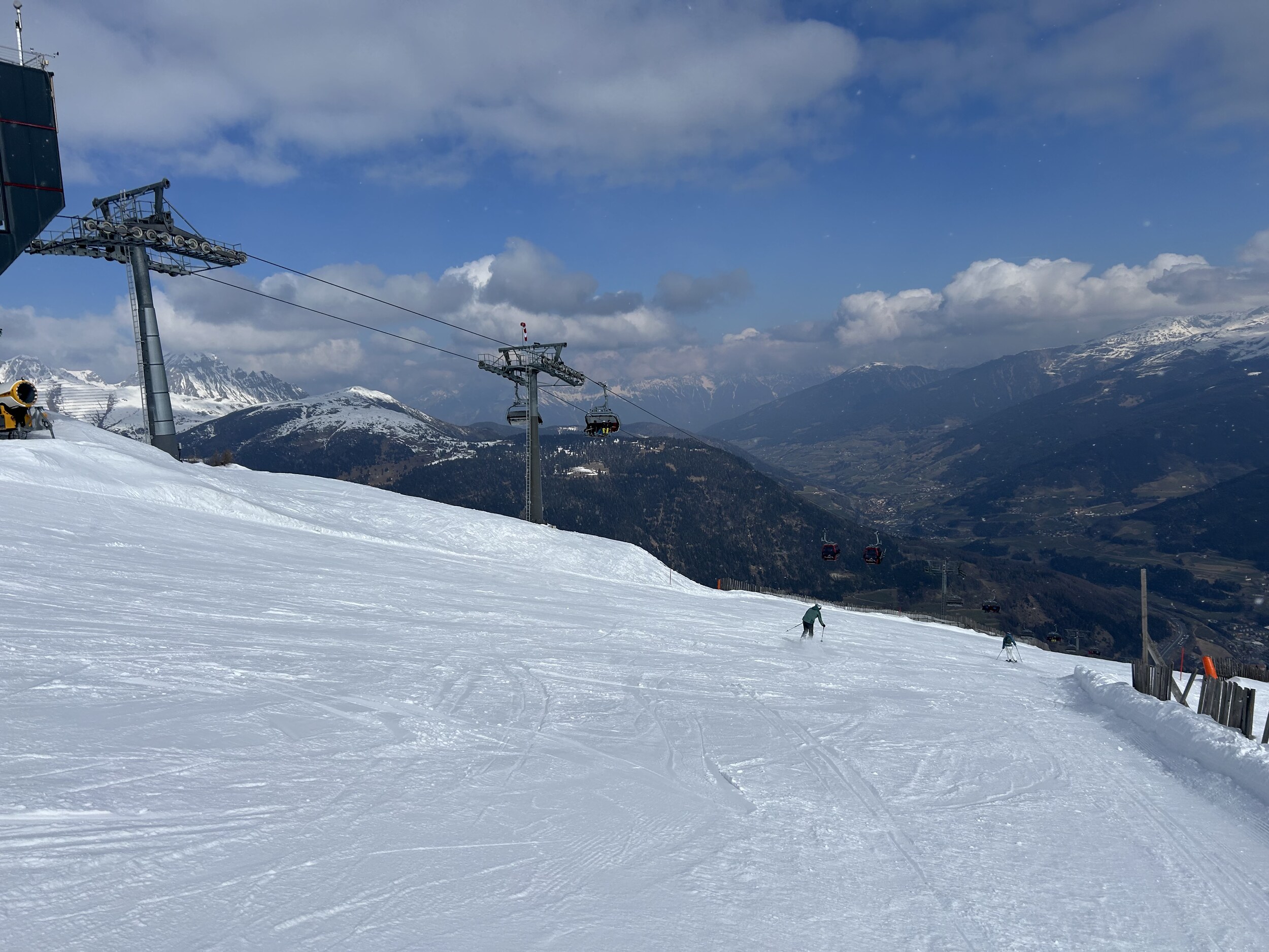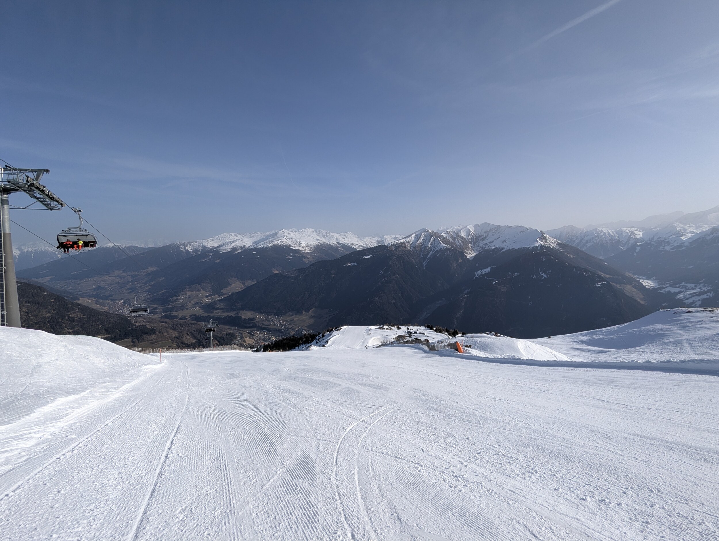 Mittlerweile überraschend voll, nichts mit Privatgebiet, viele Einheimische aber auch einige Externe. An der Kombi bzw heute Sesselbahn durchaus 5 Sessel warten. Pisten grundsätzlich wie hier gewohnt alle gut präpariert, oben härter, unten weicher. Blick gen Brenner: Manni Pranger Piste: Bereich Mittelstation: Auf der äußeren Variante oben: Bekommt mit dem neuen Speicherteich oben dann eigentlich der Hochsonnlift Beschneiung?