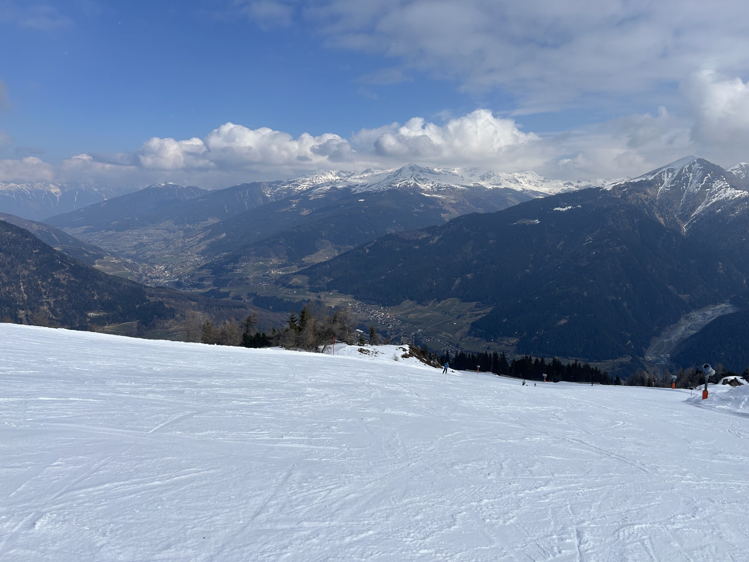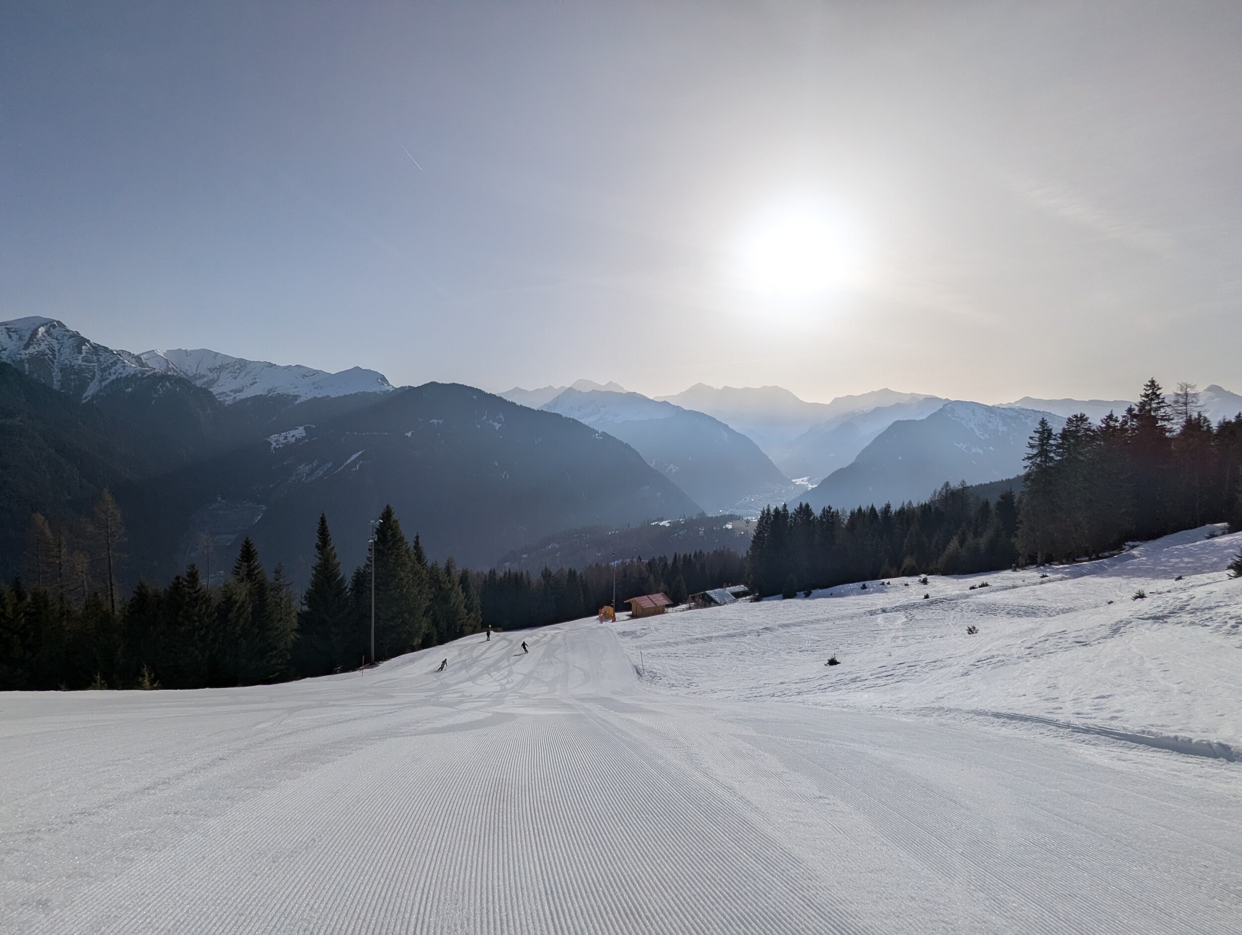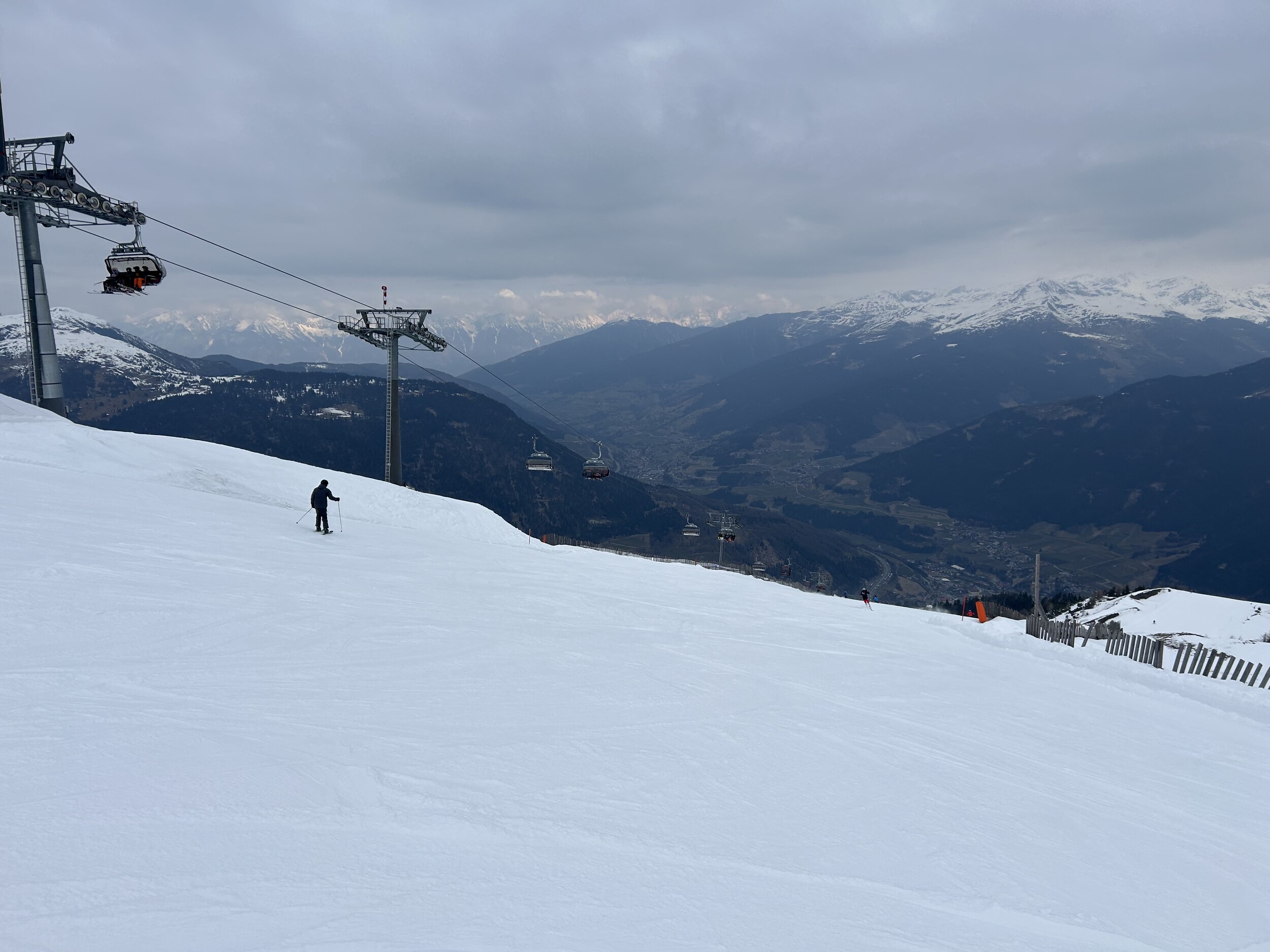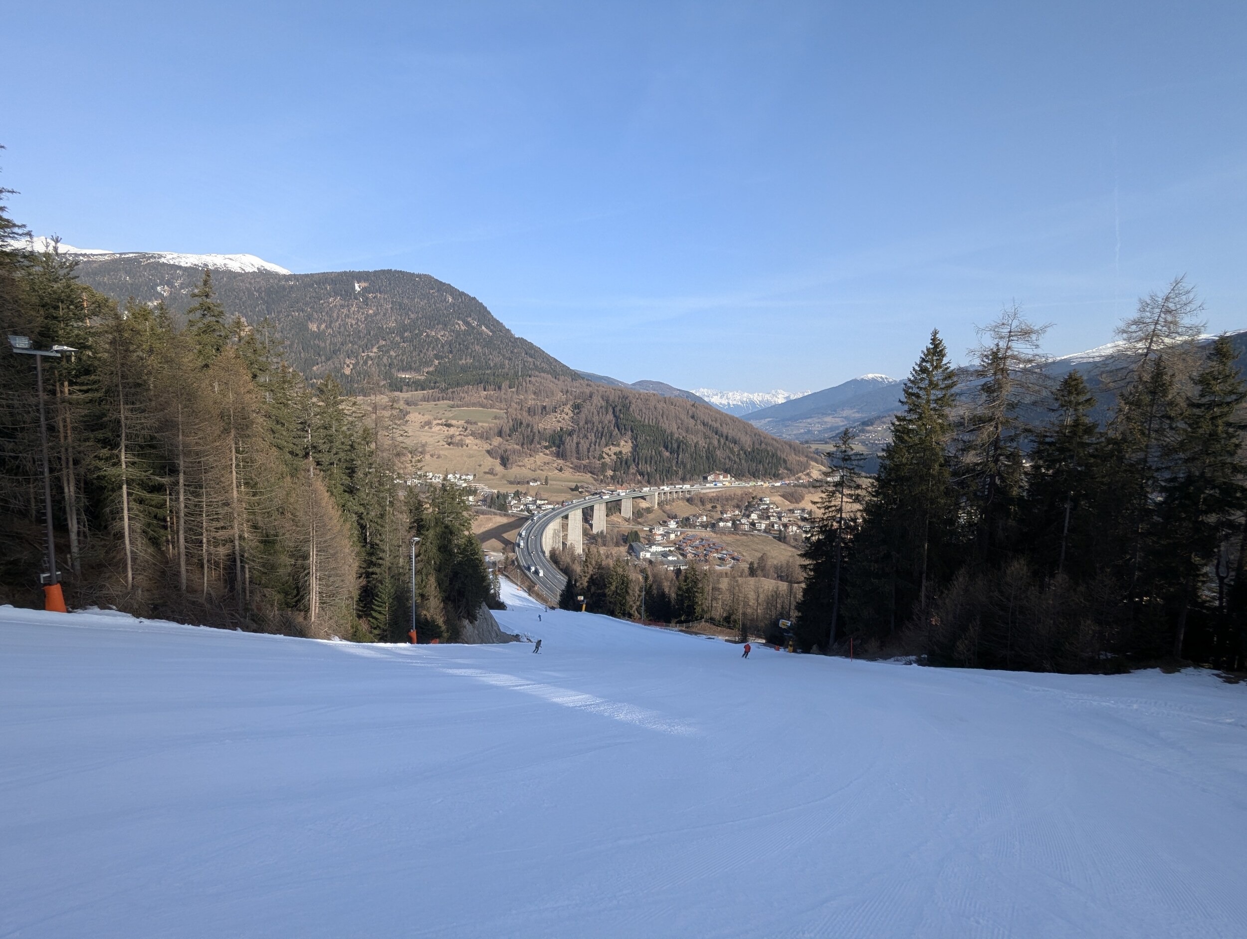 Mittlerweile überraschend voll, nichts mit Privatgebiet, viele Einheimische aber auch einige Externe. An der Kombi bzw heute Sesselbahn durchaus 5 Sessel warten. Pisten grundsätzlich wie hier gewohnt alle gut präpariert, oben härter, unten weicher. Blick gen Brenner: Manni Pranger Piste: Bereich Mittelstation: Auf der äußeren Variante oben: Bekommt mit dem neuen Speicherteich oben dann eigentlich der Hochsonnlift Beschneiung?