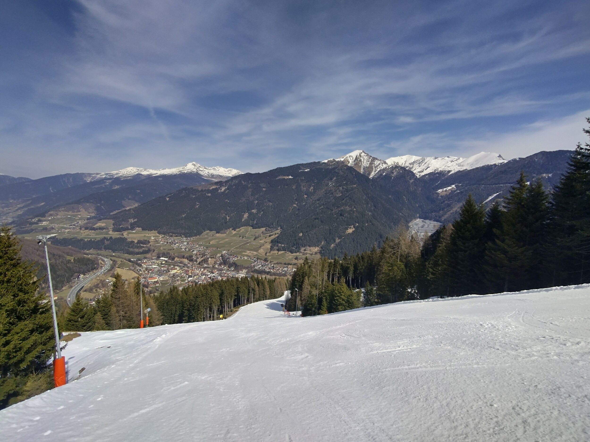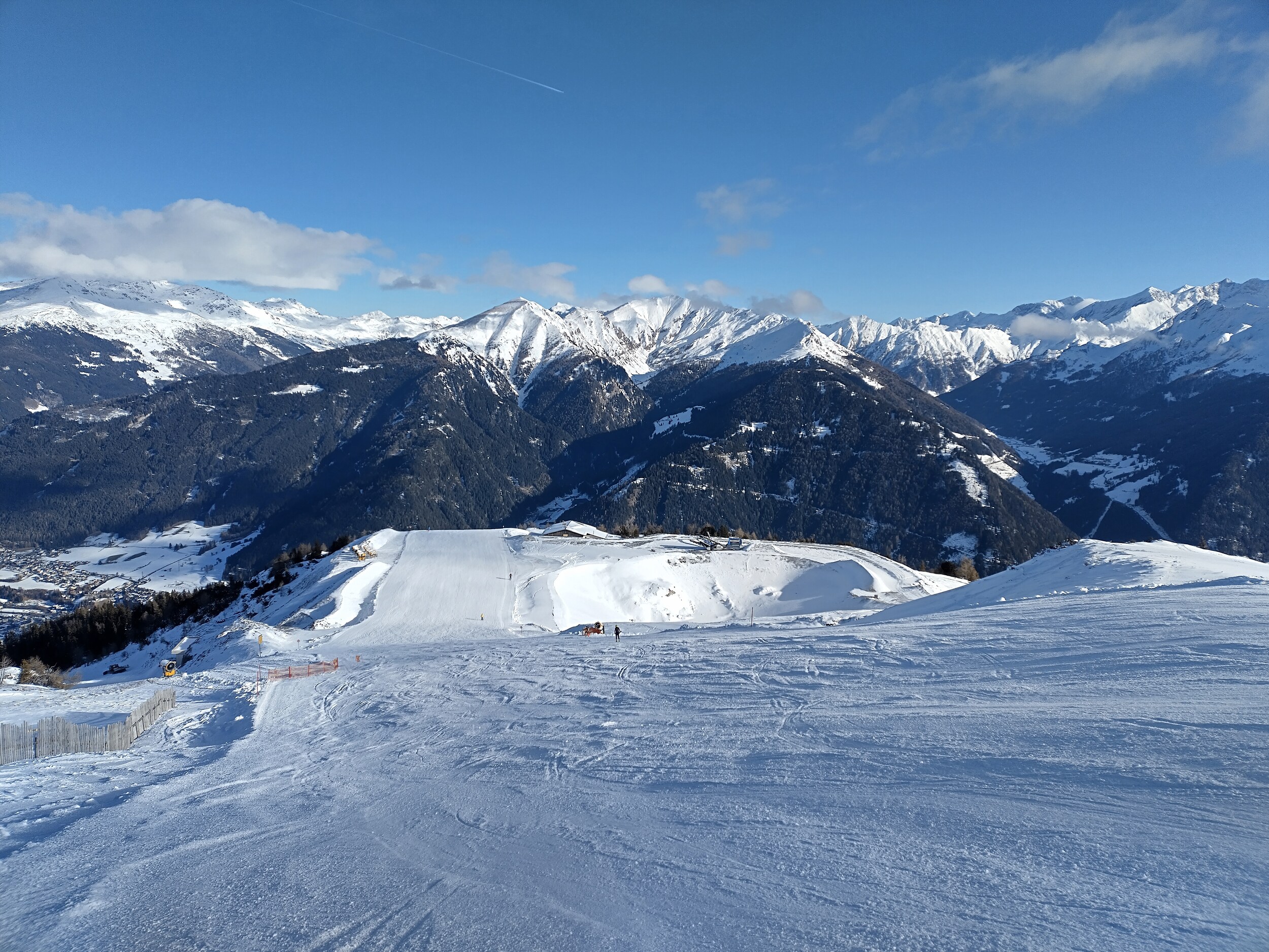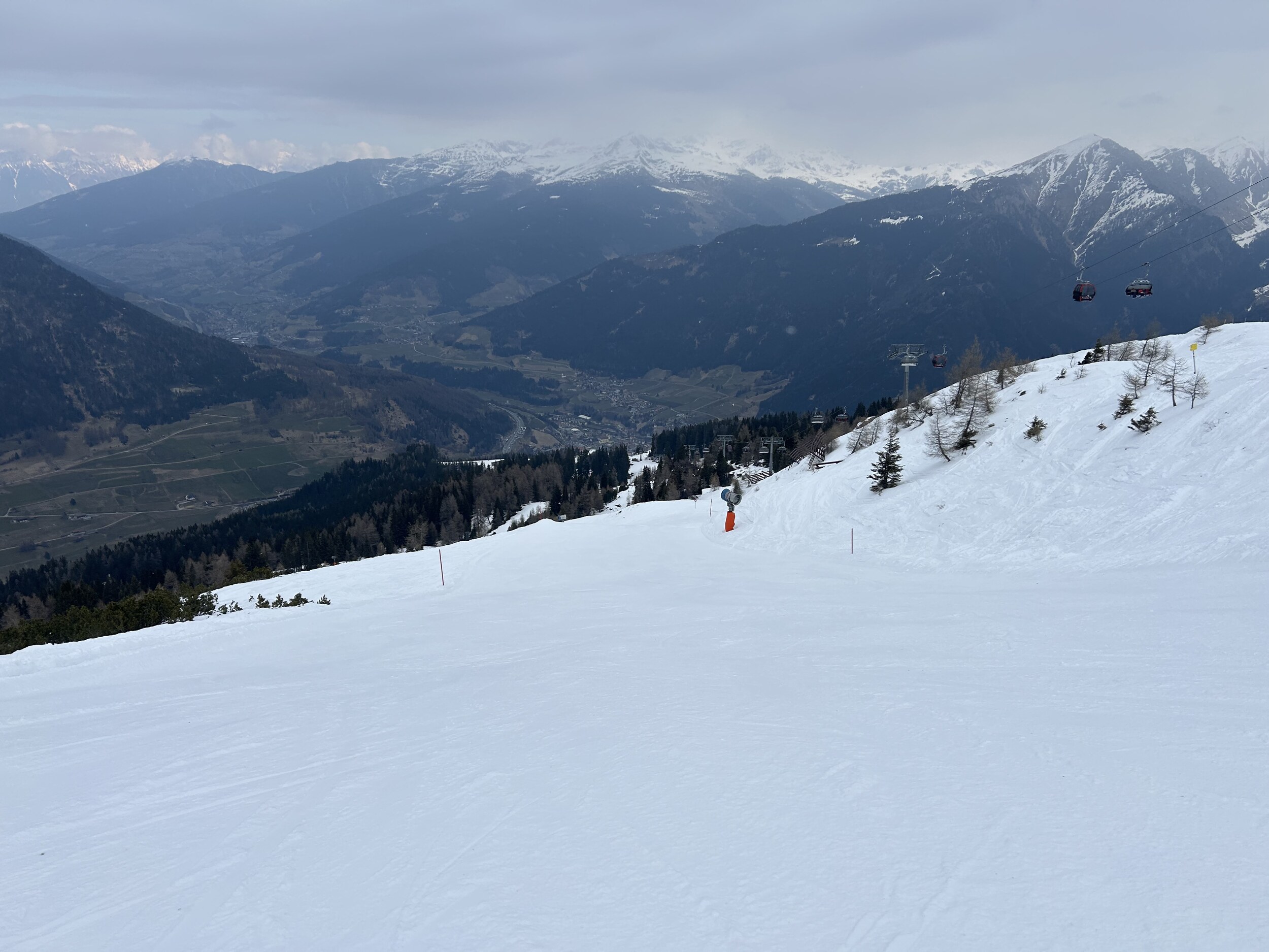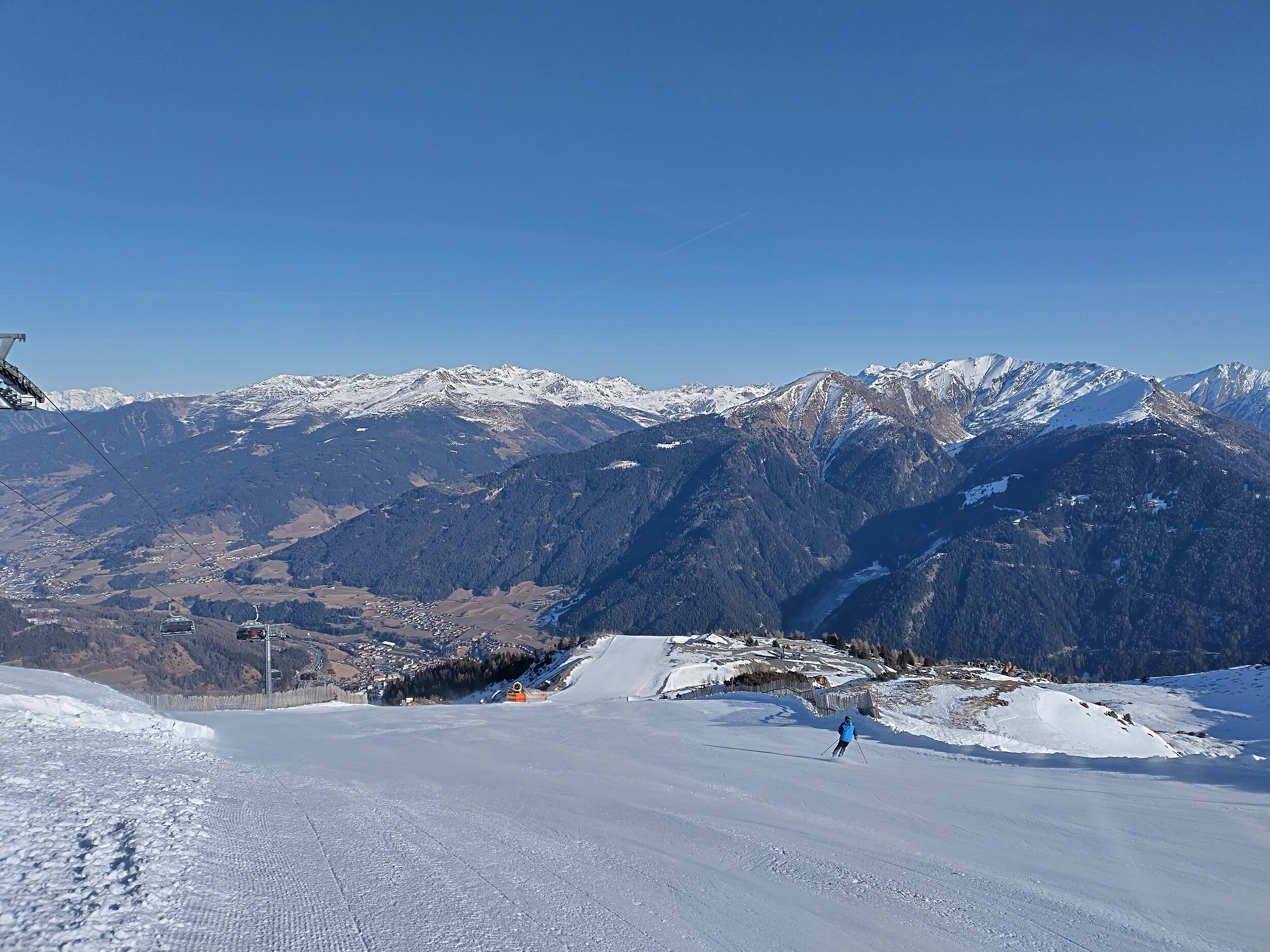 Mittlerweile überraschend voll, nichts mit Privatgebiet, viele Einheimische aber auch einige Externe. An der Kombi bzw heute Sesselbahn durchaus 5 Sessel warten. Pisten grundsätzlich wie hier gewohnt alle gut präpariert, oben härter, unten weicher. Blick gen Brenner: Manni Pranger Piste: Bereich Mittelstation: Auf der äußeren Variante oben: Bekommt mit dem neuen Speicherteich oben dann eigentlich der Hochsonnlift Beschneiung?