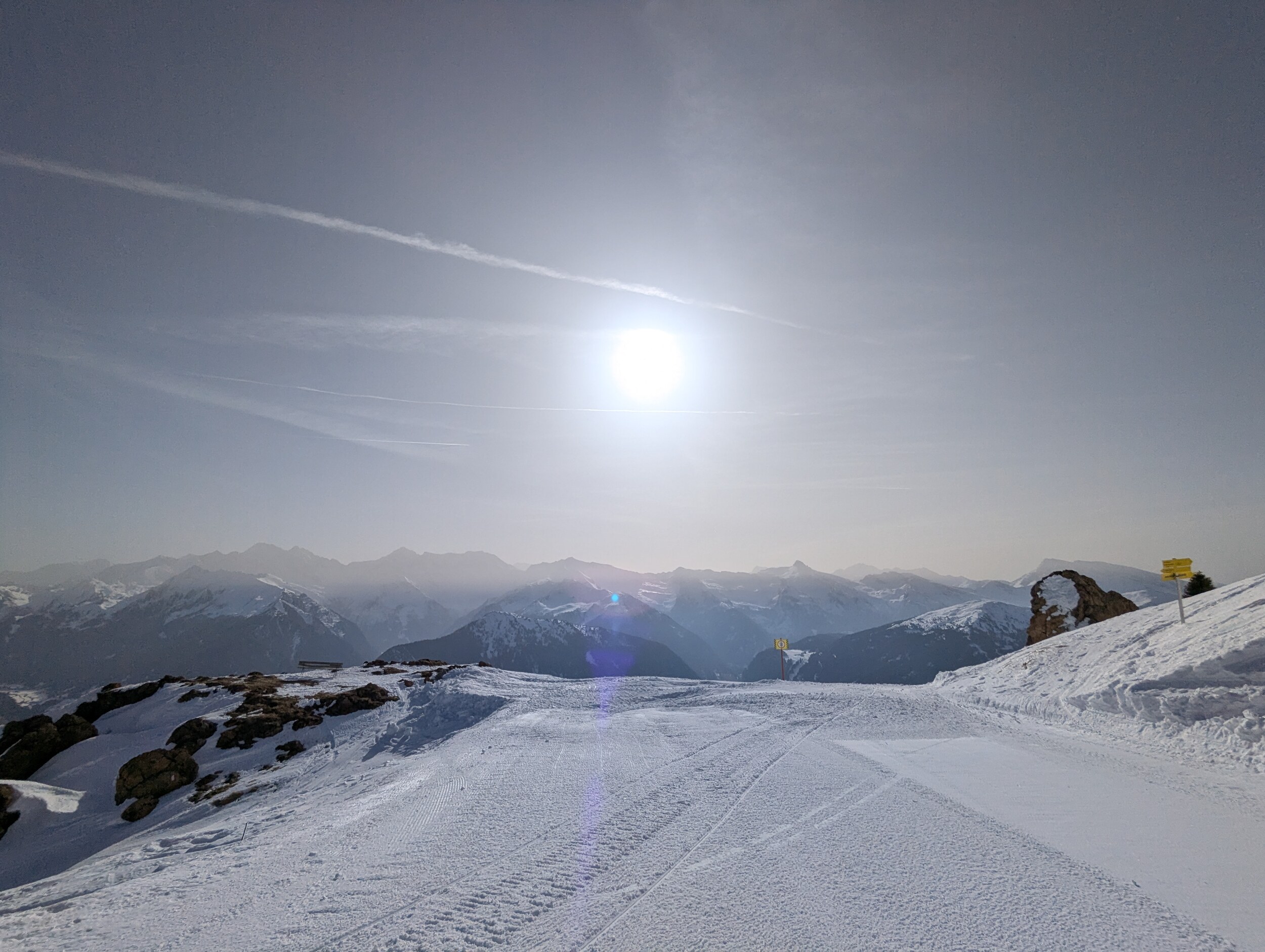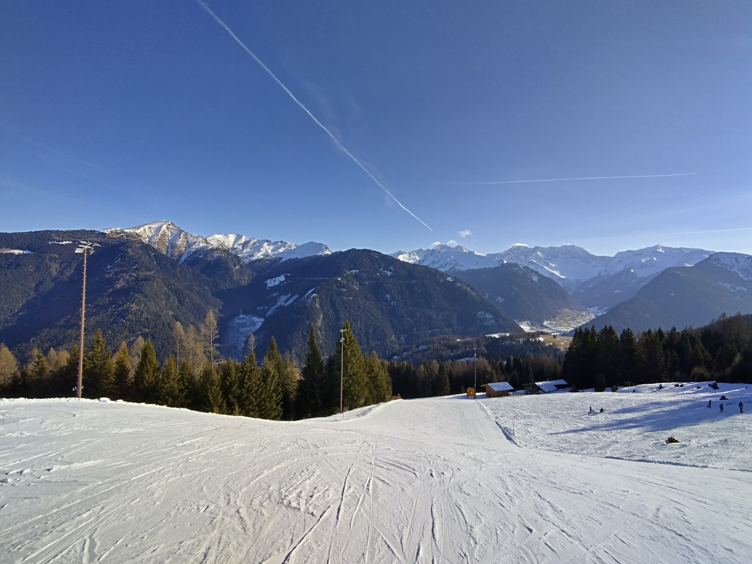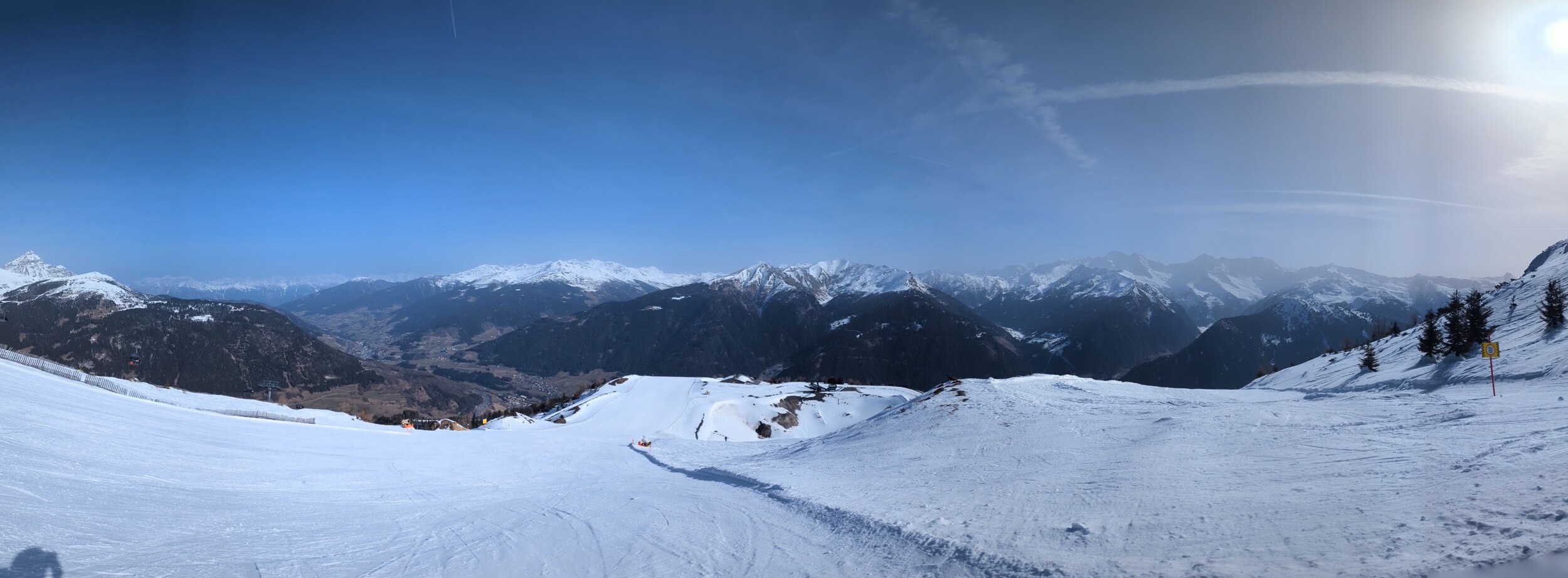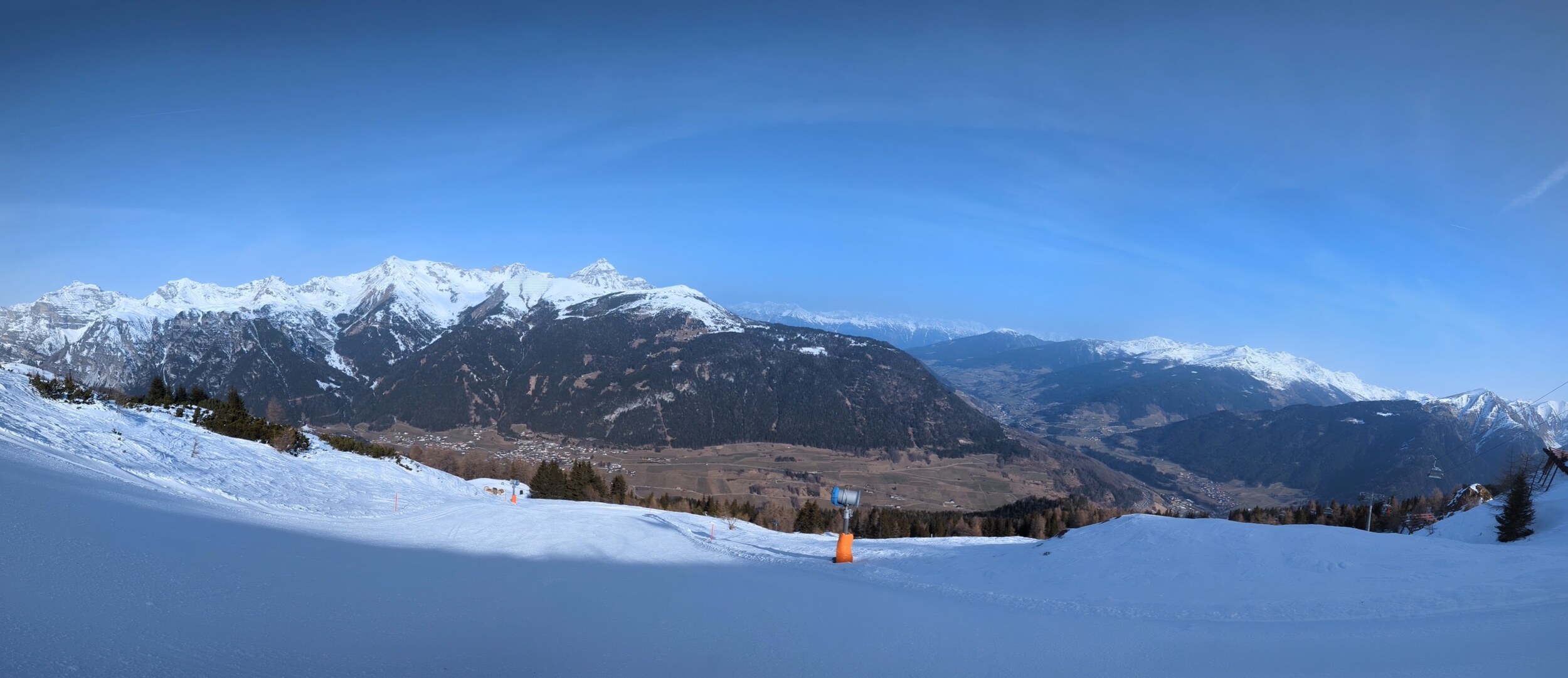 Mittlerweile überraschend voll, nichts mit Privatgebiet, viele Einheimische aber auch einige Externe. An der Kombi bzw heute Sesselbahn durchaus 5 Sessel warten. Pisten grundsätzlich wie hier gewohnt alle gut präpariert, oben härter, unten weicher. Blick gen Brenner: Manni Pranger Piste: Bereich Mittelstation: Auf der äußeren Variante oben: Bekommt mit dem neuen Speicherteich oben dann eigentlich der Hochsonnlift Beschneiung?