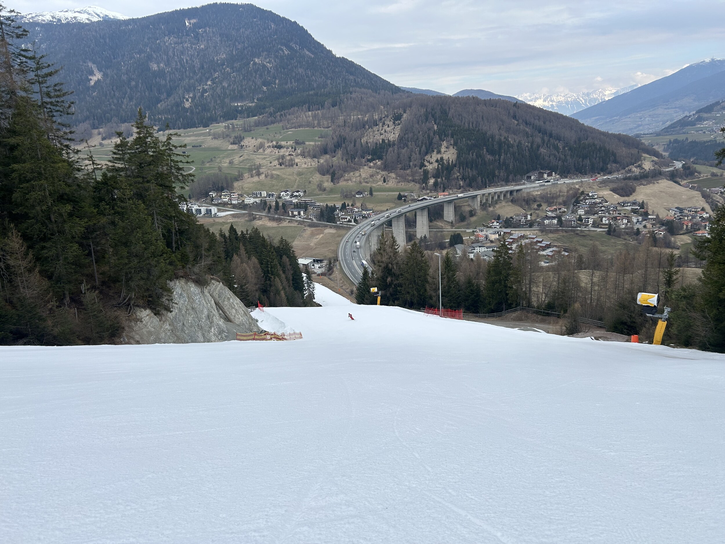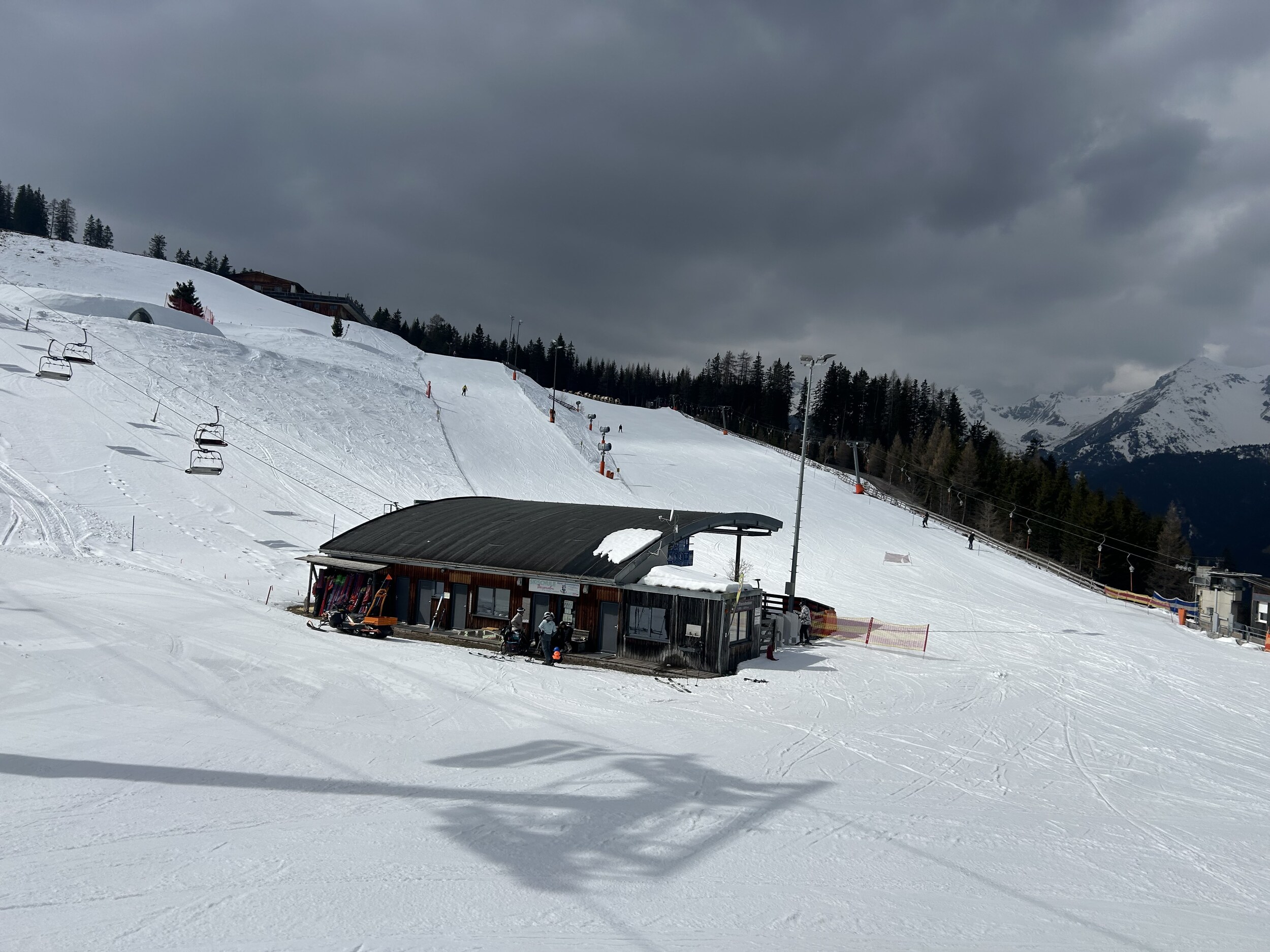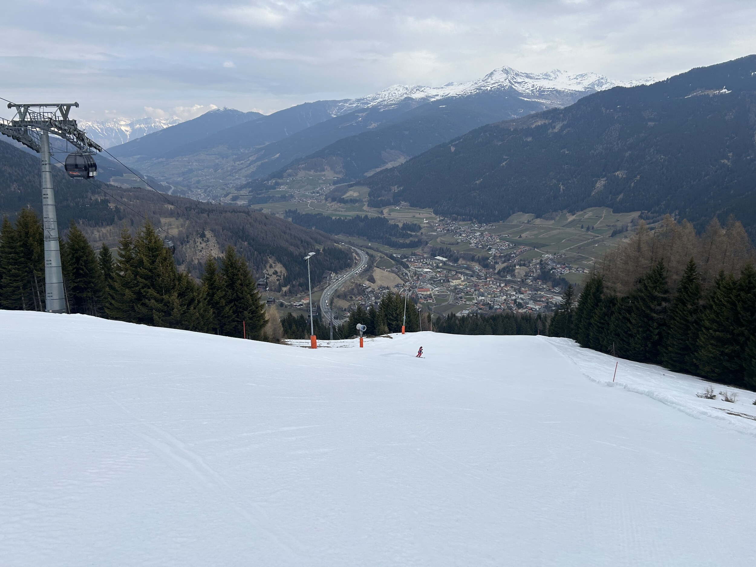 Tatsächlich unter der Europabrücke liegt aber die Talstation zum kleinen Skigebiet auf der Bergeralm. Eine Gondelbahn hoch zur Bergeralm, von dort als direkte Verlängerung ein längerer Sessellift und zwei kleinere Lifte - that's it, weil heute der Skilift ganz oben (Hochsonnlift) zu ist.